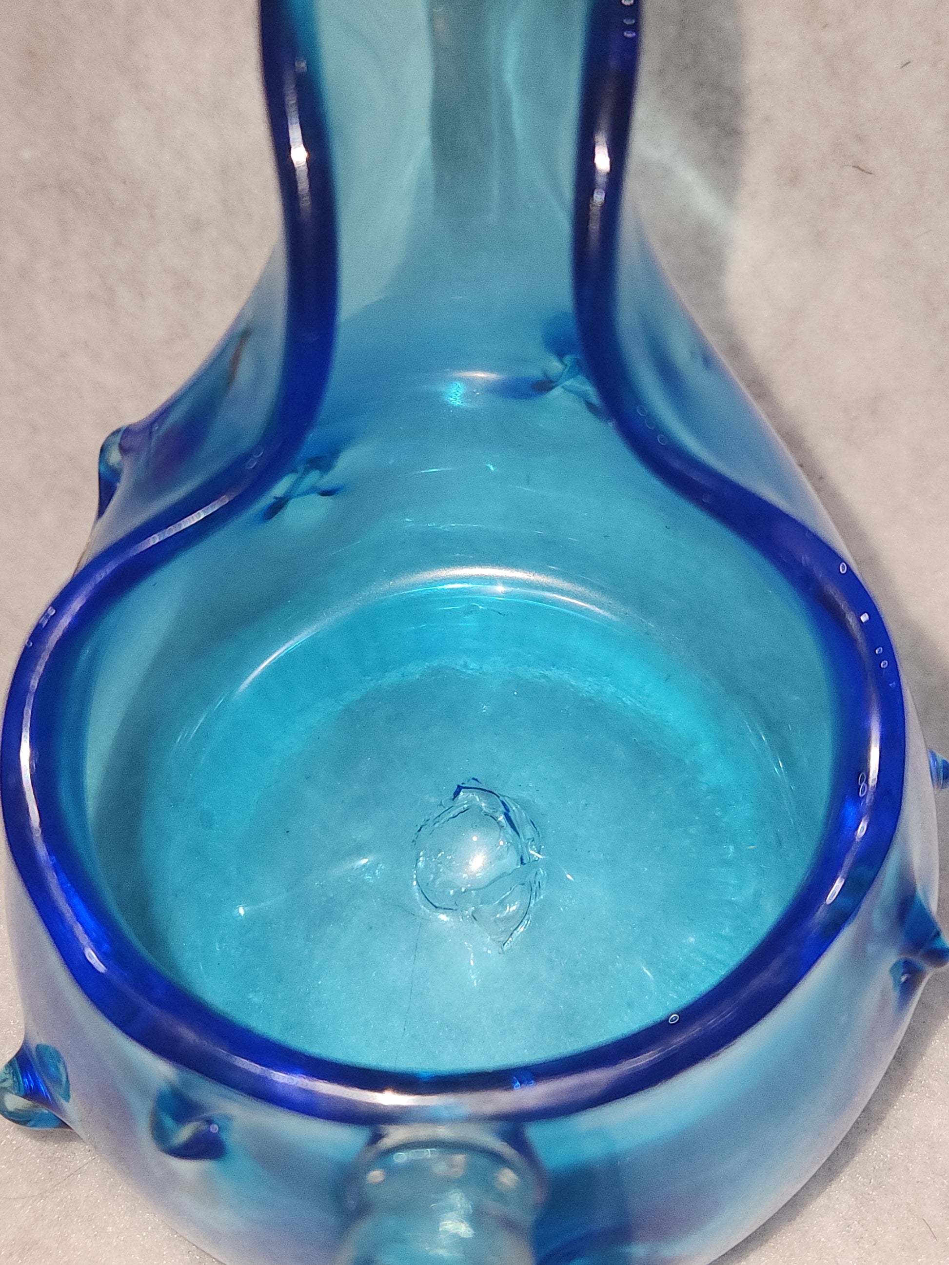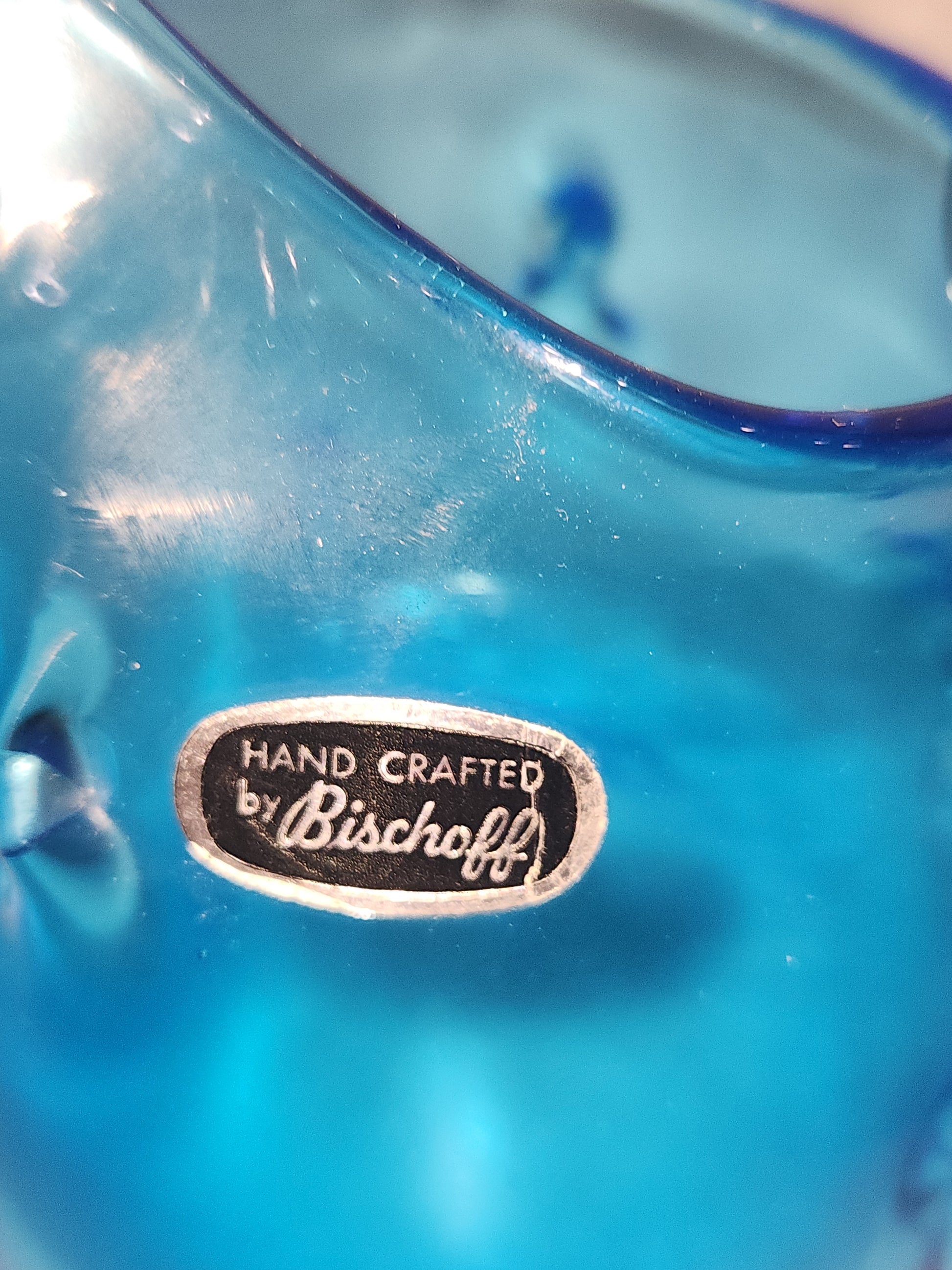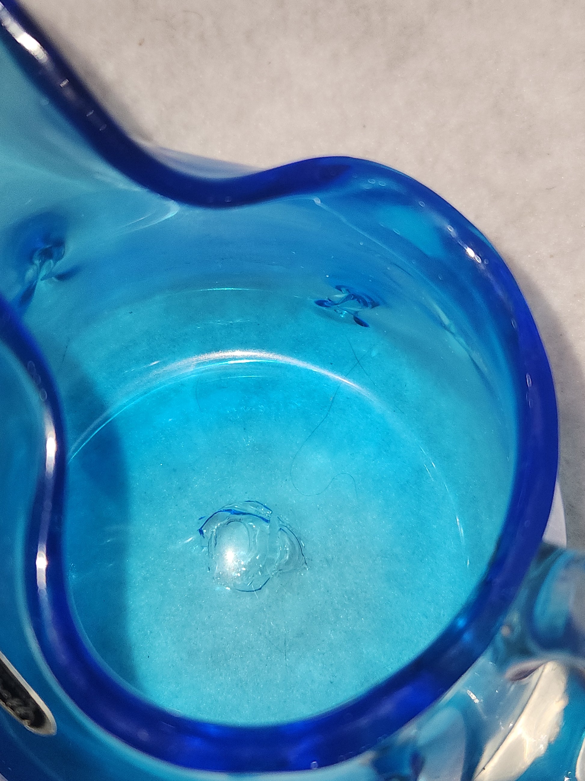 Vintage Bischoff hand blown Art Glass pinches Teal Blue Pitcher Clear handle gla999