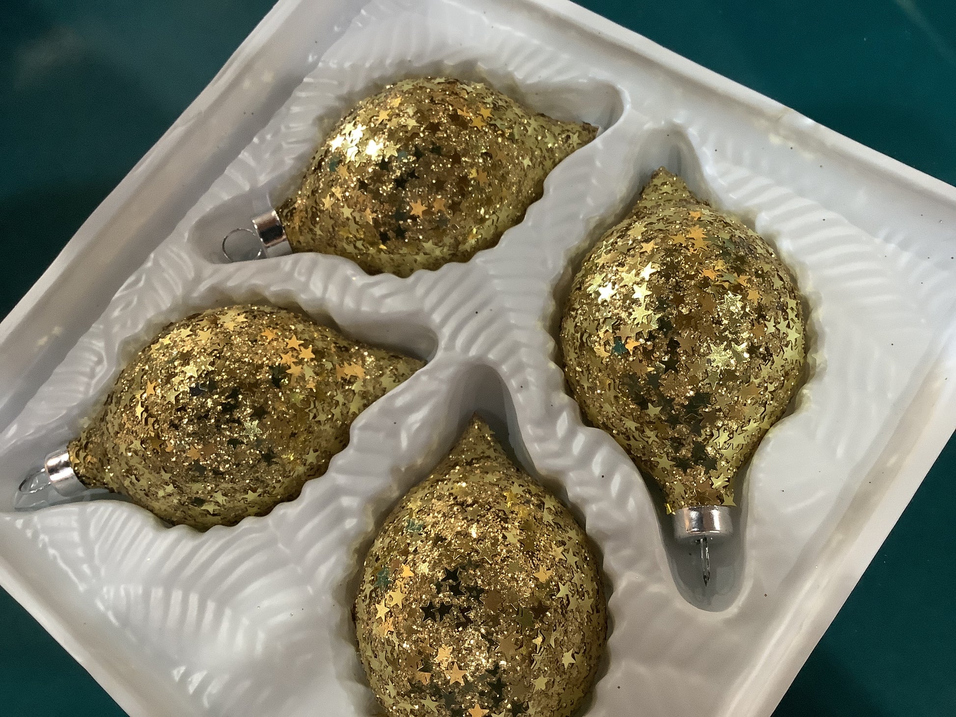 Deck the Halls imported Christmas ornaments made in Mexico Bradford novelty Company glass glass ornaments with a fine glitter and star sequins