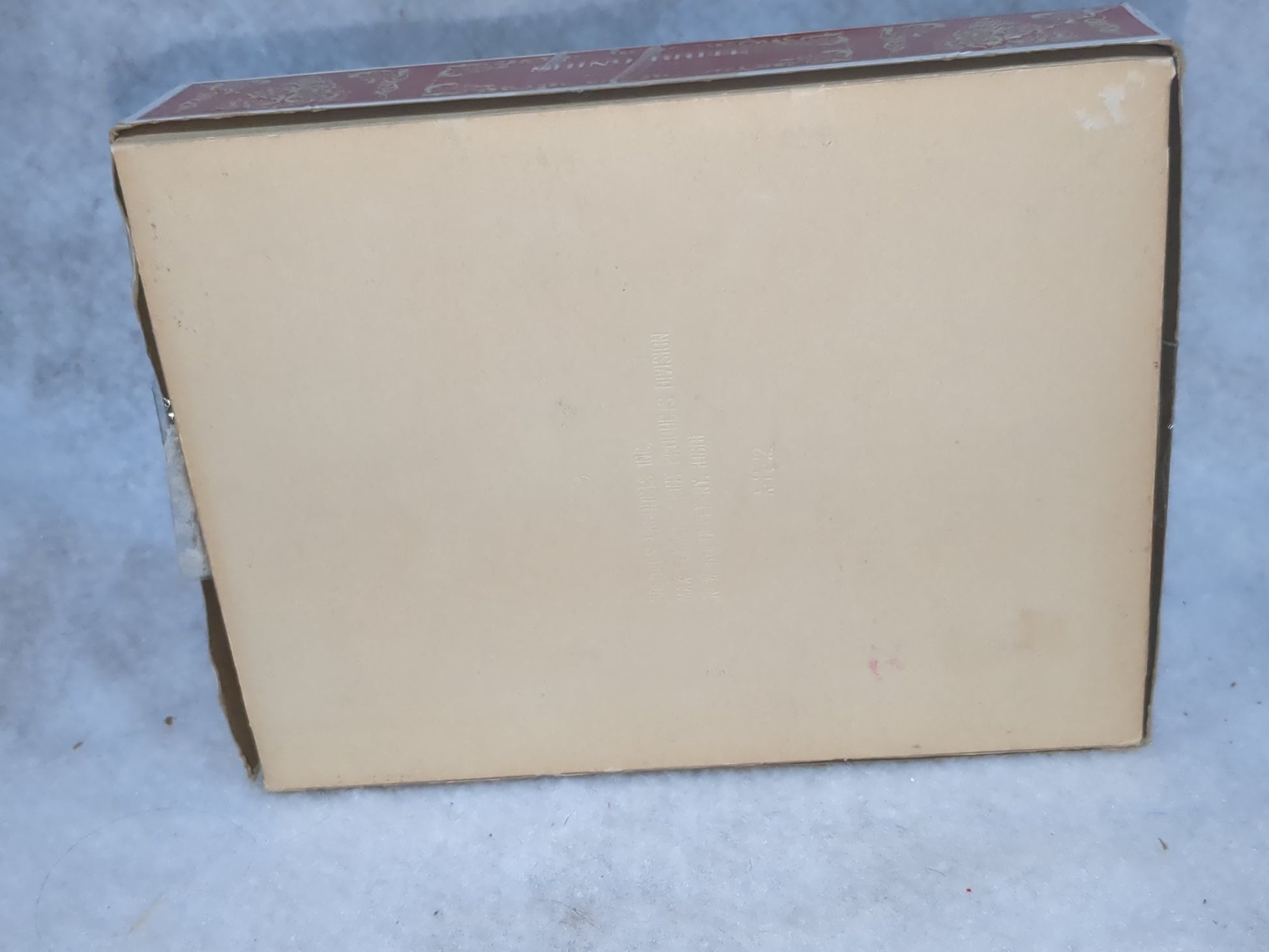 Box of silver shiny brights the box has been taped up across the film, probably becasue the film is ripped and absent in lower left corner. The ornaments look to be in good condition. Made by Max Eckardt and Sons but not dated. When buying vintage ornaments, you may be getting discoloration, paint loss, crazing and ruined boxes, please be aware of this before ordering. Please see photos as they part of the description.
