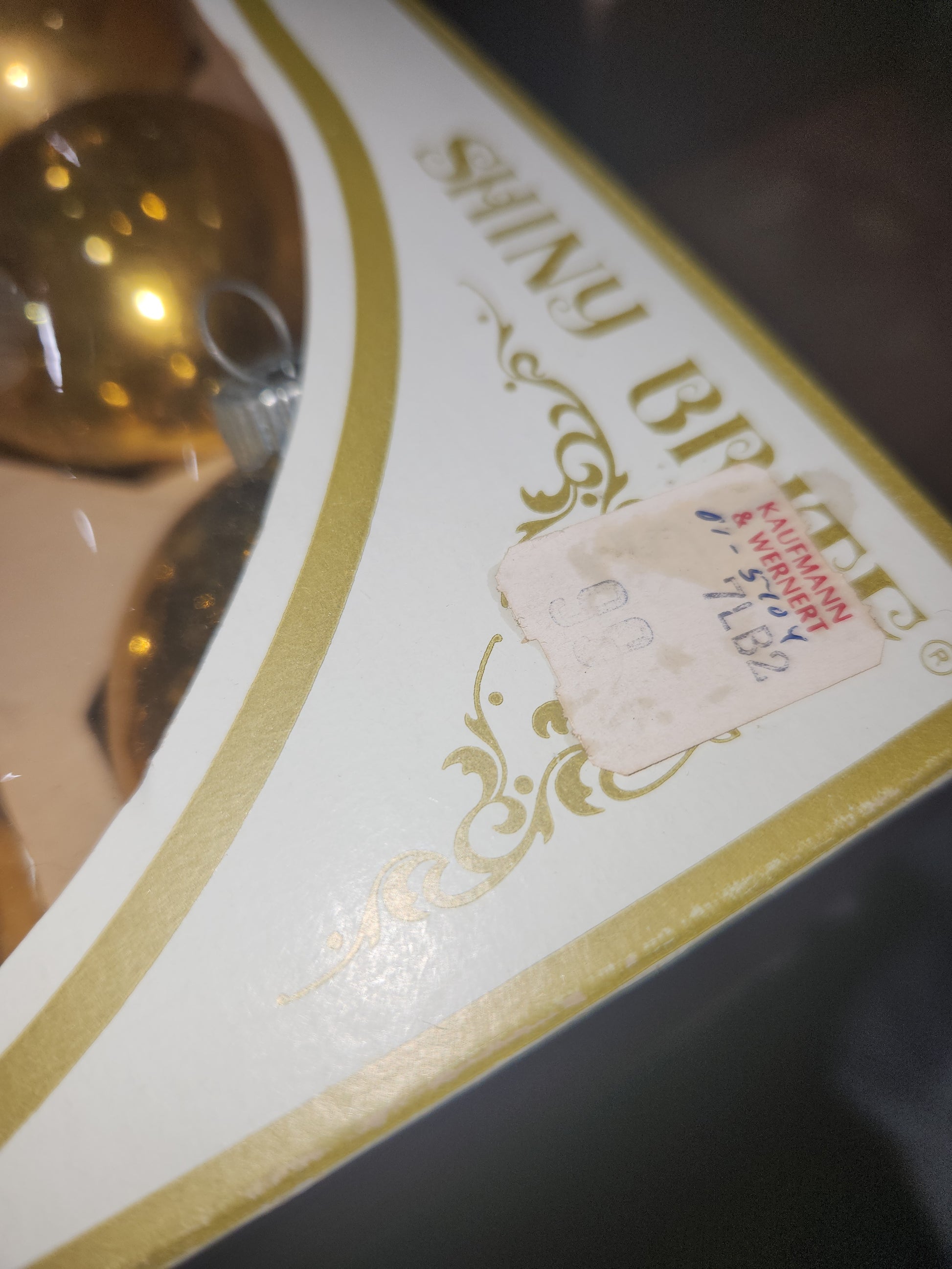 Box of gold Shiny brite ornaments, I acquired these ornaments in this box. The box is in vintage condition with rips and bends in the box. This box was scotch taped shut on both long sides, I did not attempt to remove it. The film is intact with 1 pin size hole. The ornaments look to be in vintage condition. Made by Max Eckardt and Sons but not dated. When buying vintage ornaments, you may possibly be getting discoloration, paint loss, crazing and ruined boxes, please be aware of this before ordering. We do our best to describe and photograph really well the damage or defects we see. Please see photos as they part of the description.
