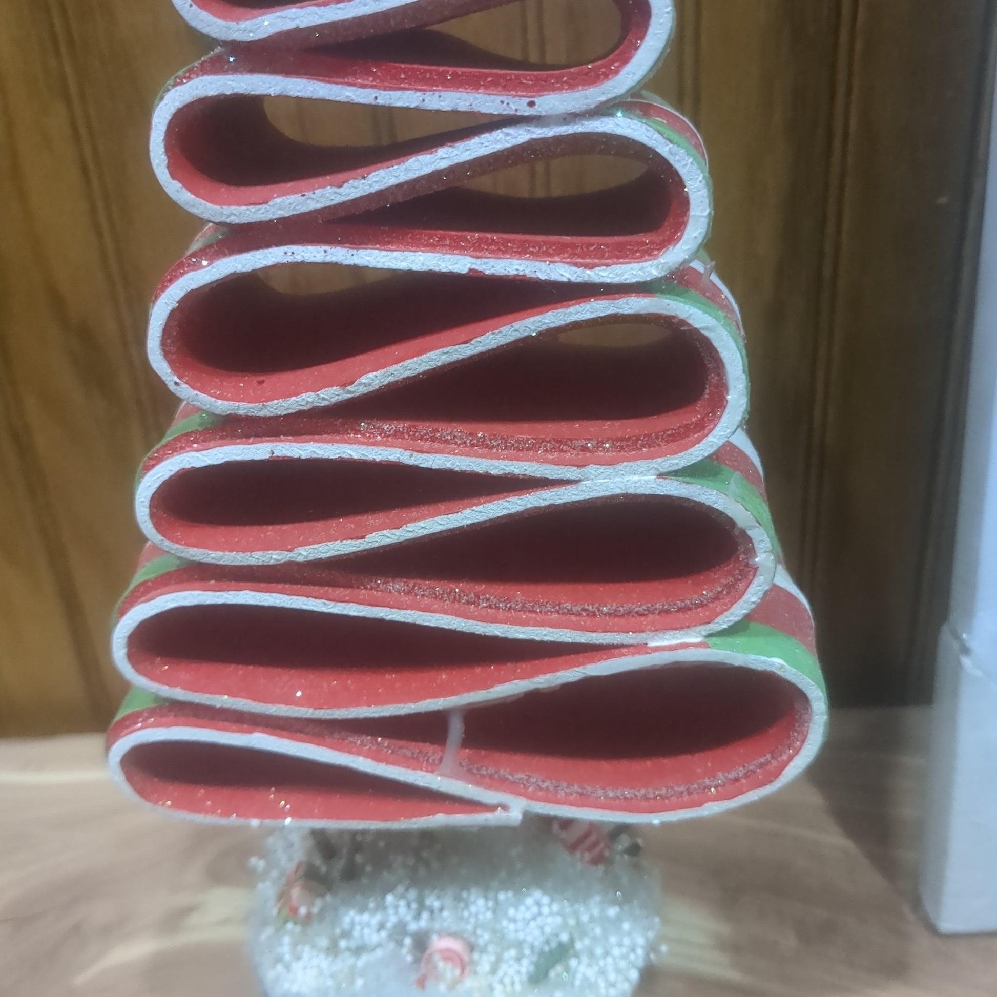Unique candy ribbon tree would be a neat addition to a mantel. 13 in tall 5 in wide 3 in deep at the bottom