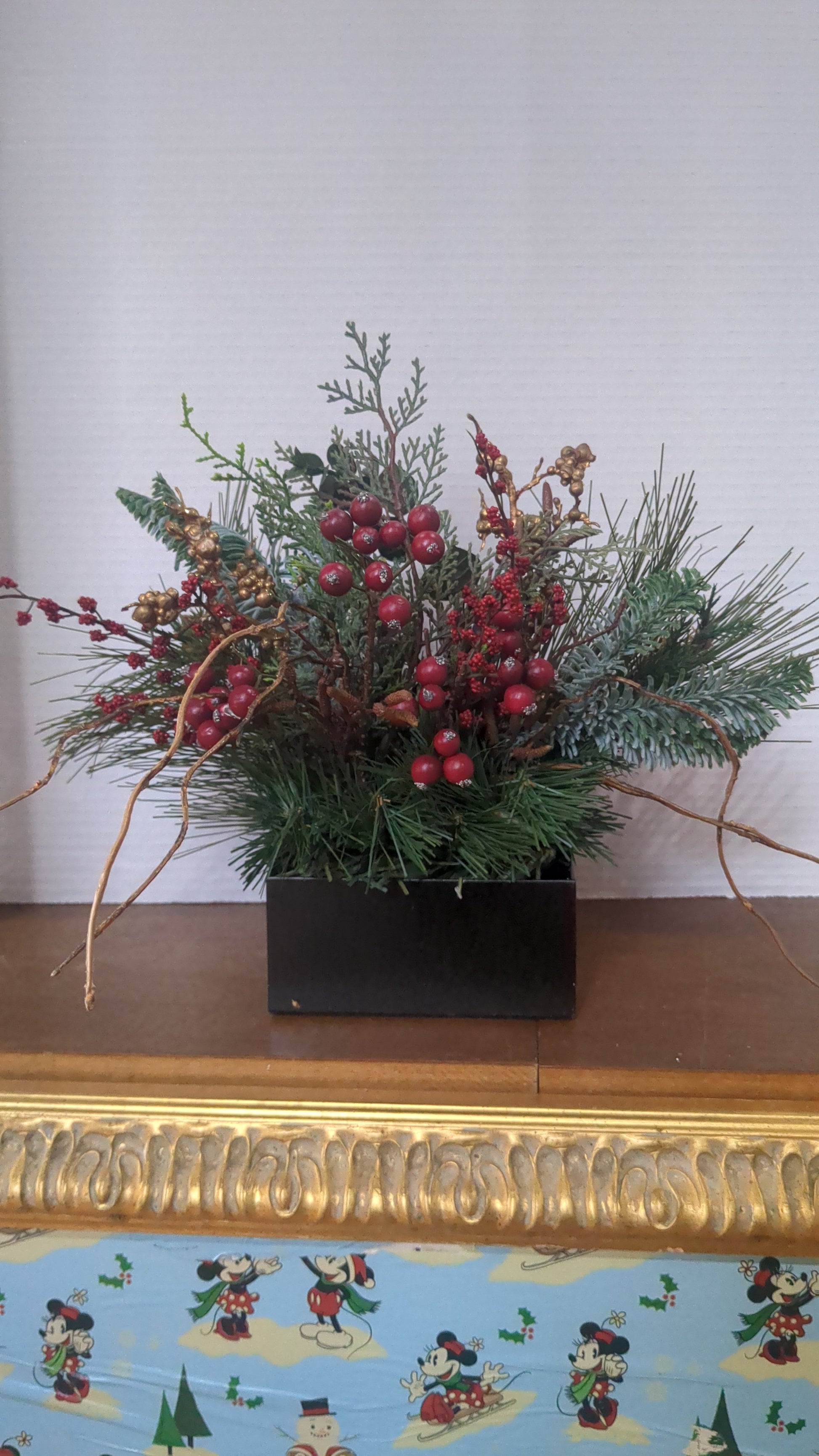 3" x 5" card box upcycled into this cute one of a kind arrangement with artificial flowers and greenery