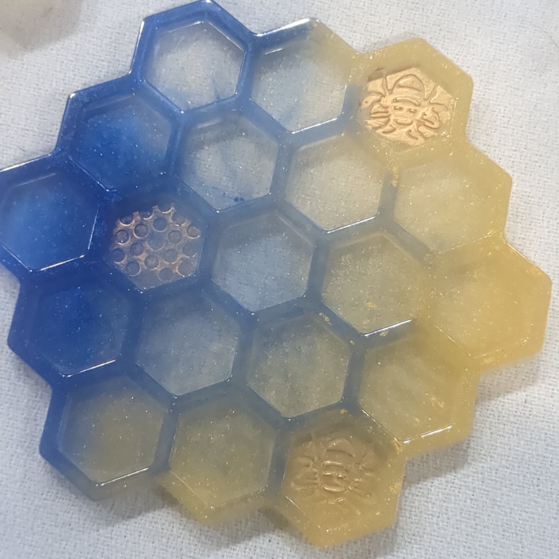 Handmade at the Cozy from resin and mica powders. These stack inside the holder making them super convenient and compact. Bee has gold accents on it. Because it is handmade, it is possible it could have small flaws.