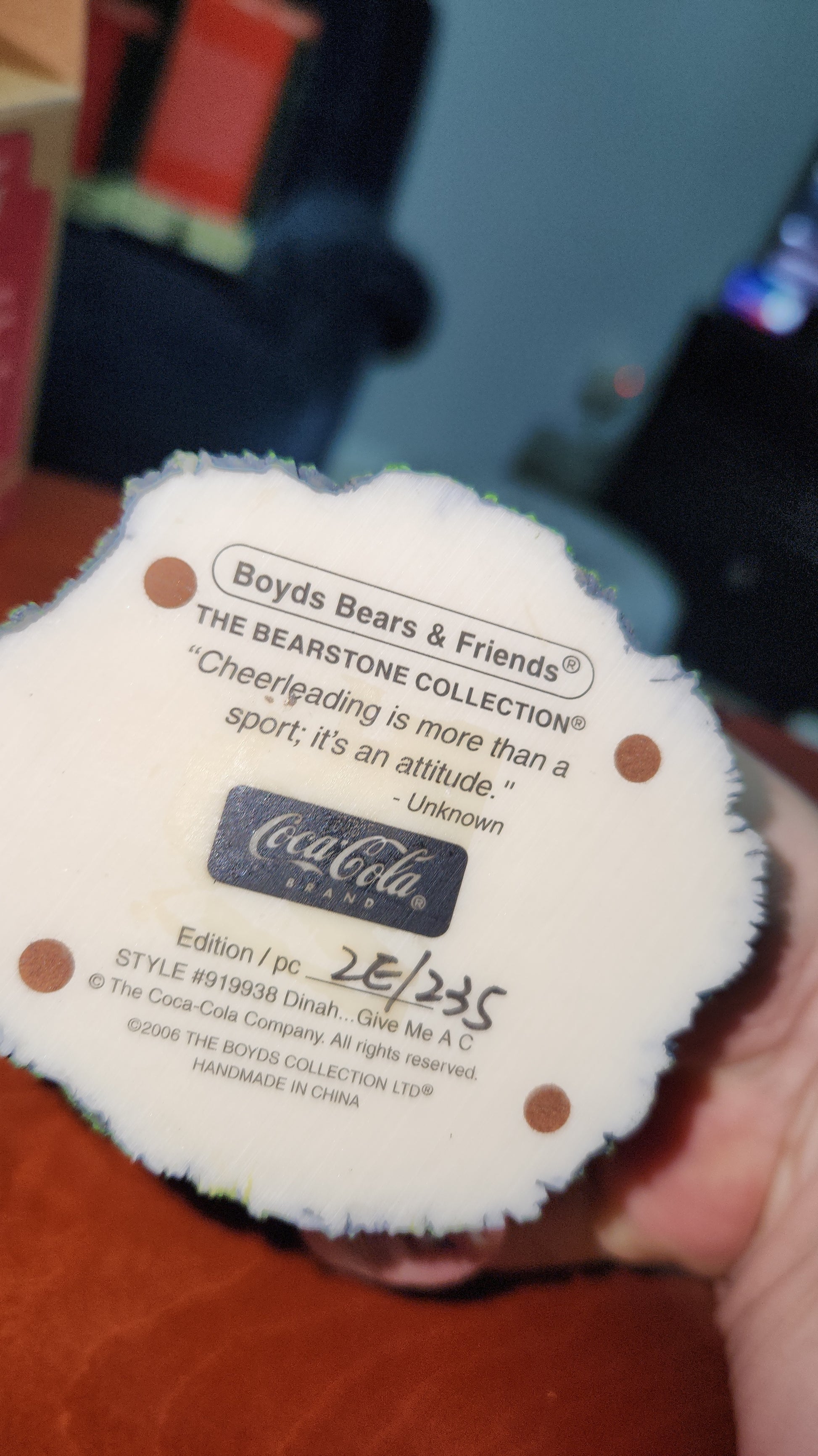 Coca-Cola Boyds Bear Dinah Gimmie A "C" Figurine 919938 Bearstone cc231a. it has a box, but no Styrofoam is not present. figurine and box are in good condition.