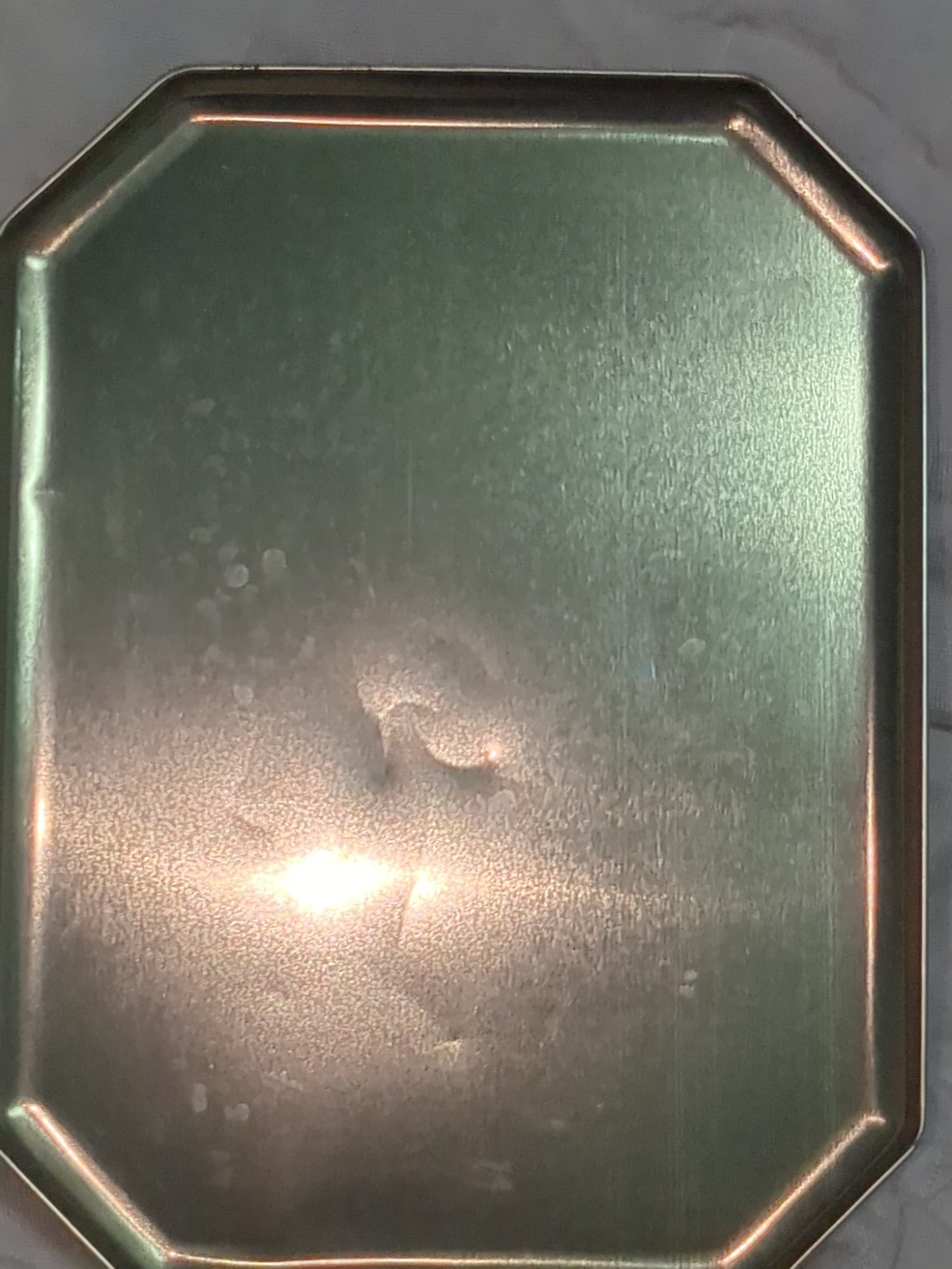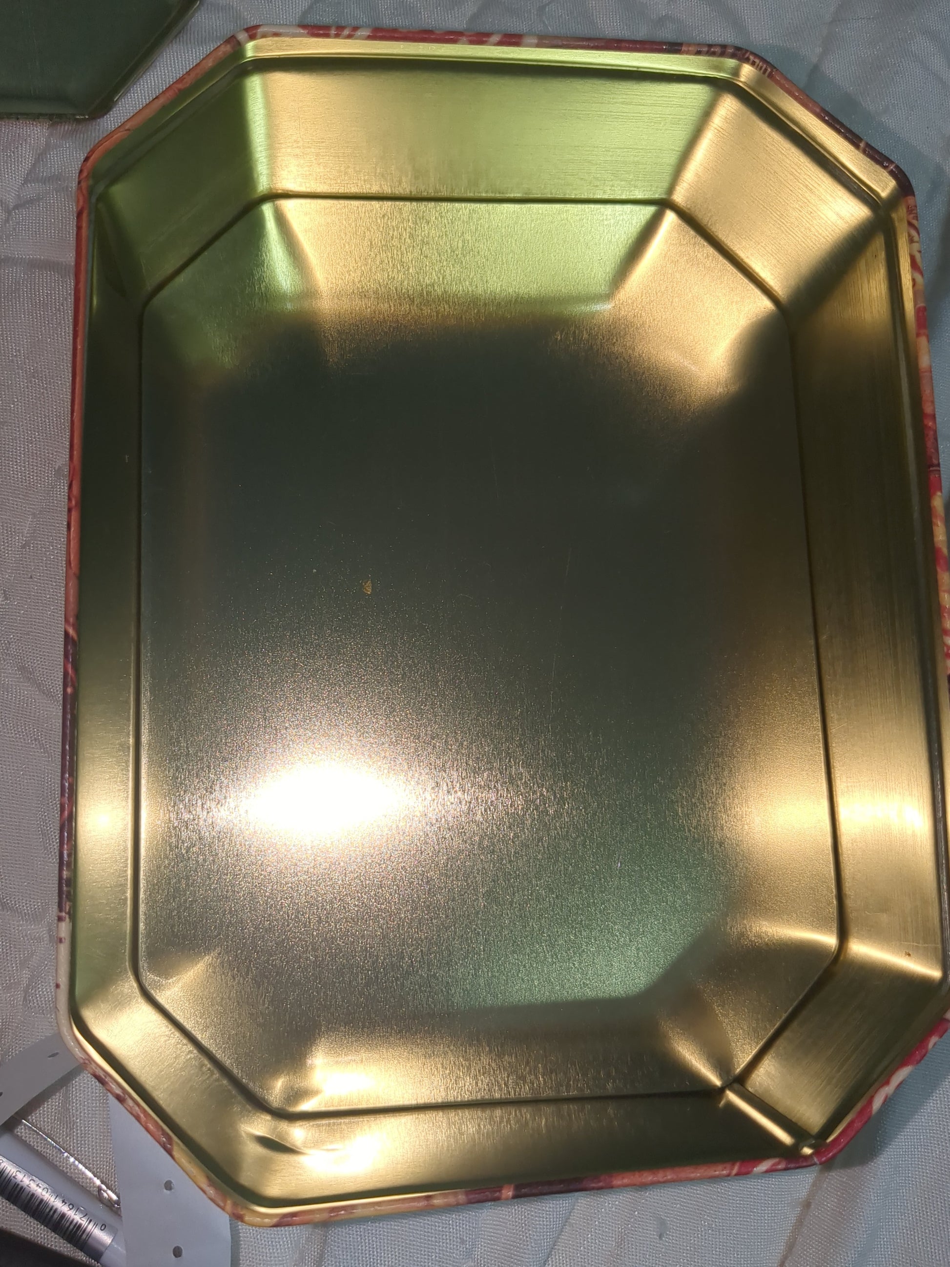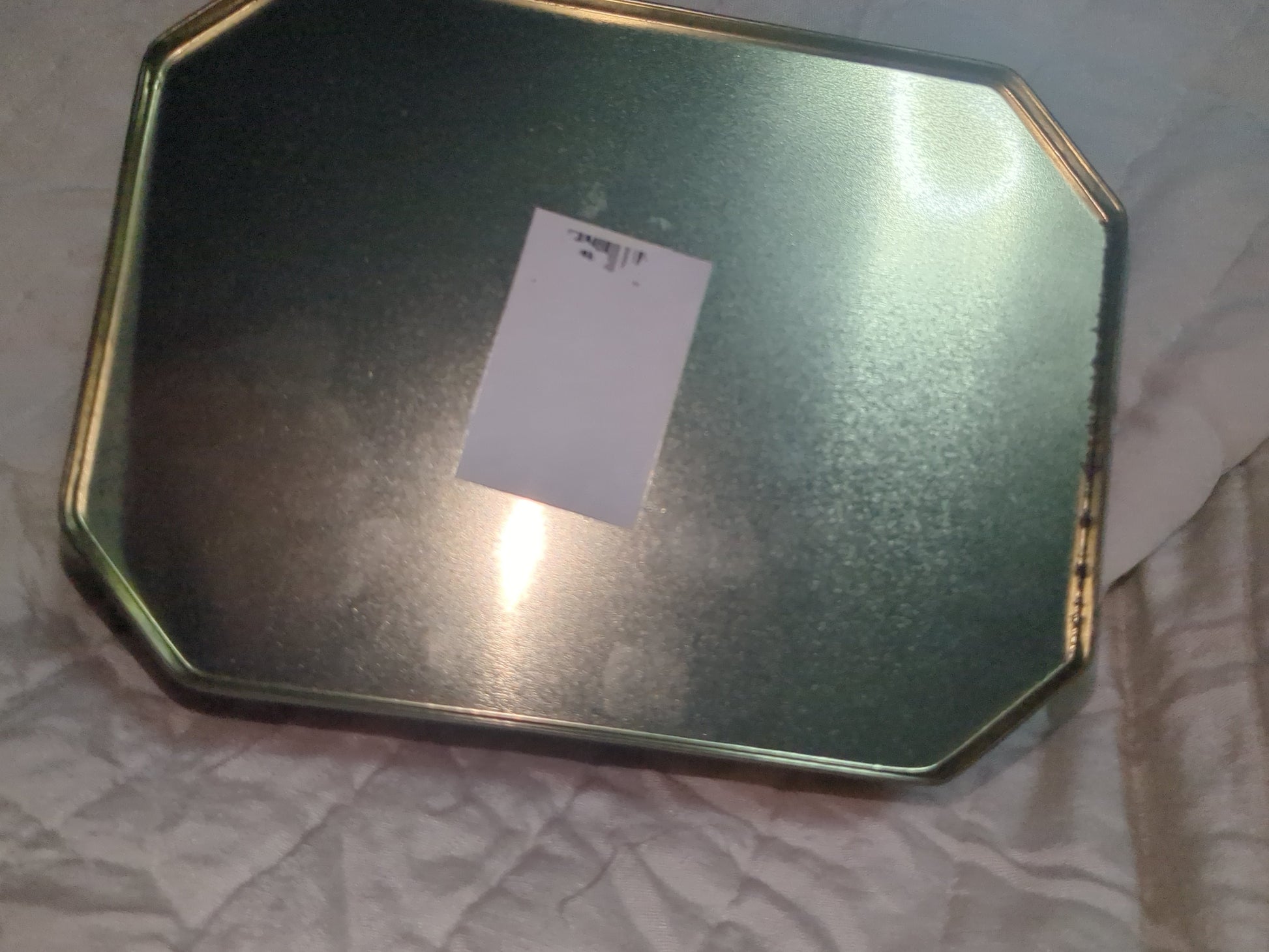 The art work on this tin was created by SANDRA ETHRIDGE PORTER for the Coca Cola Company. It is 8" long 6 wide & 2 1/2" deep. with odd cut corners. It is slightly textured. There is a small dent in a corner best seen from the inside there are some dents on the lid, I cannot see from outside, but can be seen inside. I neither see nor feel any minor or major scratches. Please see the photos as they are part of the description