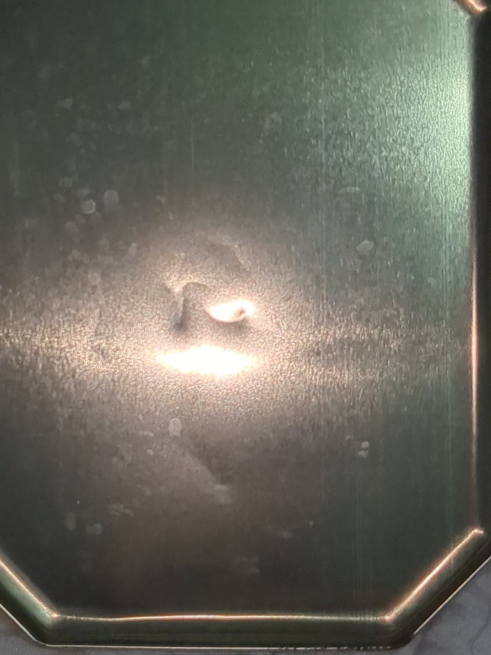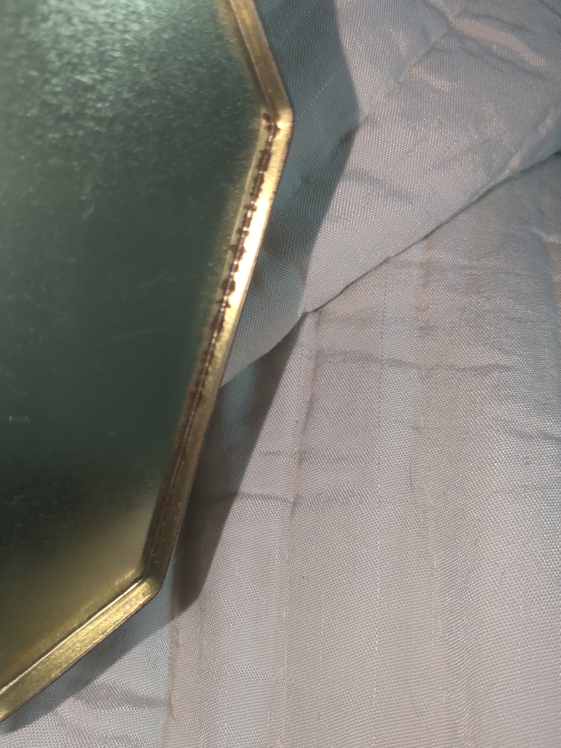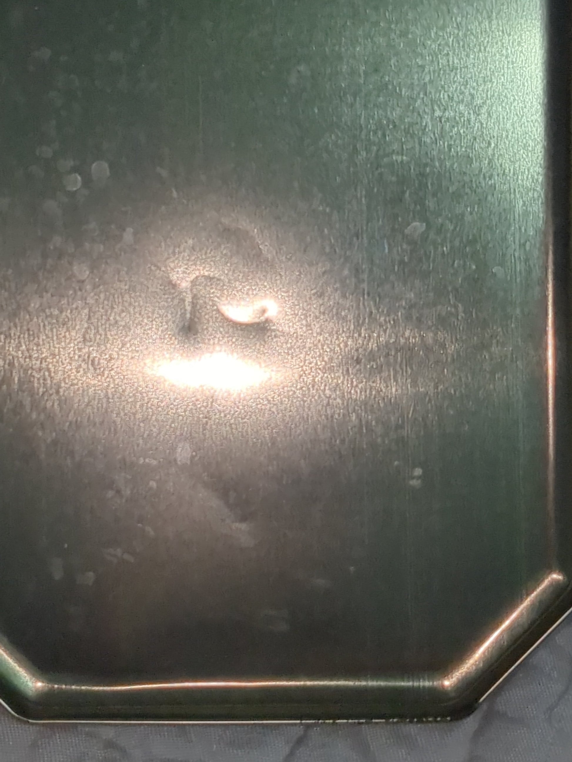 The art work on this tin was created by SANDRA ETHRIDGE PORTER for the Coca Cola Company. It is 8" long 6 wide & 2 1/2" deep. with odd cut corners. It is slightly textured. There is a small dent in a corner best seen from the inside there are some dents on the lid, I cannot see from outside, but can be seen inside. I neither see nor feel any minor or major scratches. Please see the photos as they are part of the description