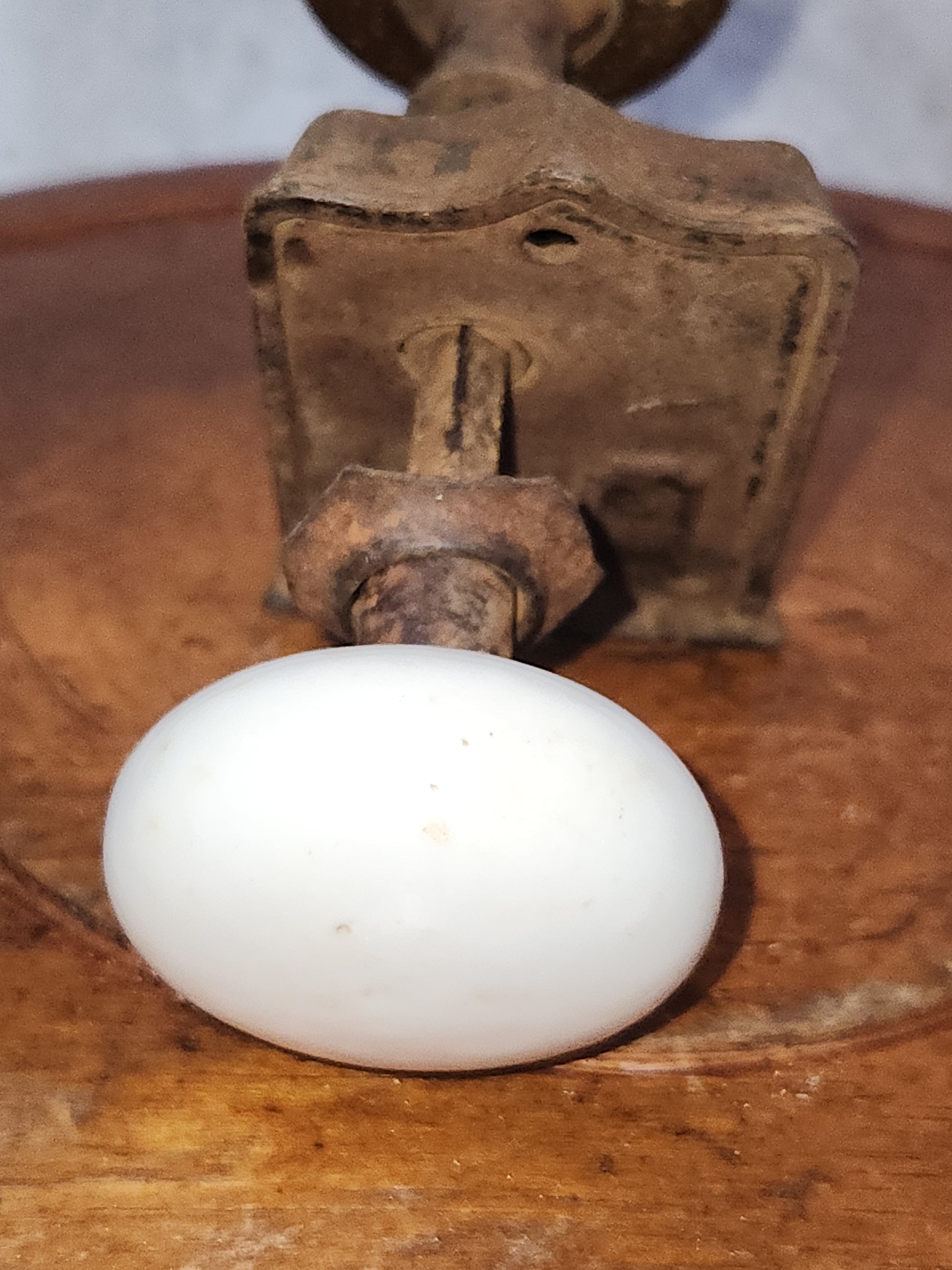 This is an older set of knobs with a lock. Knobs turn the mechanism. Knobs appear and feel like porcelain and have lots of patina and the brown knob has some chips, white one has a pit. Please see photos as they are part of the description.