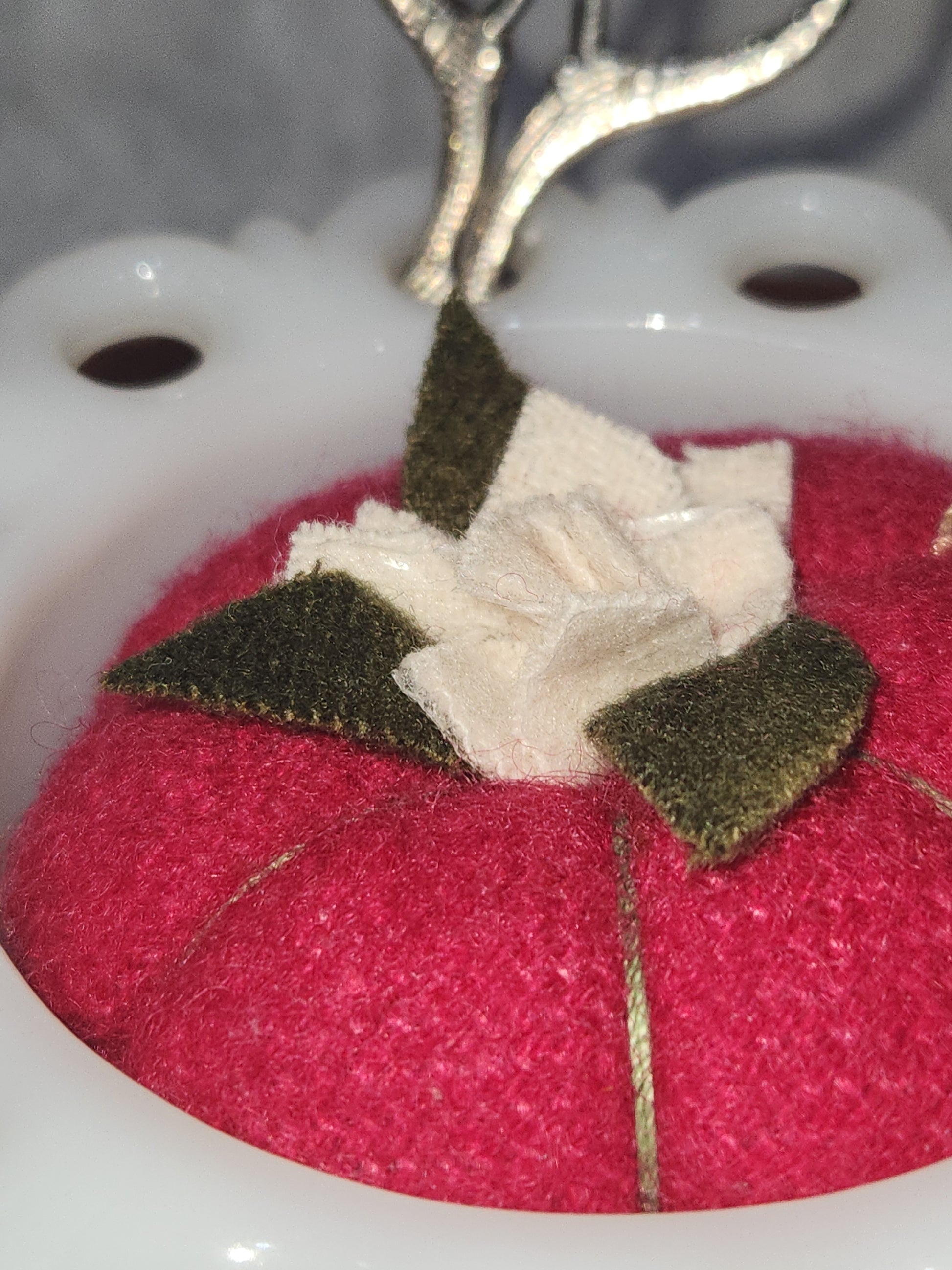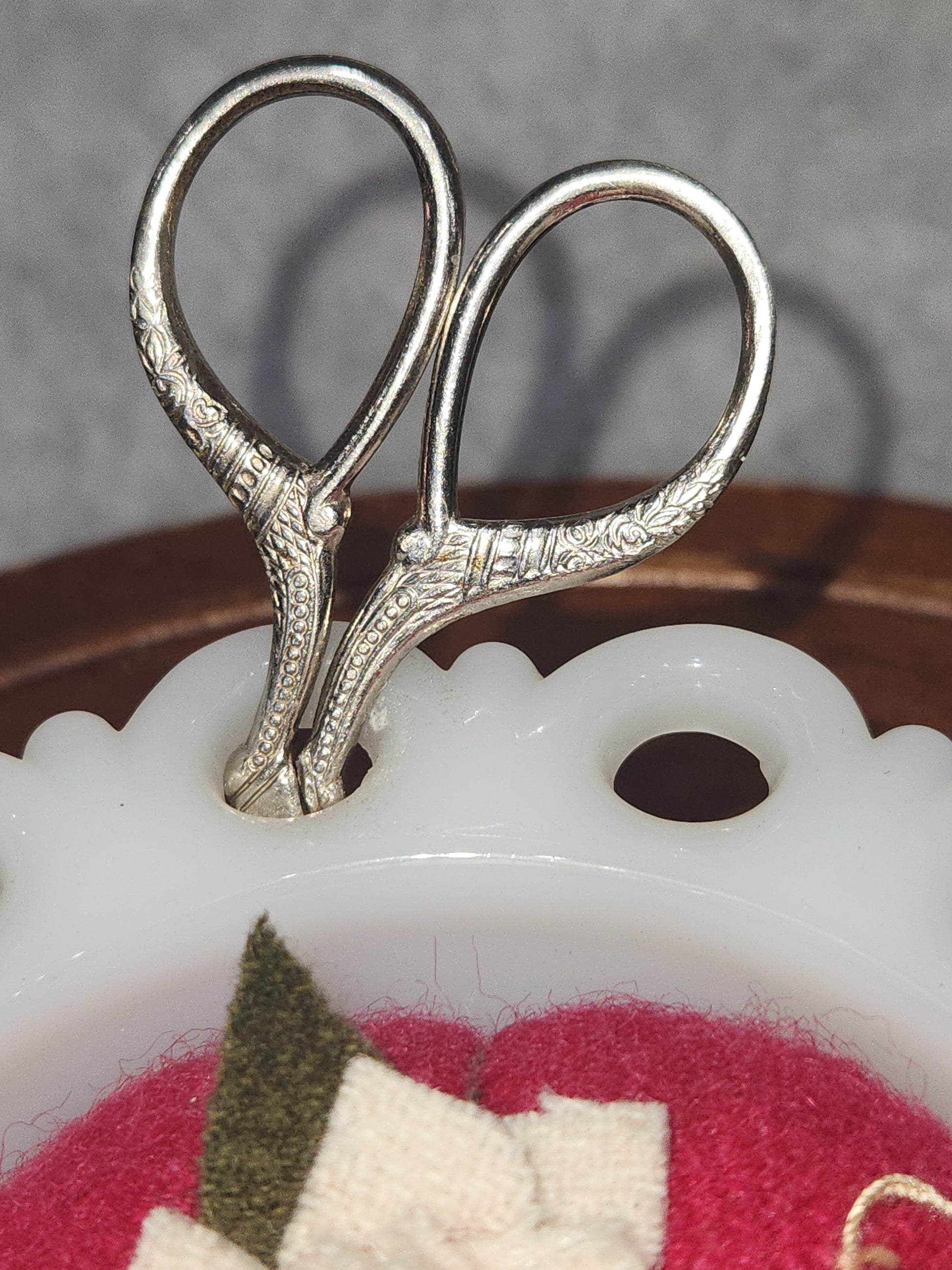 This is a group of items I put together. The milk glass pedestal in in good condition, it is small 5 1/4" diameter and 3" tall. Check out the cute felt pincushion, pins, buttons and scissors I added. Perfect for your sewing room or area. Add your own scissors to all the loops. The sissora I added are stamped with USA, they do not likento hang straight down, but hang down at an angle, I do not know if your sissors will hang straight down or not. Add your pins! Nothing is glued down. Please see photos as they are part of the description.