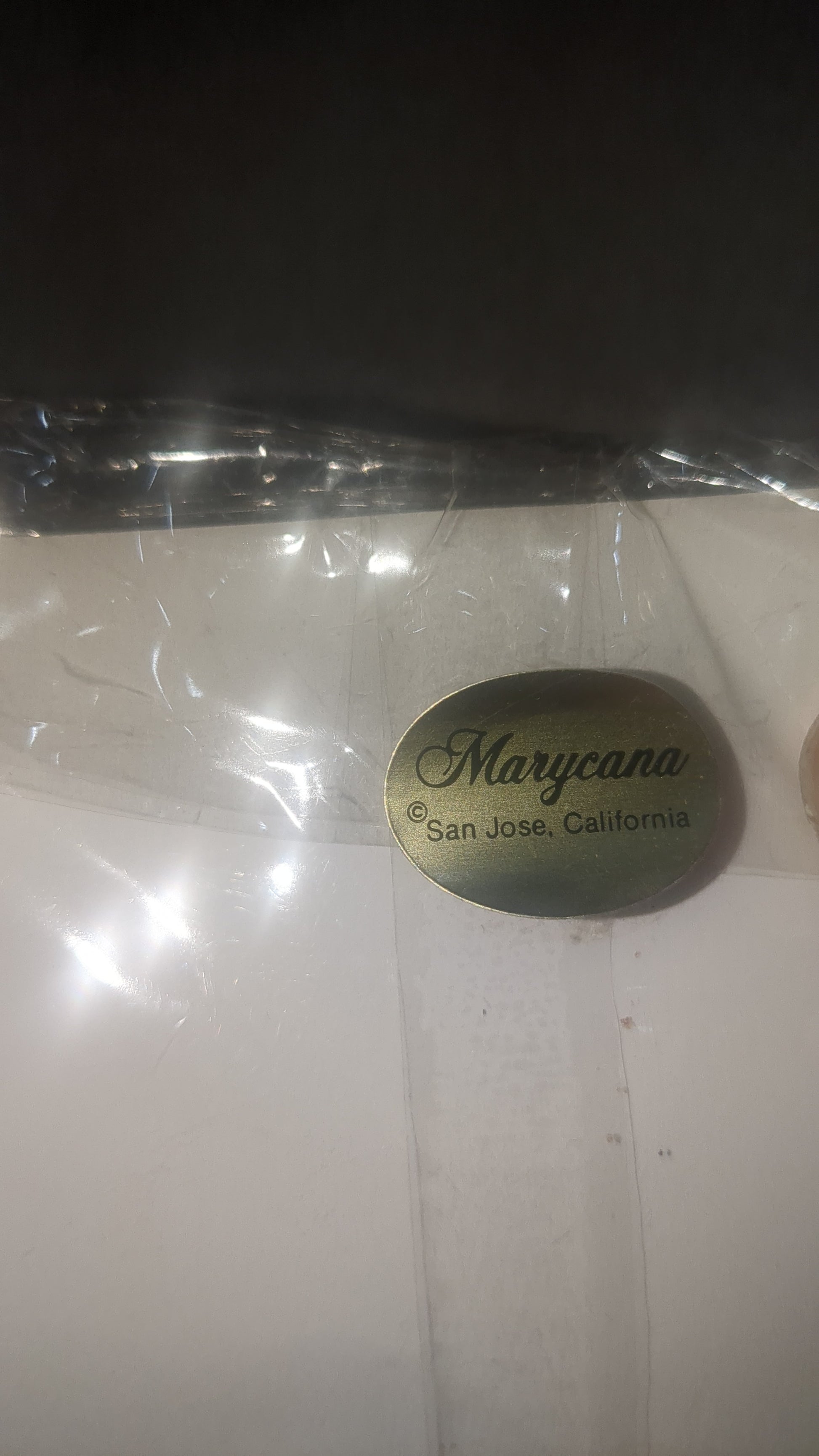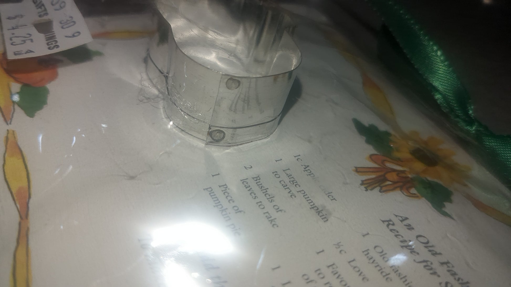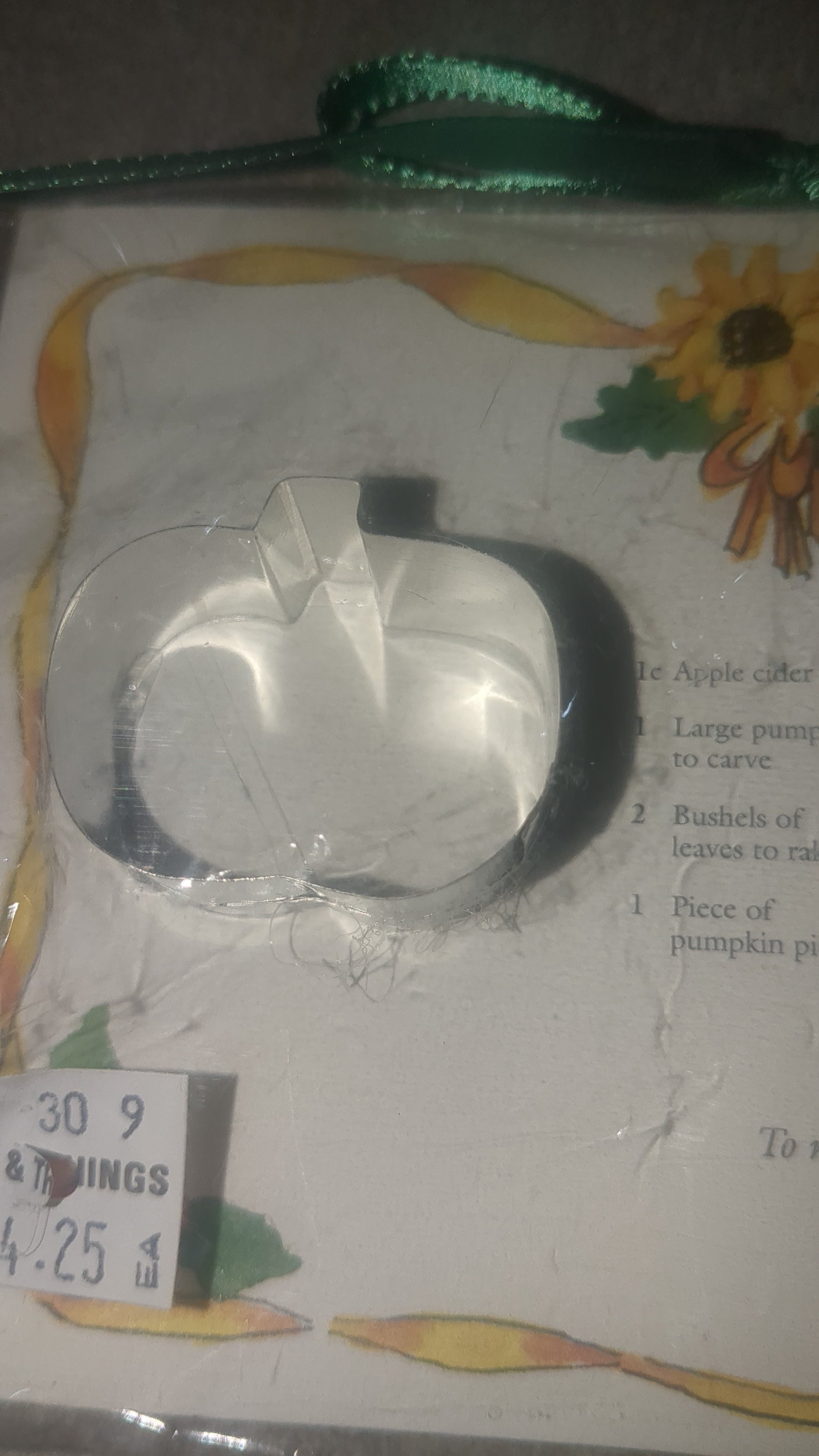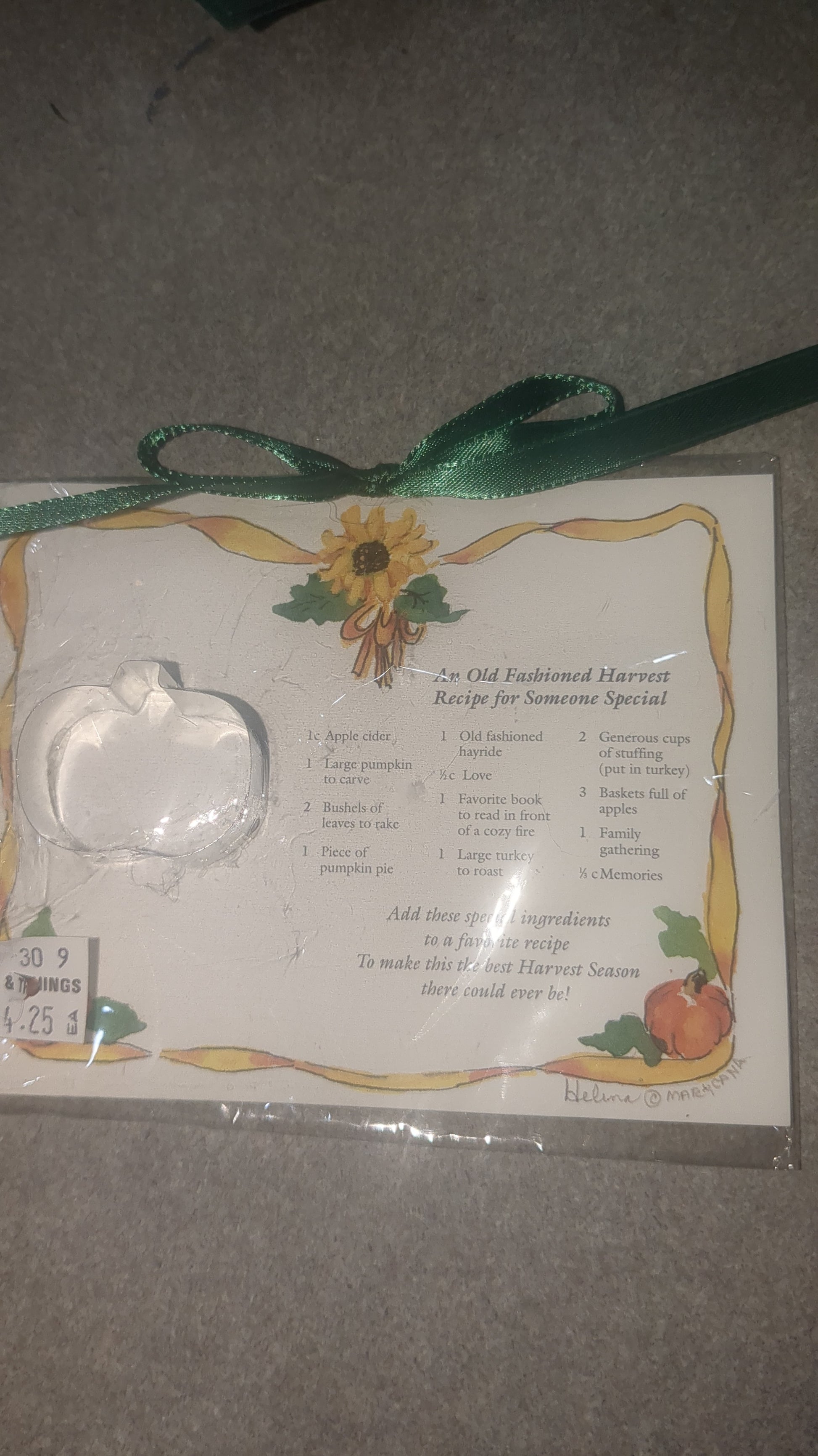 This is an unopened old-fashioned harvest recipe for someone special card with a 1 1/2 in pumpkin cookie cutter. Gold seal on package says Helina Marycana San Jose, California