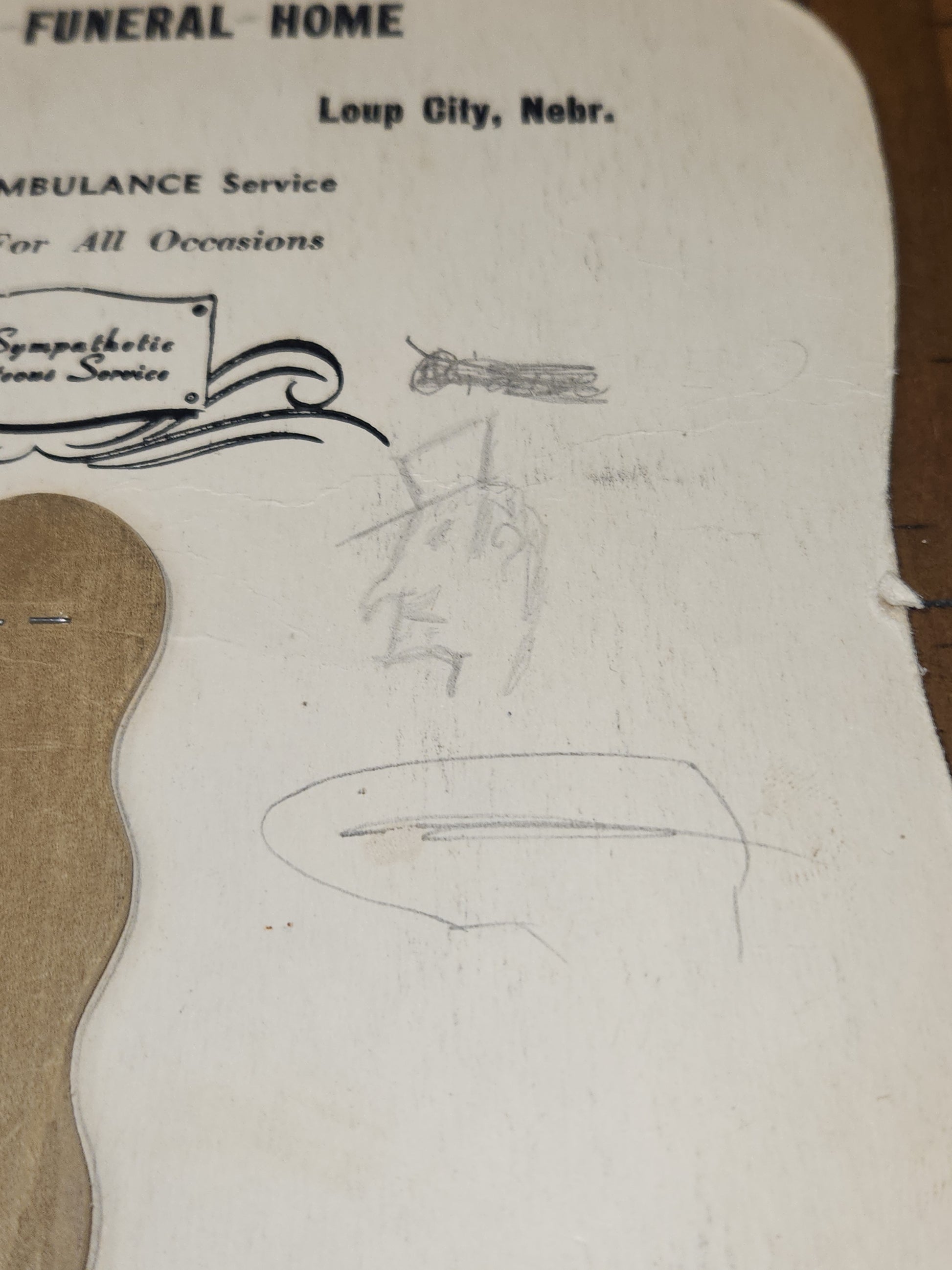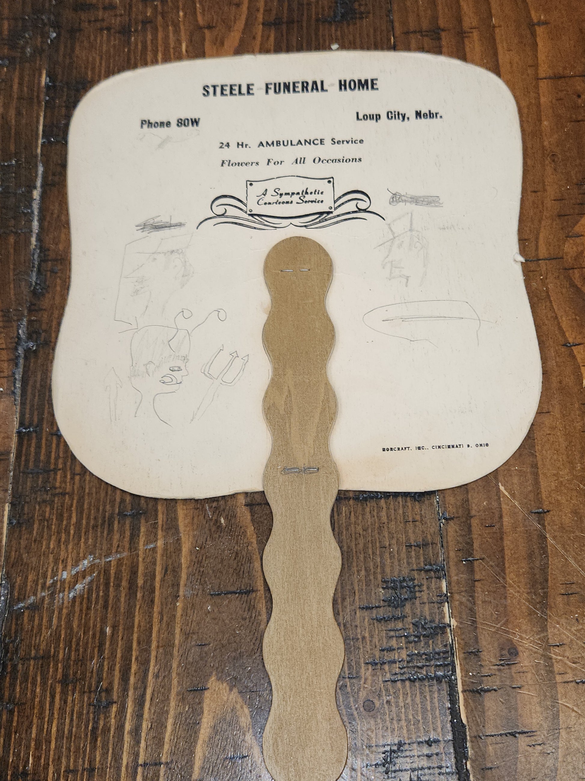 This is a set of 3 advertising fans for Steele Fineral Home in Loup City, Nebraska. Being sold as is, not perfect but intact!They all have wear on the edges and along the sticks. One has drawings in pencil. Each of them is 11 3/4" tall and just under 7 1/2"" wide. There is a light drawing done in pencil. Please see photos as they are part of the description