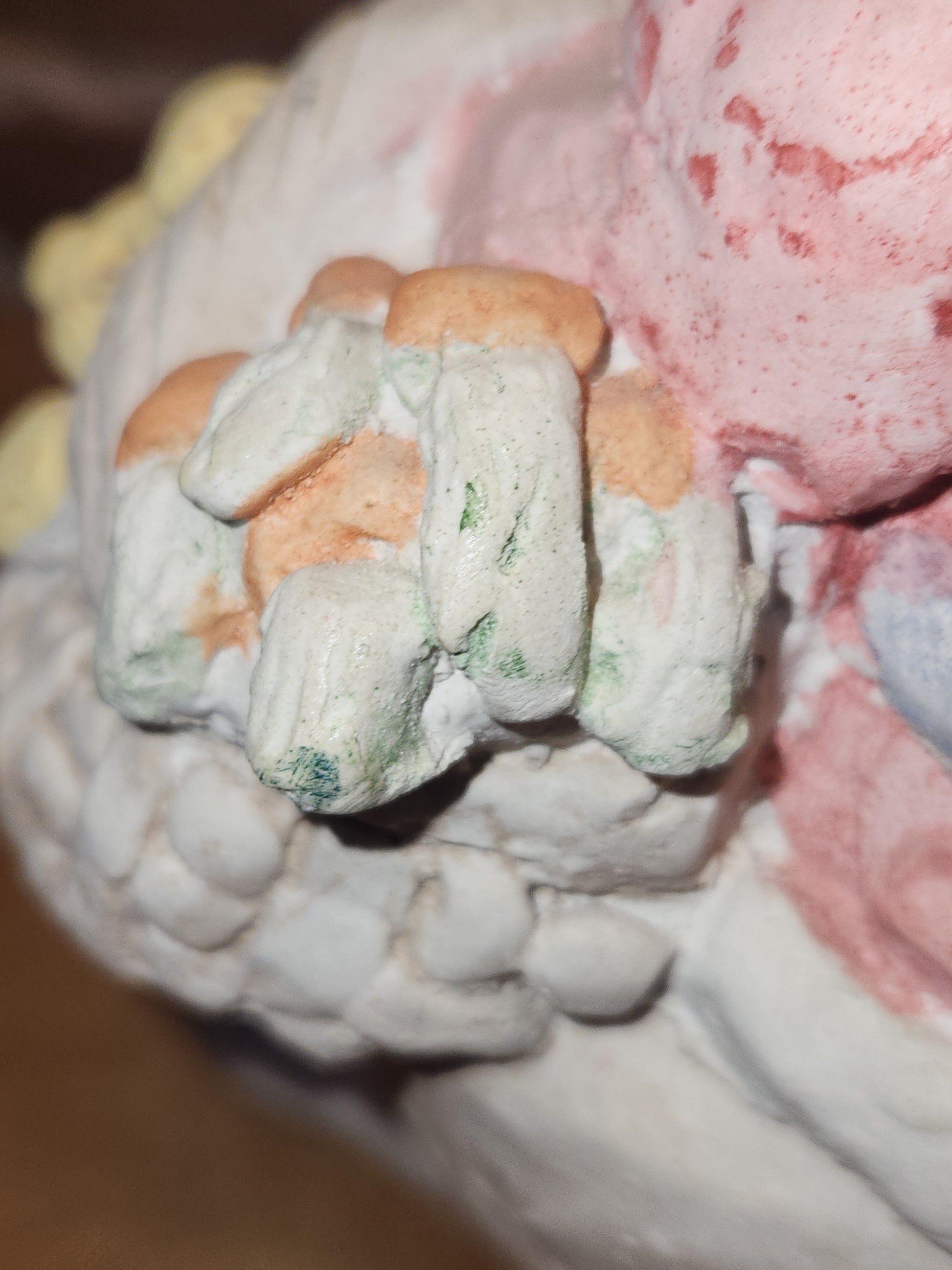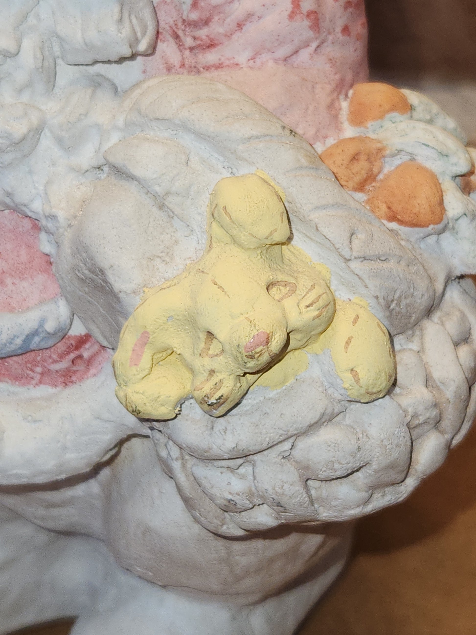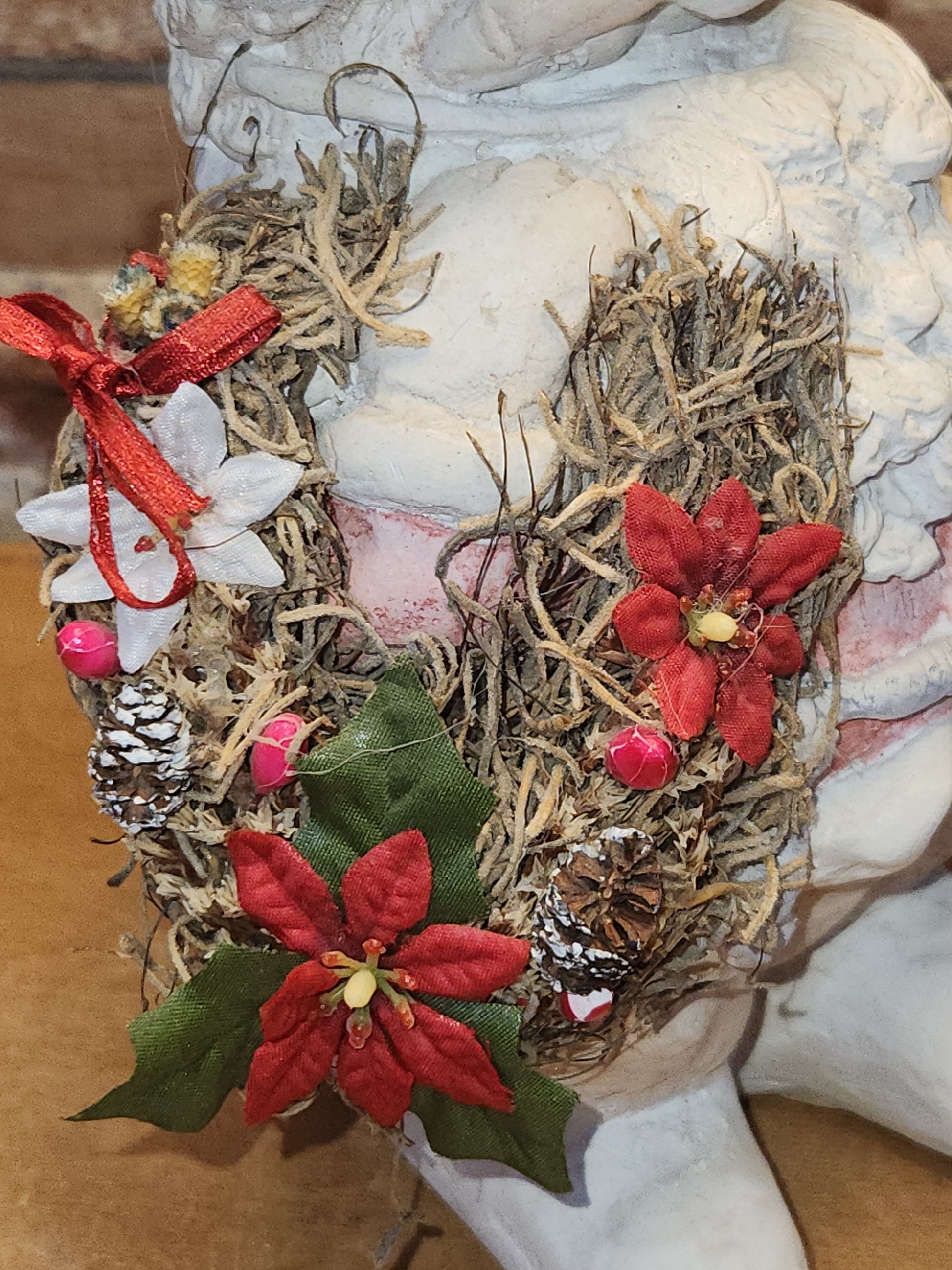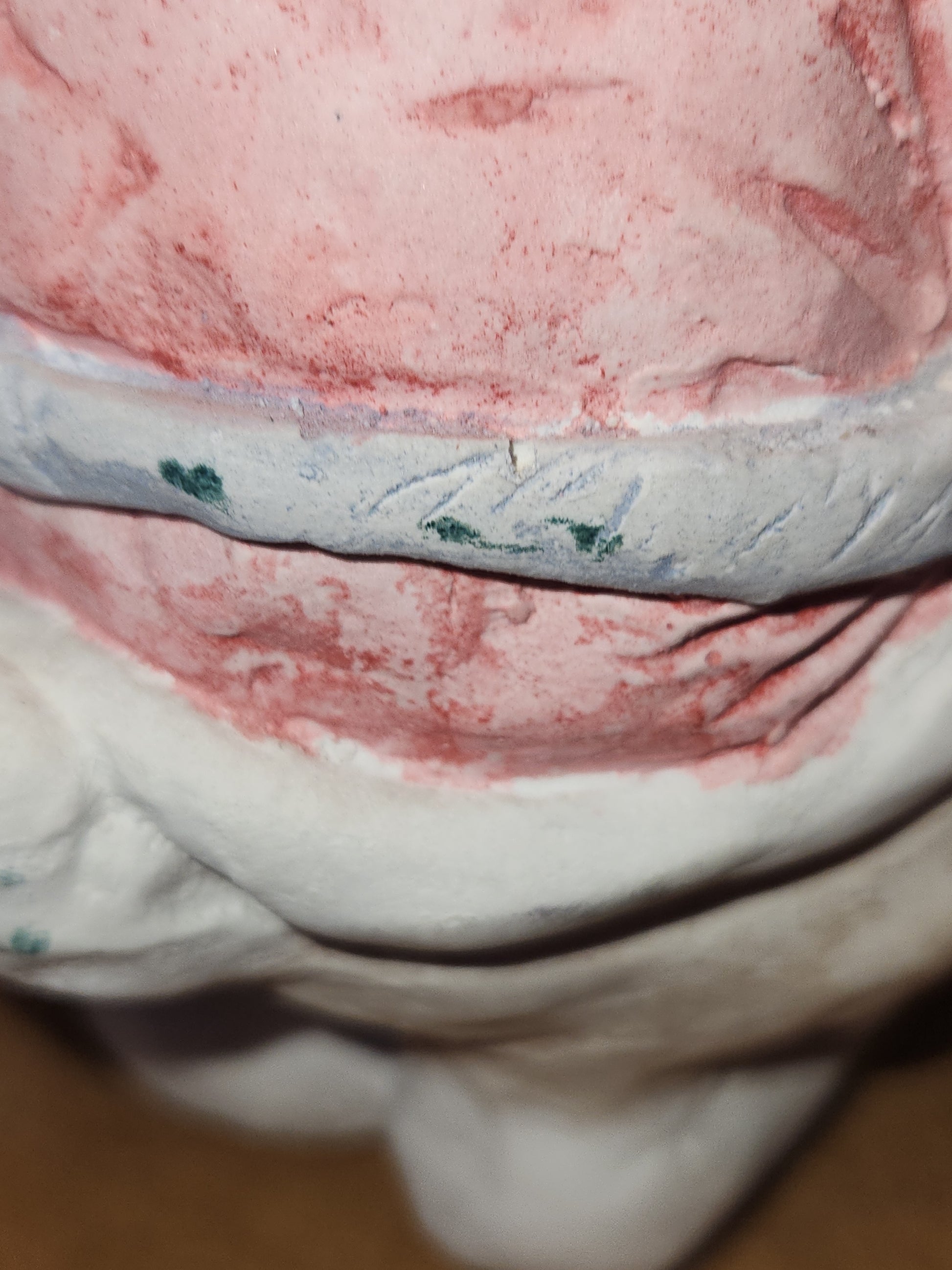 This bunny is in good condition. It is large and heavy. It is 8" tall wingspan is 5 1/2" and 5" deep. I don't see any chips or cracks. There is some green on it's tall and coat trim, likely tranfer.of paint from another figurine. It has 1 broken pinecone in its wreath. It has its original box that has a fitted foam packaging around it. Box is not pictured yet. Box is not in great shape with wear, tape and stains. Please see photos as they are part of the description