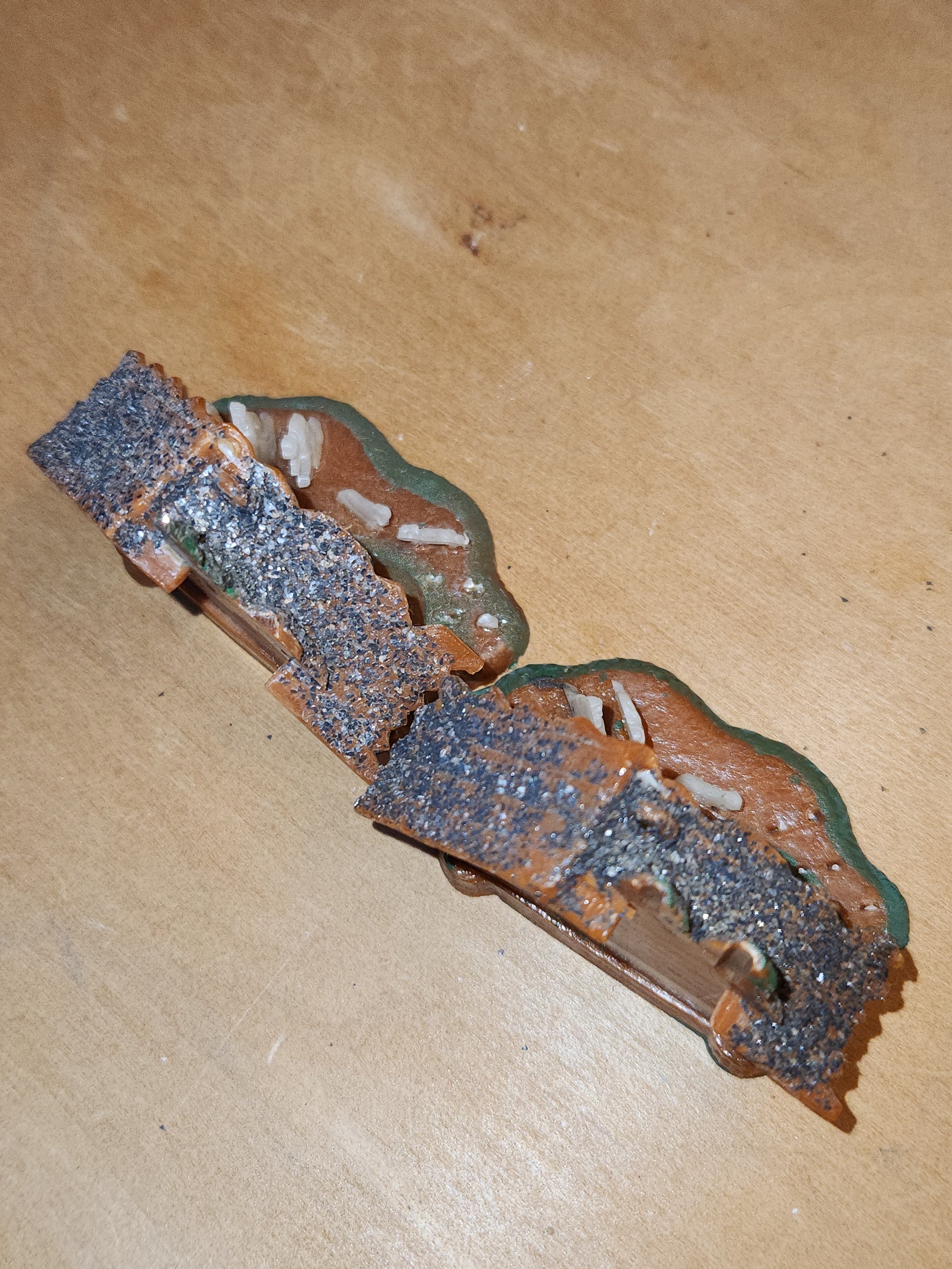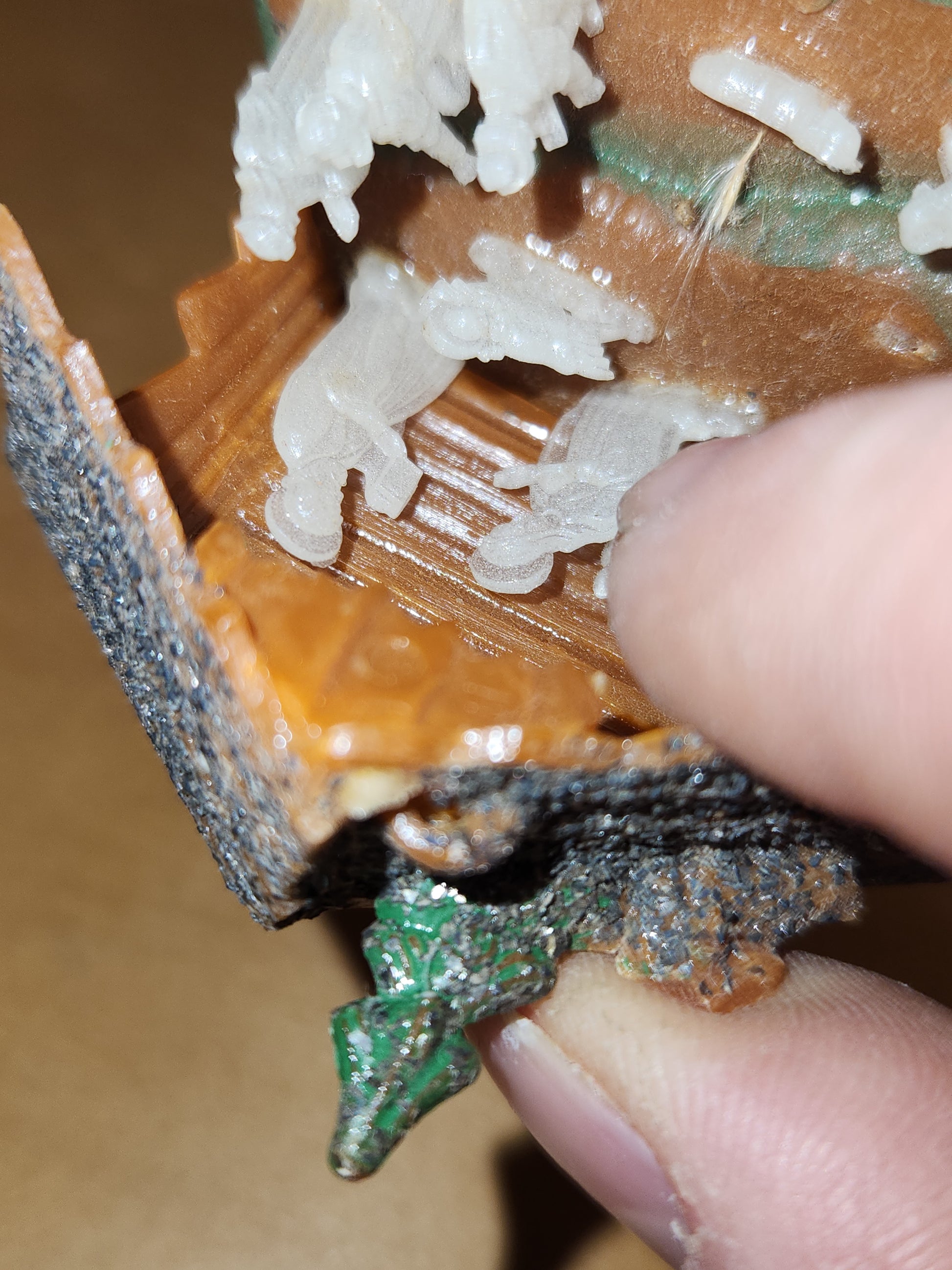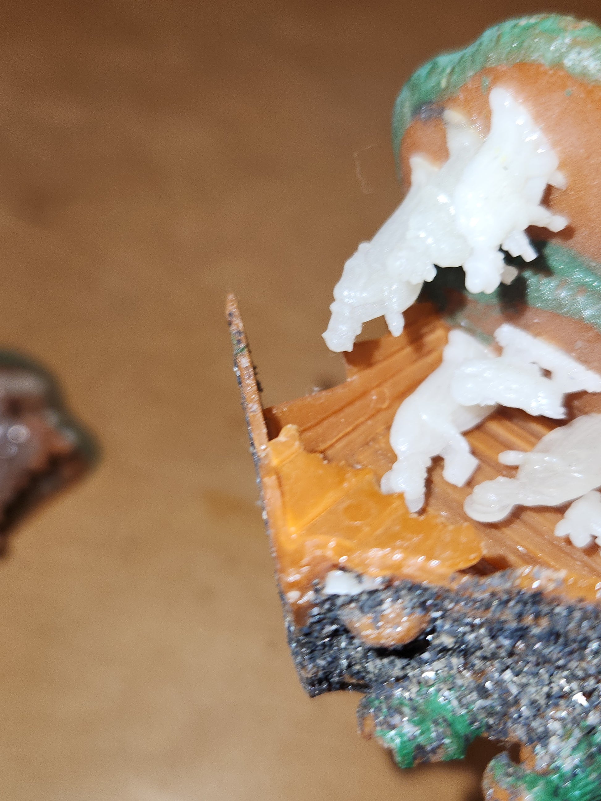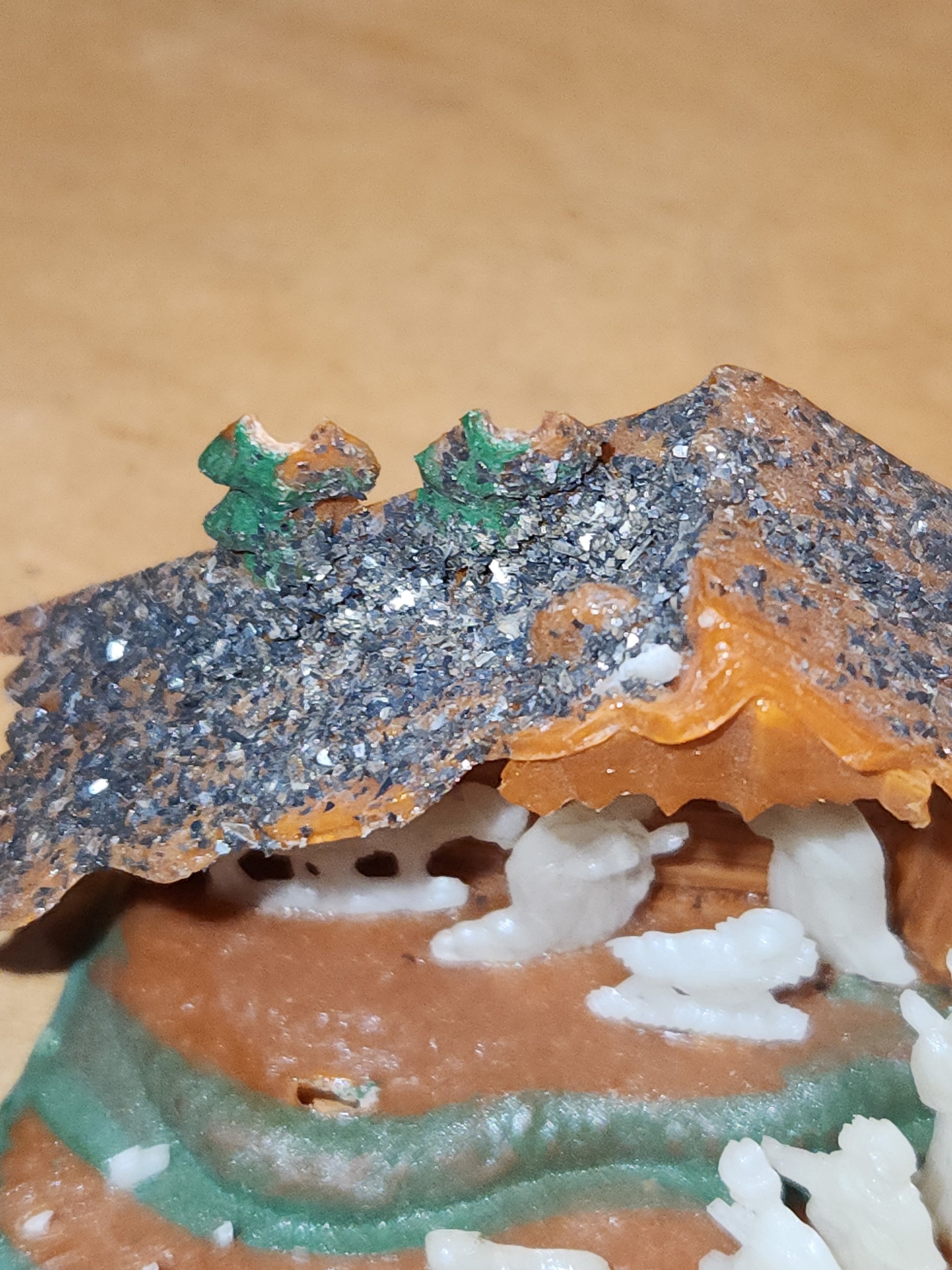 This is a set of two nativities in as is condition. Each has pieces missing or broken off. There is a hole in the back to place a tree light to illuminate the hy family. They are still really old, really cool pieces. Each is 2 1/2" long 1 3/4" wide 1 1/2" to the roof top. Please look at all the photos as they are considered part of the description.
