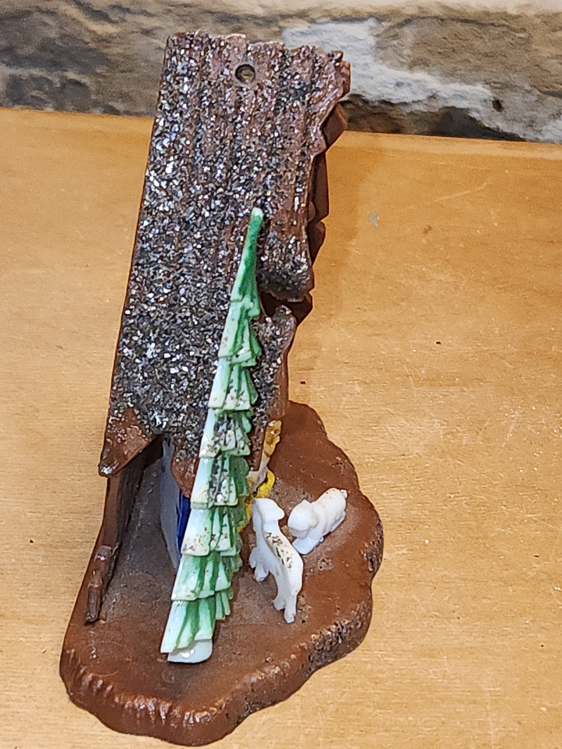 This piece is in good vintage condition. It has a hole in back to add a christmas light for a spot light on the holy family. It is 3 3/4" tall and a bit over 3 1/2" wide Please look at all the photos as they are considered part of the description.