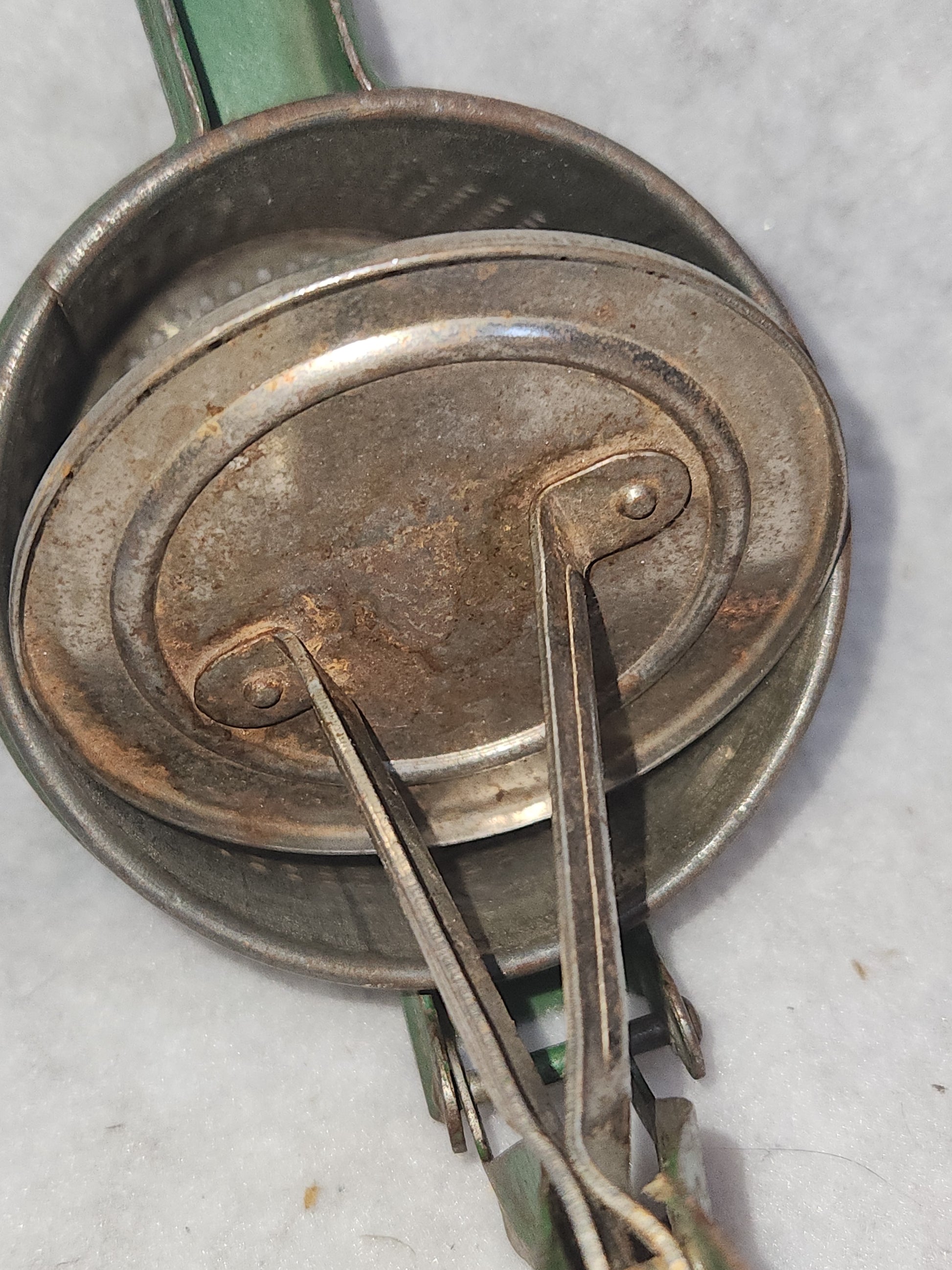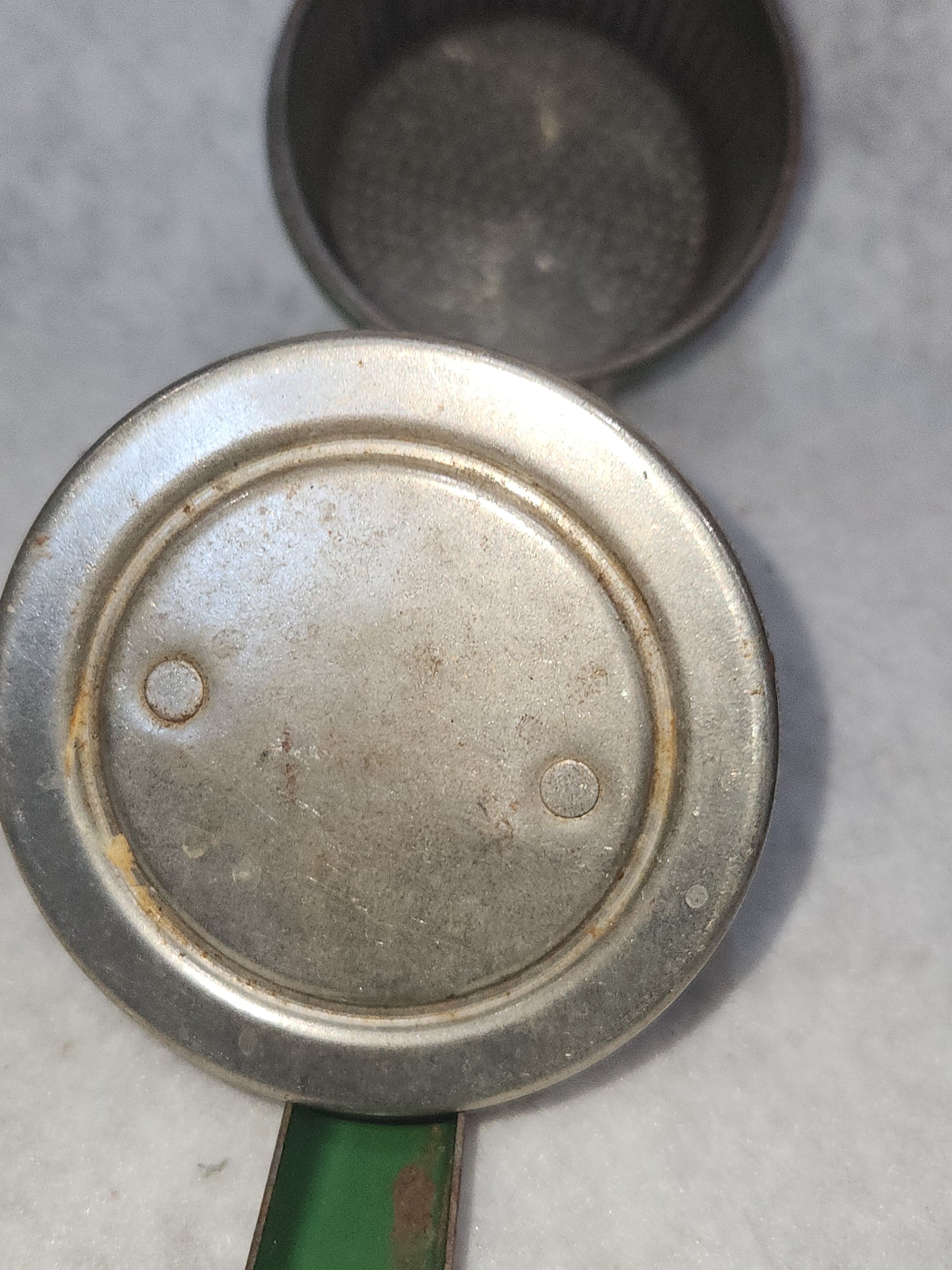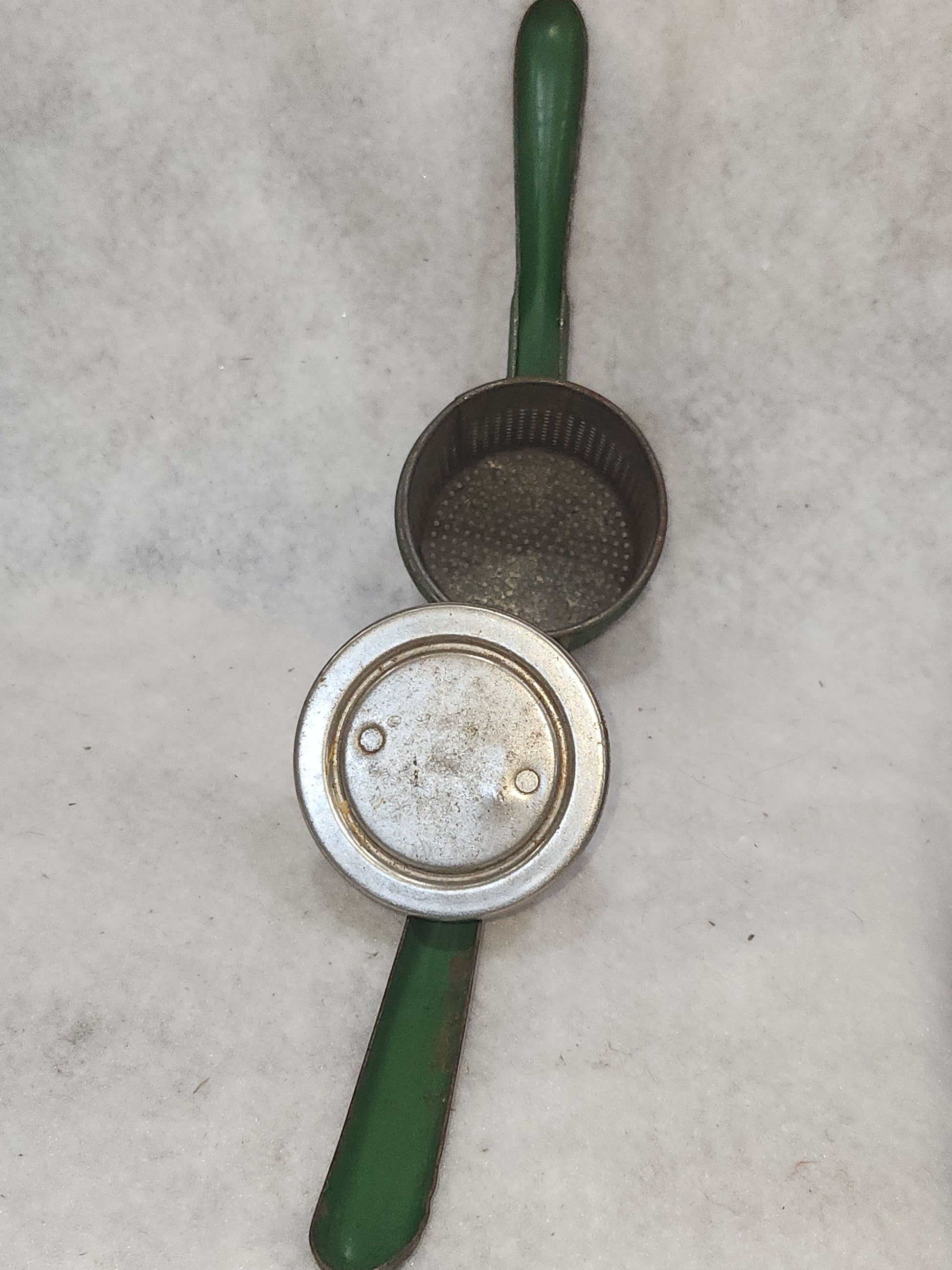 This vintage green handle potato ricer has no makers mark I can find. it has much paint loss and rust, but I feel that just adds to the character. It is just under 11" long 3 1/2" diameters. It's really cool piece, great for adding to your vintage kitchen. Please see photos as they are part of the description