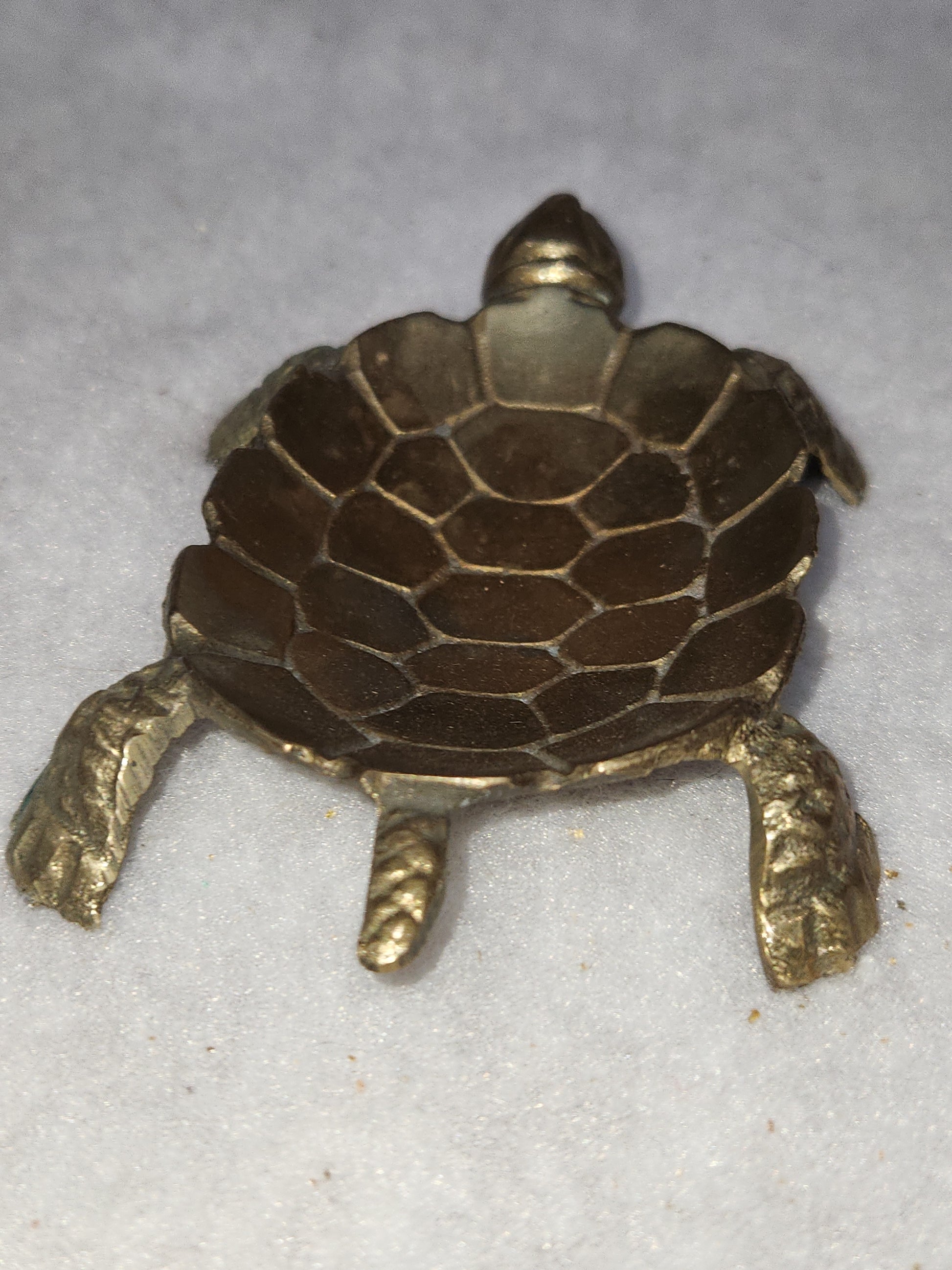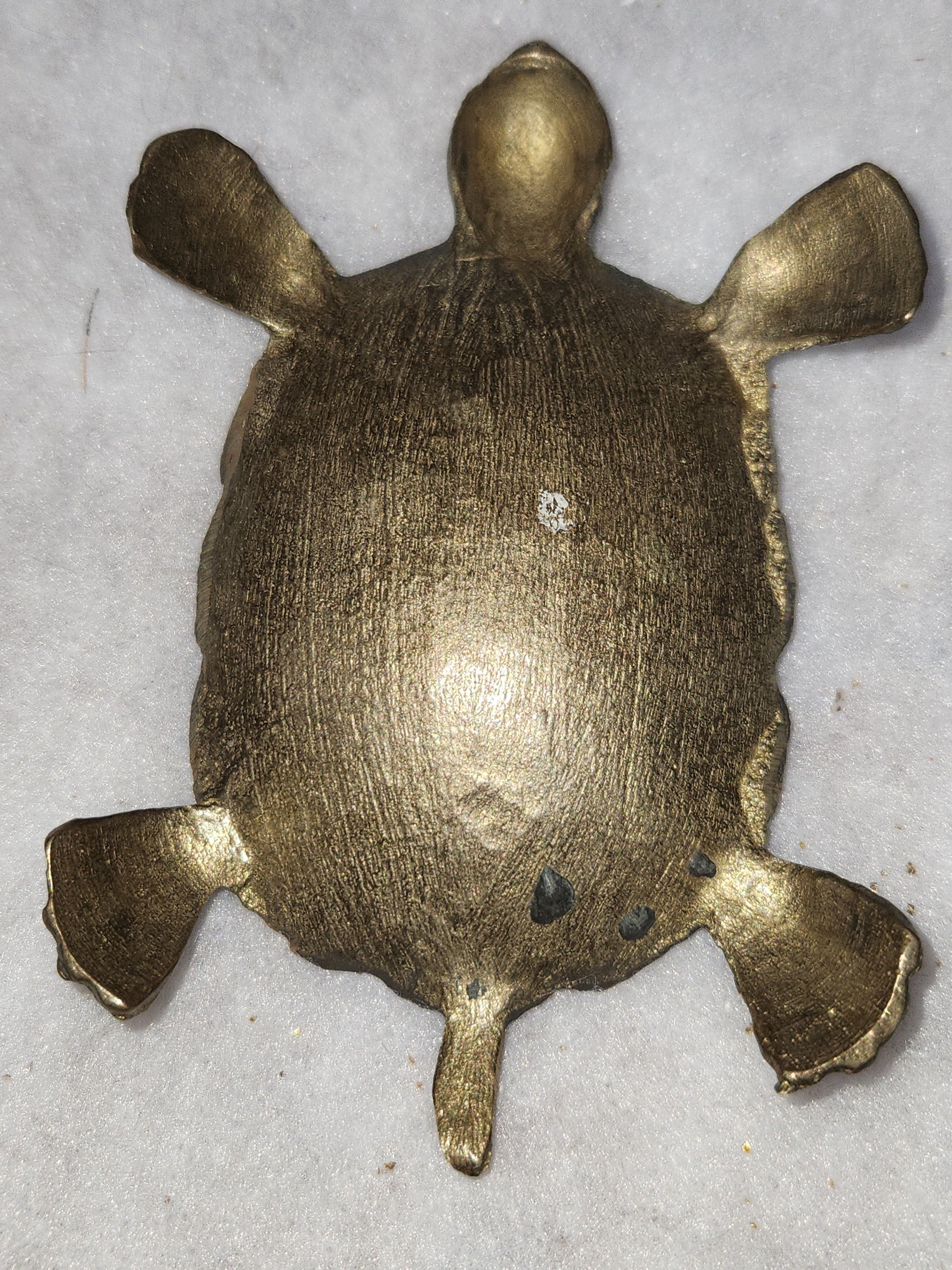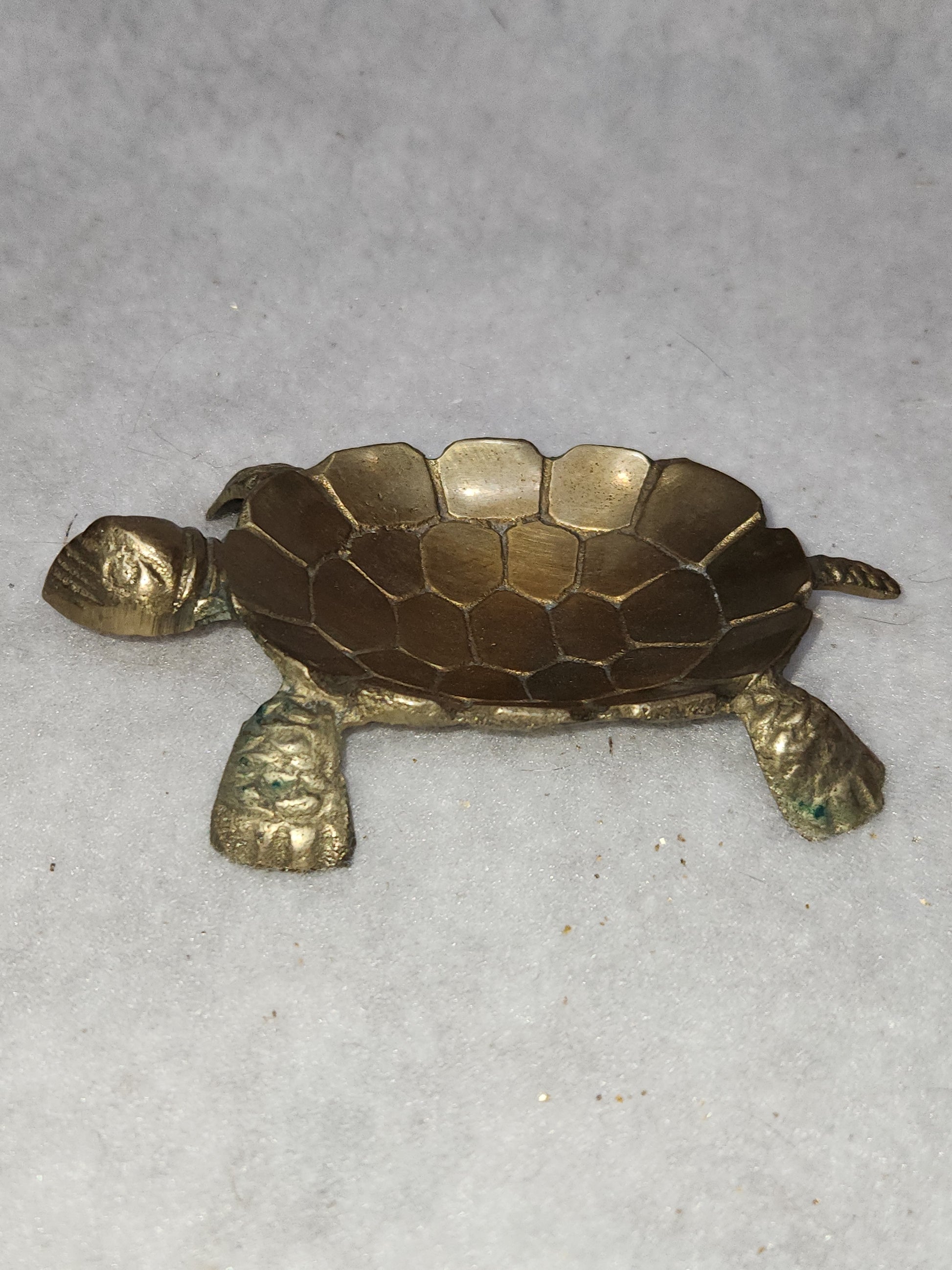 This is a vintage Brass turtle trinket tray, soap dish, ring dish. He is almost 5" long and 3 1/4" wide. I see no makers mark. Please see photos as they are part of the description