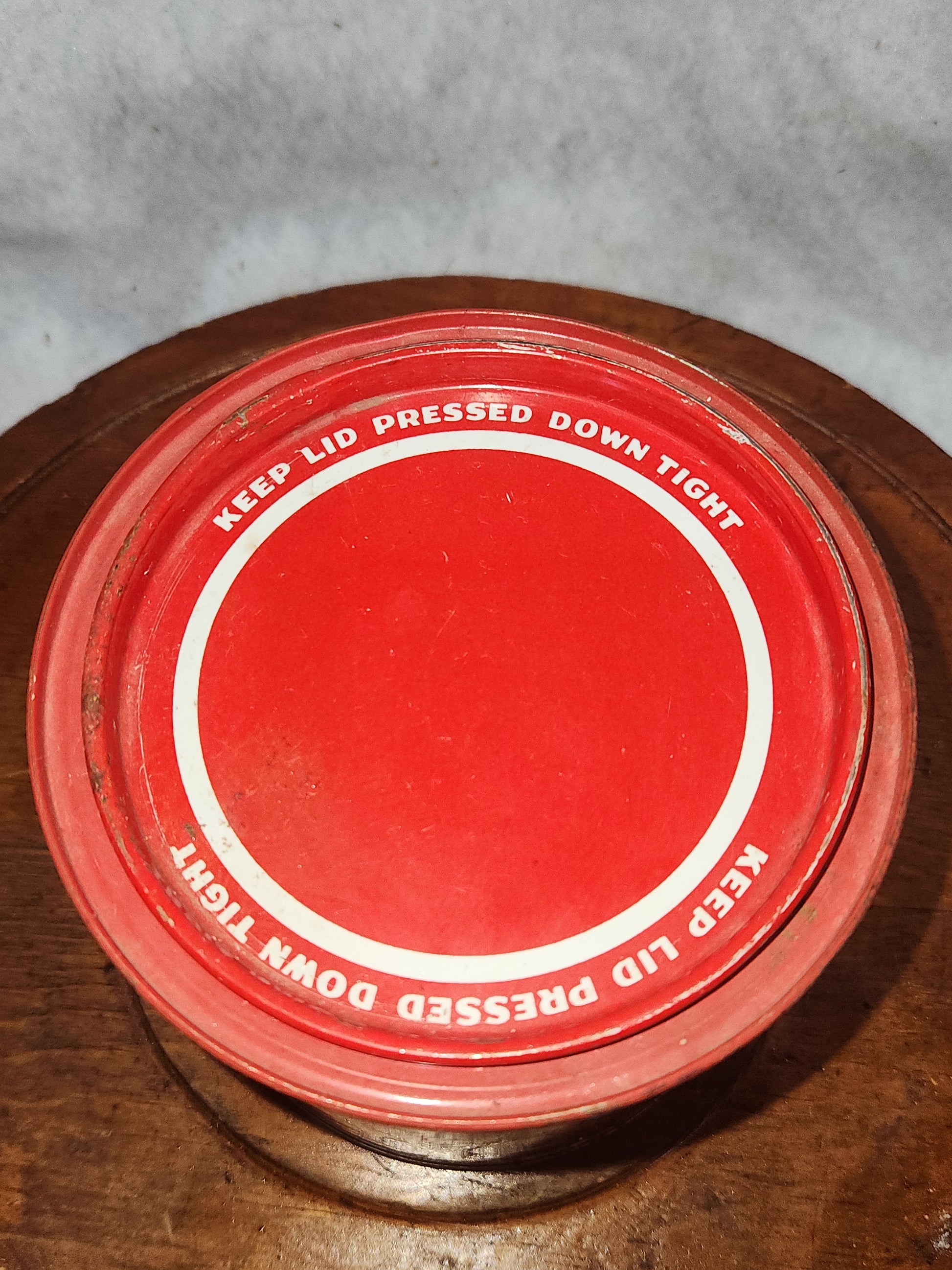 Union Leader tin 4 3/4" tall 5 1_4" diameter. It is empty. It is in good vintage condition. It has a few small scratches, and rust on the lid and bottom. It is missing it's can opener. Beautiful vivid colors! Please see photos.