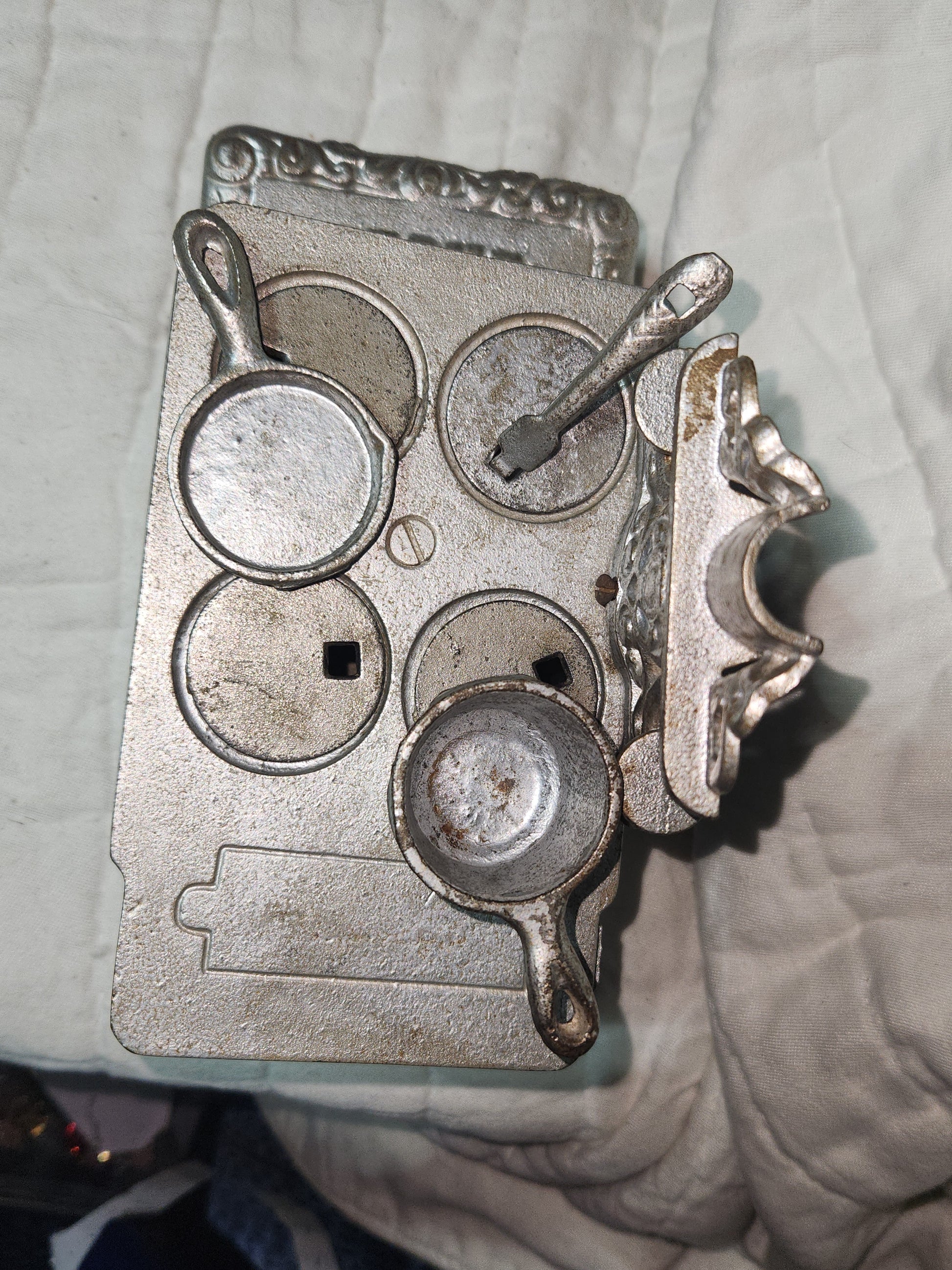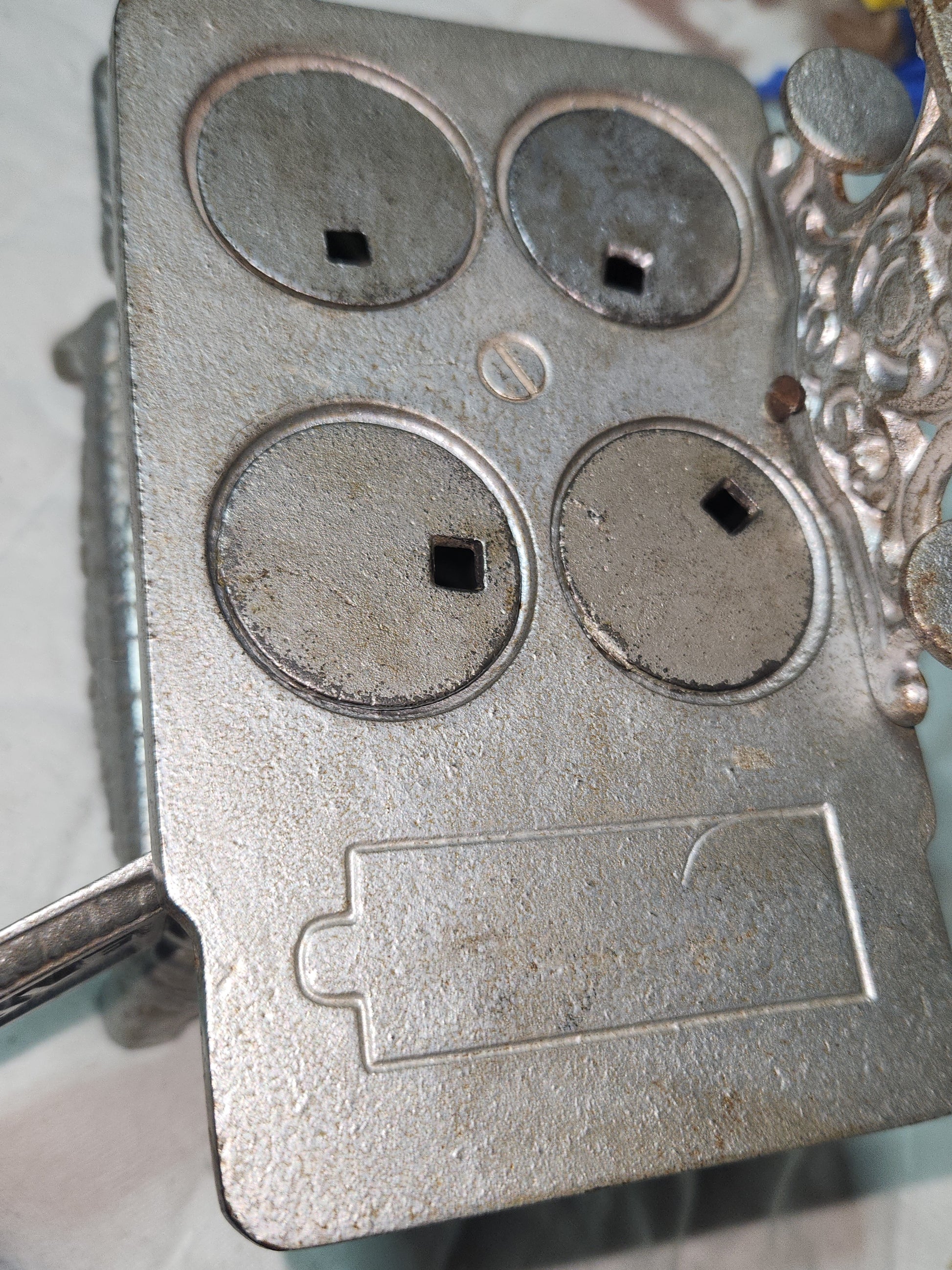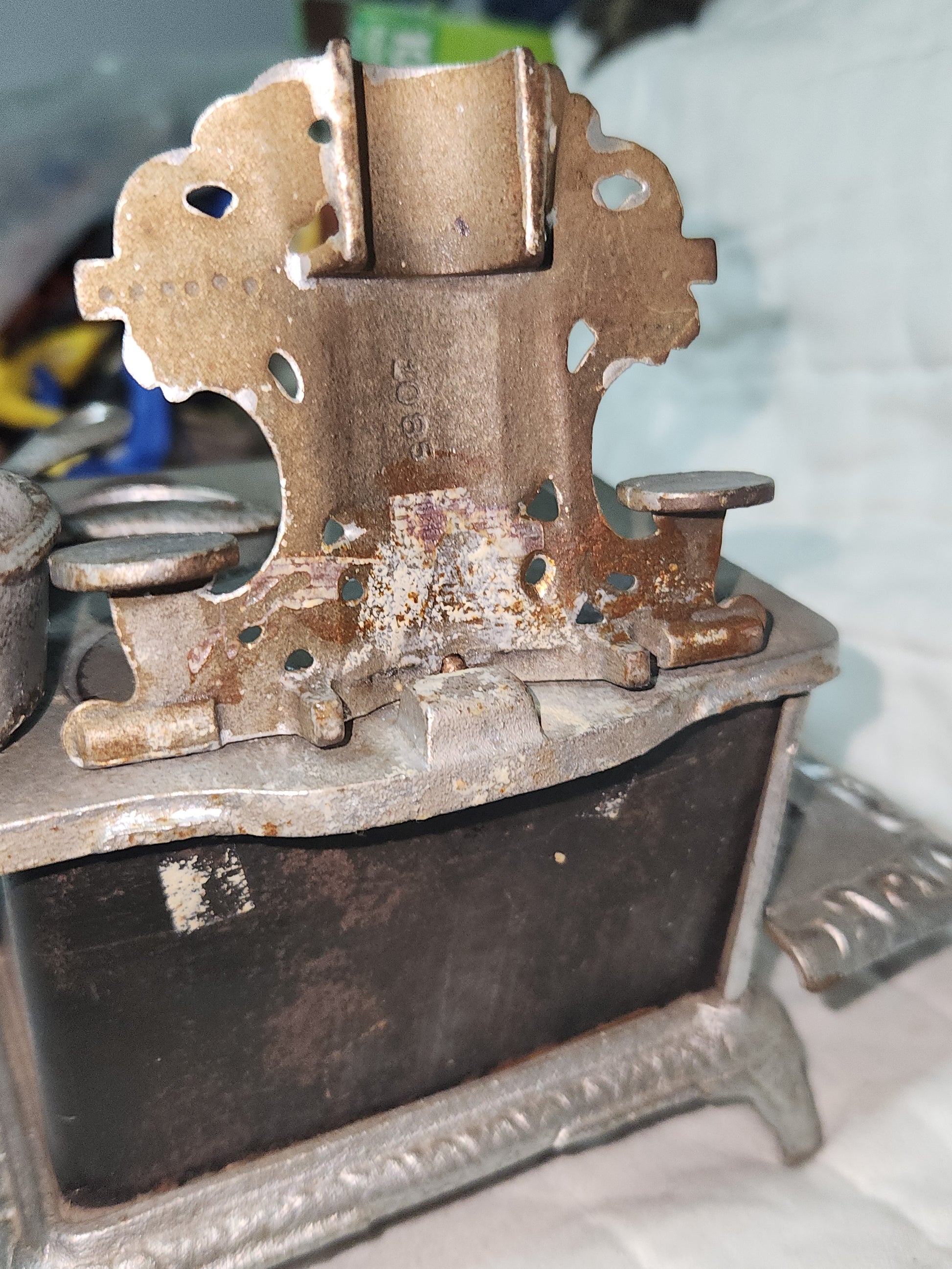 This is a Cast Iron Wood Burning Stove that was a salesman sample. The stove seems to be complete with four hot plates and the handle to lift them. The frying pan and sauce pan, the left side shelf. It has a back that seems to match but it has a screw not original but not old that holds it into its slot. This Stove is in good condition for its age, a few spots of paint loss and rust. It is heavy, nearly 3 pounds. It is 6 1/2" tall with the back piece 7 1/2" wide and 4 1/2" deep. Please see photos as they are part of the description.