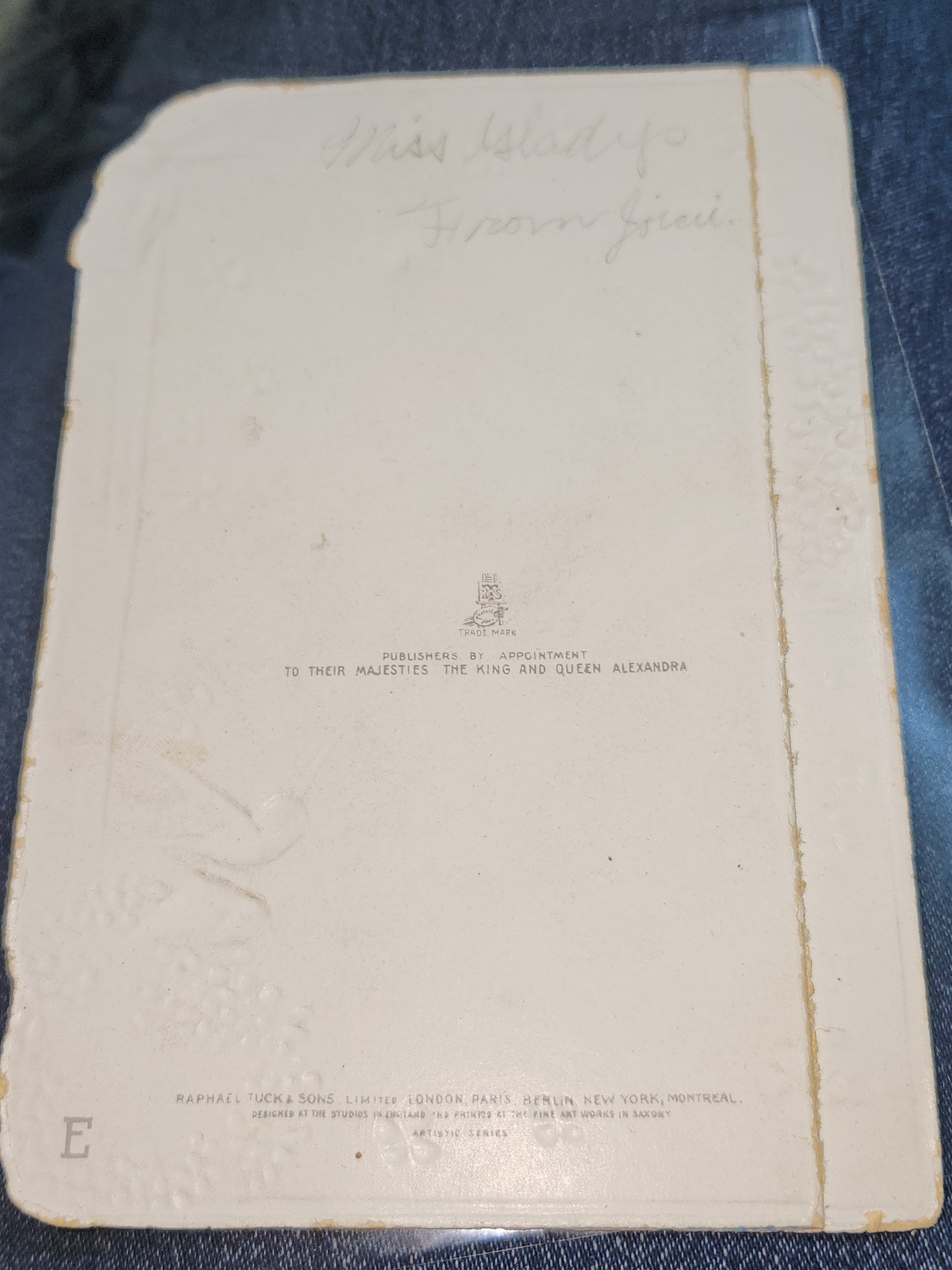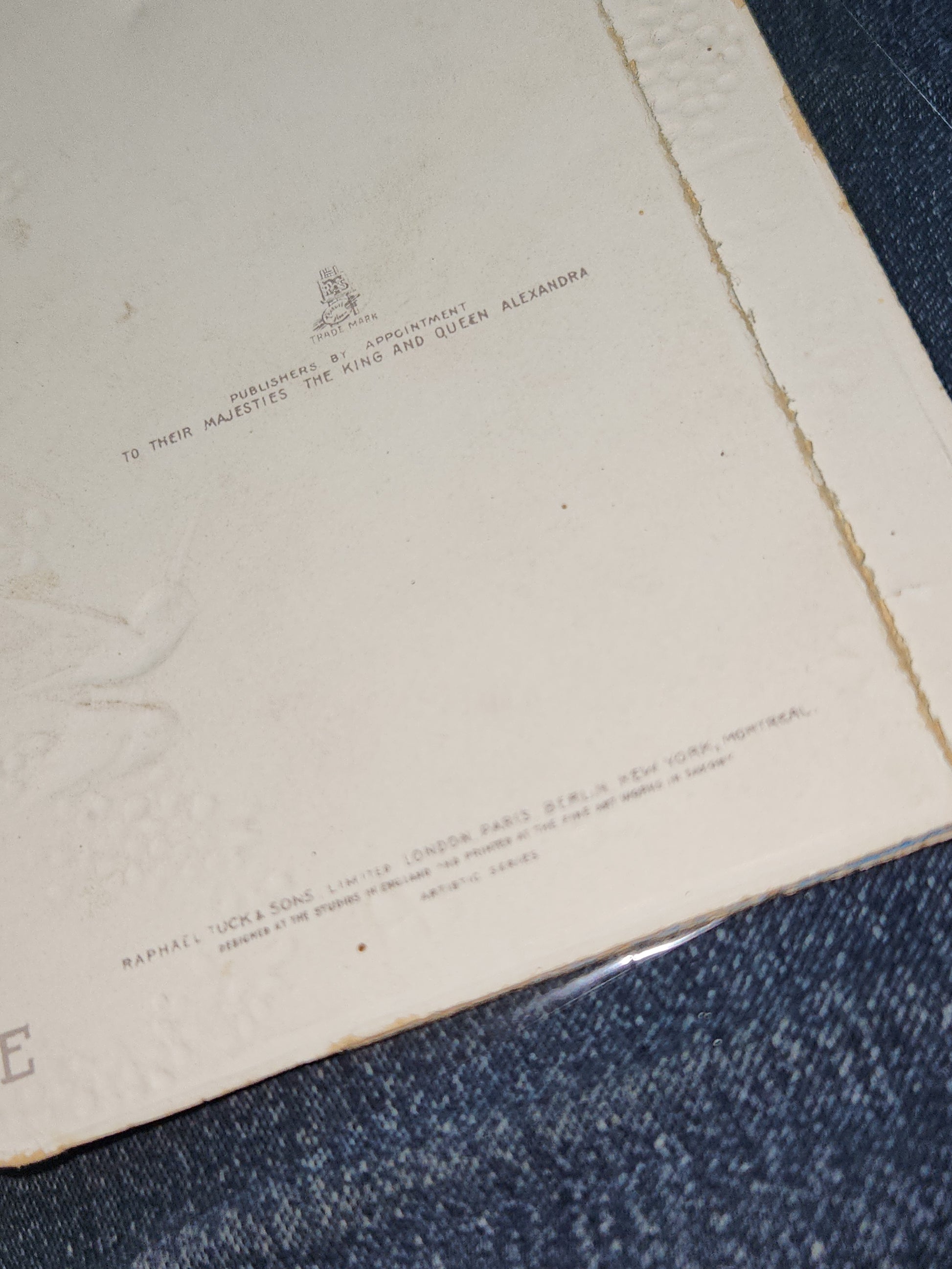 Antique Tuck & Sons Valentines Day Greeting Card Girl, gold birds, blue flowers, Kind Thoughts