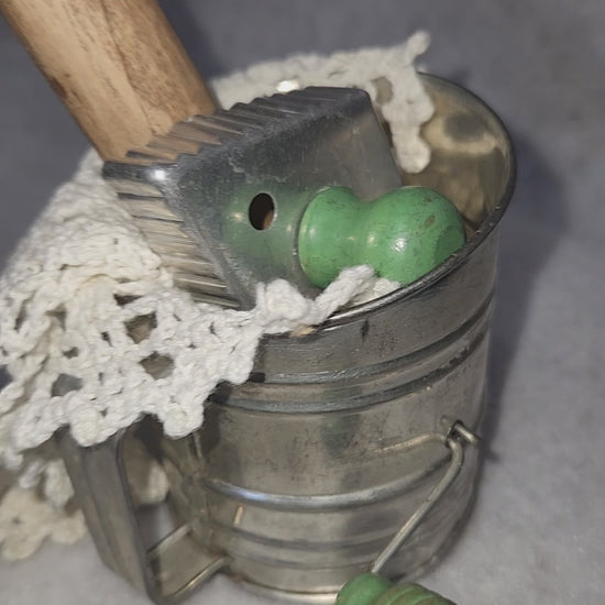 This assemblage is my work acquiring the items and placing them together. Everything is vintage except the rolling pin, it is new, and on the other side it says Fa La La La. At Christmas time turn the pin around and add a cinnamon stick and old glass ornament or a christmas cookie cutter. Nothing is glued down. The flour sifter is tiny it is only 3 1/2" tall to its lip and diameter of just under 3" if purchasing please take a screen shot so you can assemble it if it comes apart. See photos as they are part of the description.