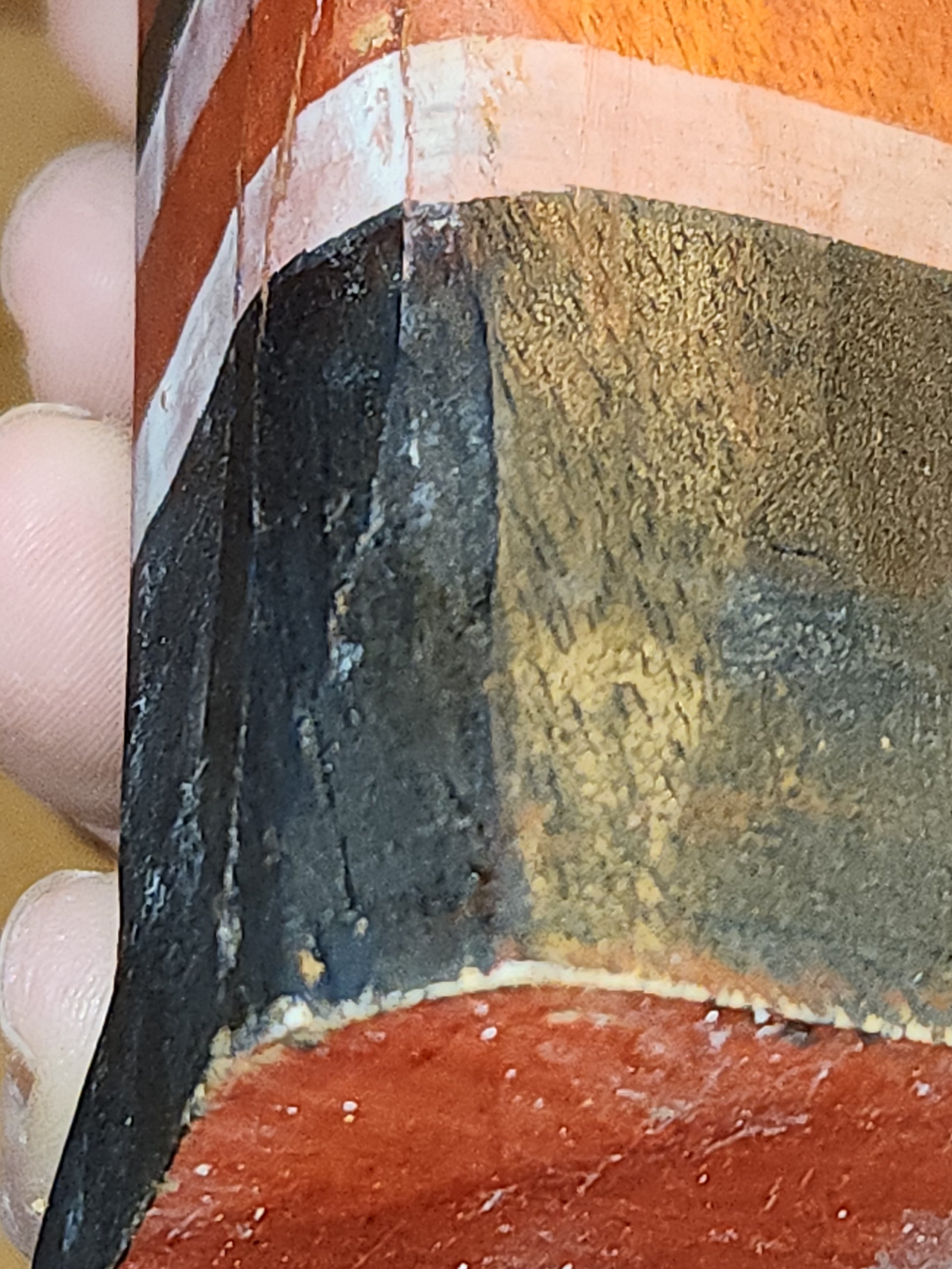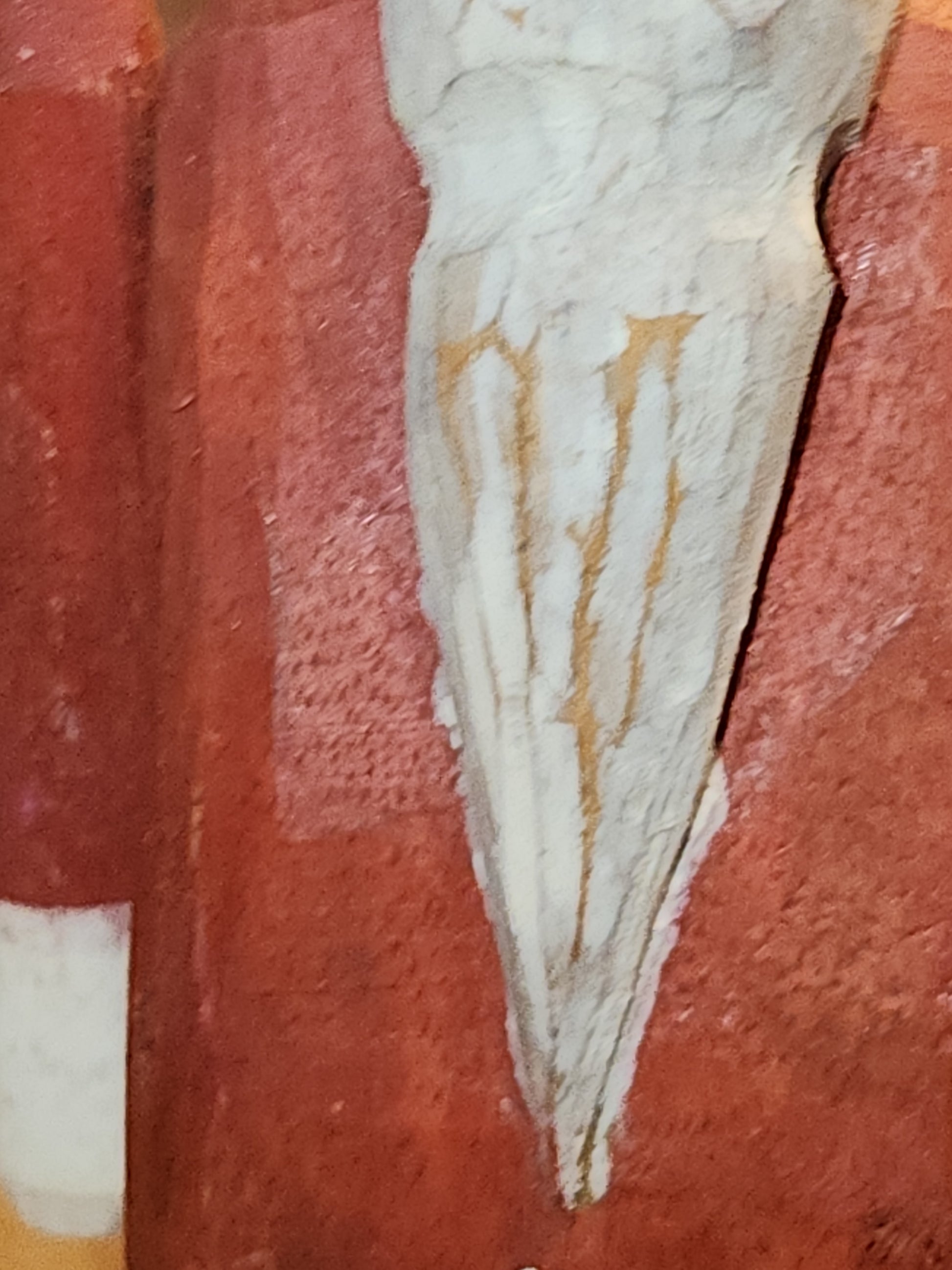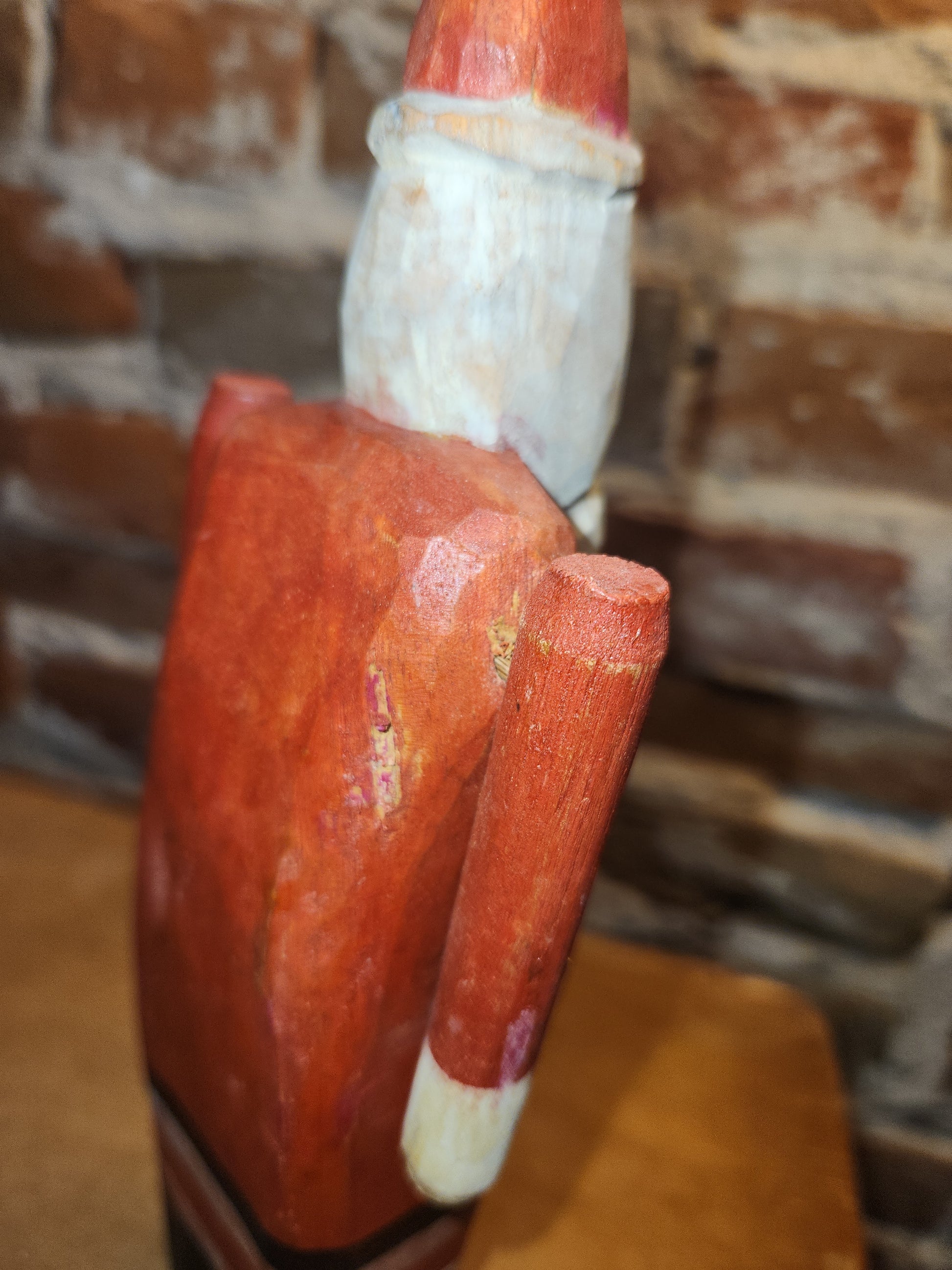 This wooden santa is 9 3/4" tall at his base he is 2 1/4" wide 1 1/2" deep. I do not know for a fact it is vintage, he just came to us, he certainly looks vintage. His arms move, but also come out, that is why they can move. He looks really cool and I don't see any chips, or cracks. His paint is primitave and aged. Please look closely at photos as they are part of the description and show you what you will recieve.