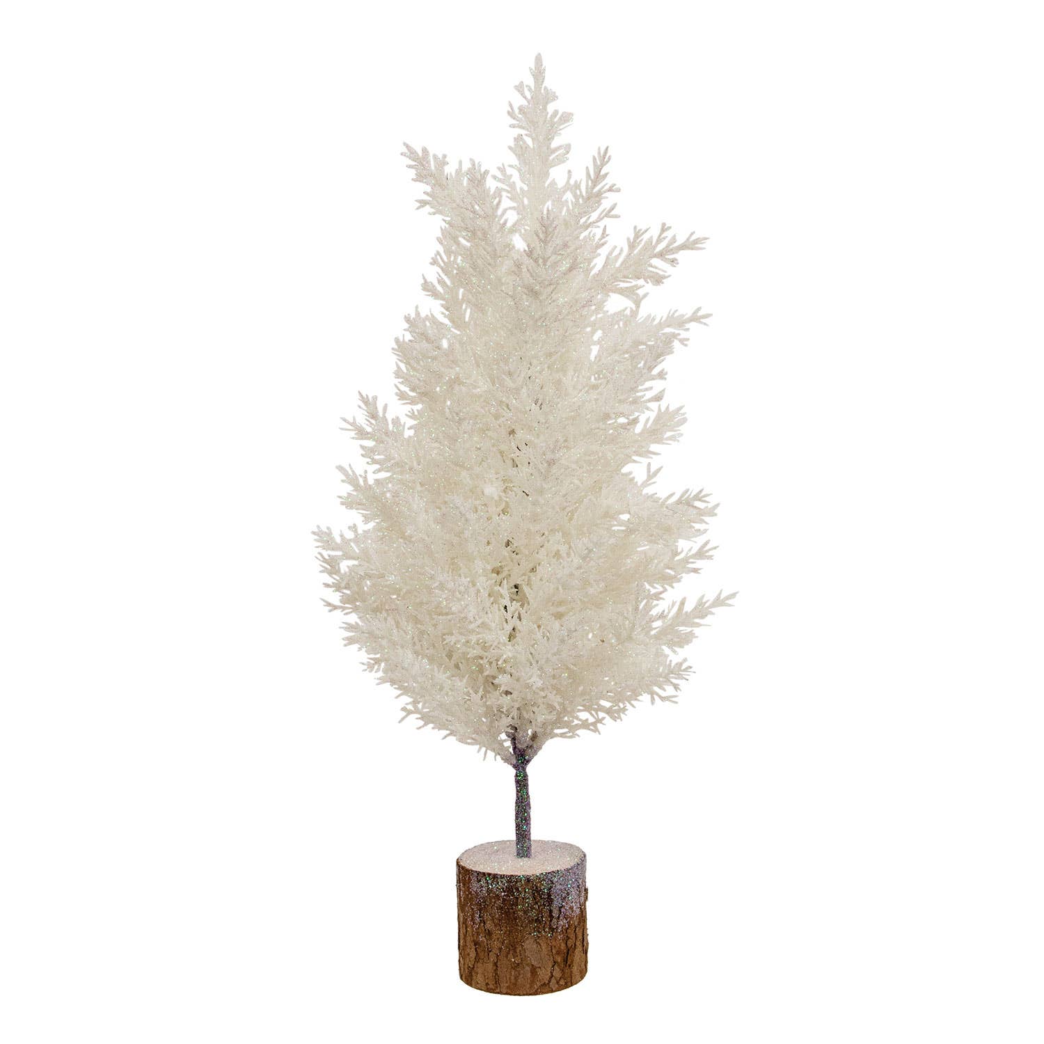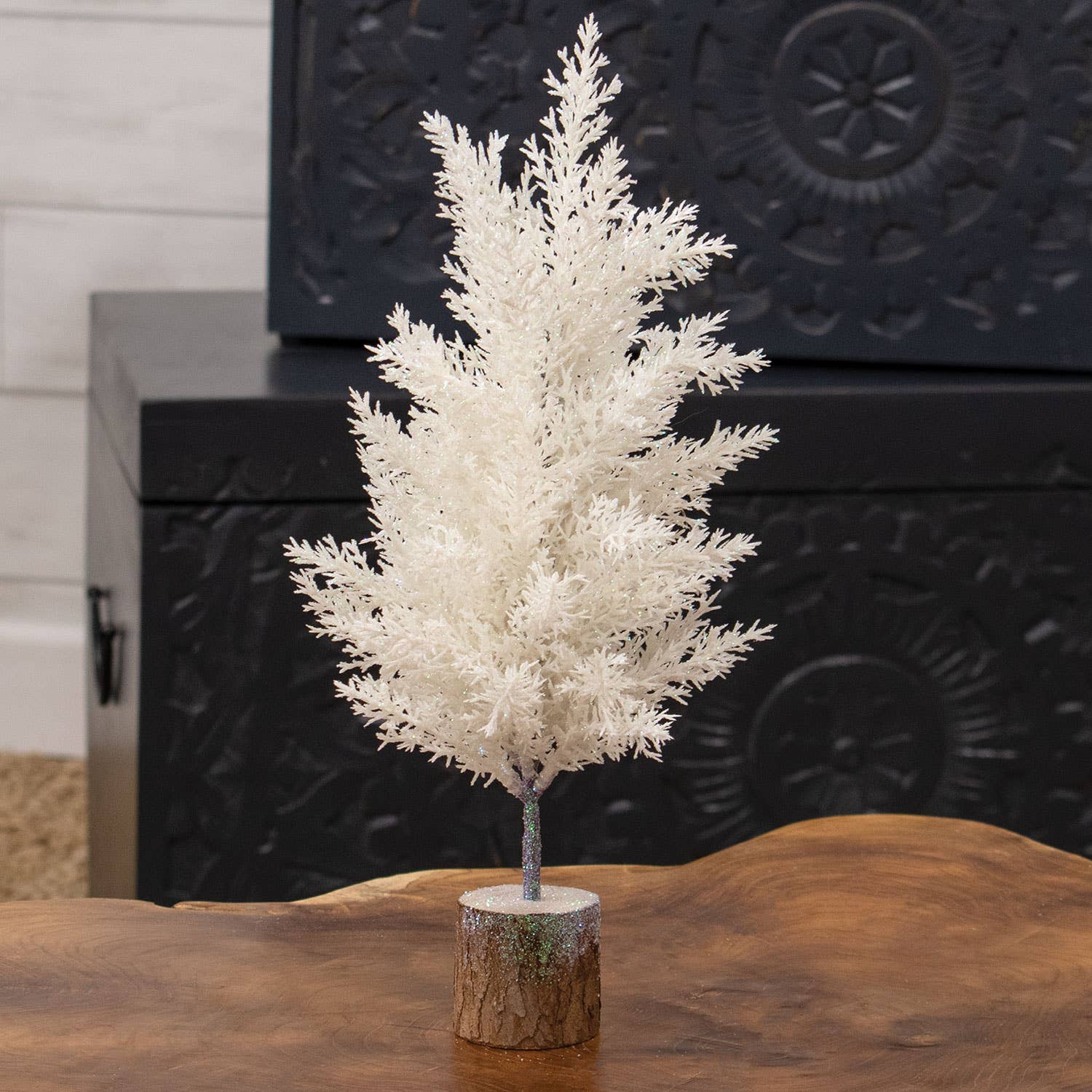 The farmhouse will be full of frosty sparkle this Winter with the Frosty Dreams Spruce Tree, 20". This 20" tall tree features white spruce-style plastic branches with a generous coating of iridescent white glitter. It is secured to a 2.25" diameter natural wood cylinder base with intact bark for a natural feel. This tree makes a beautiful accent to a variety of displays and takes the charm to a whole other level when wrapped in white or colored bud lights!