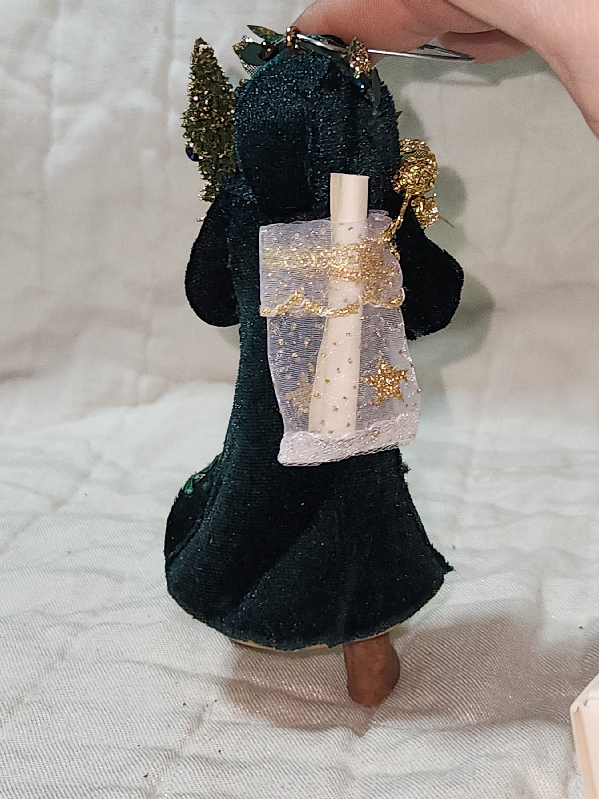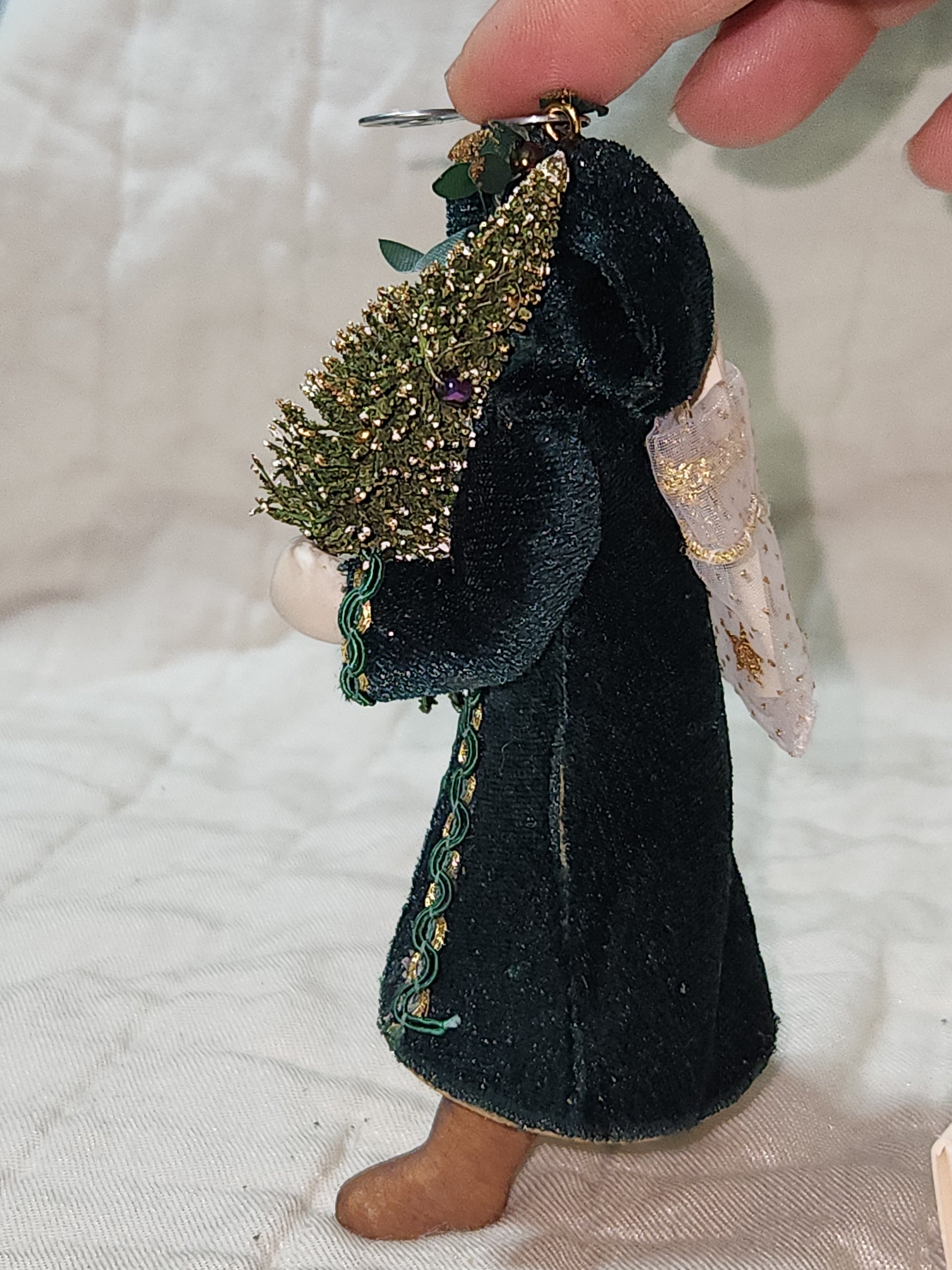 This ornament has a soft velvet coat and fabric bag on its back. It is in good condition. It is in a plastic holder in its original box. Please see photos as they are part of the description.