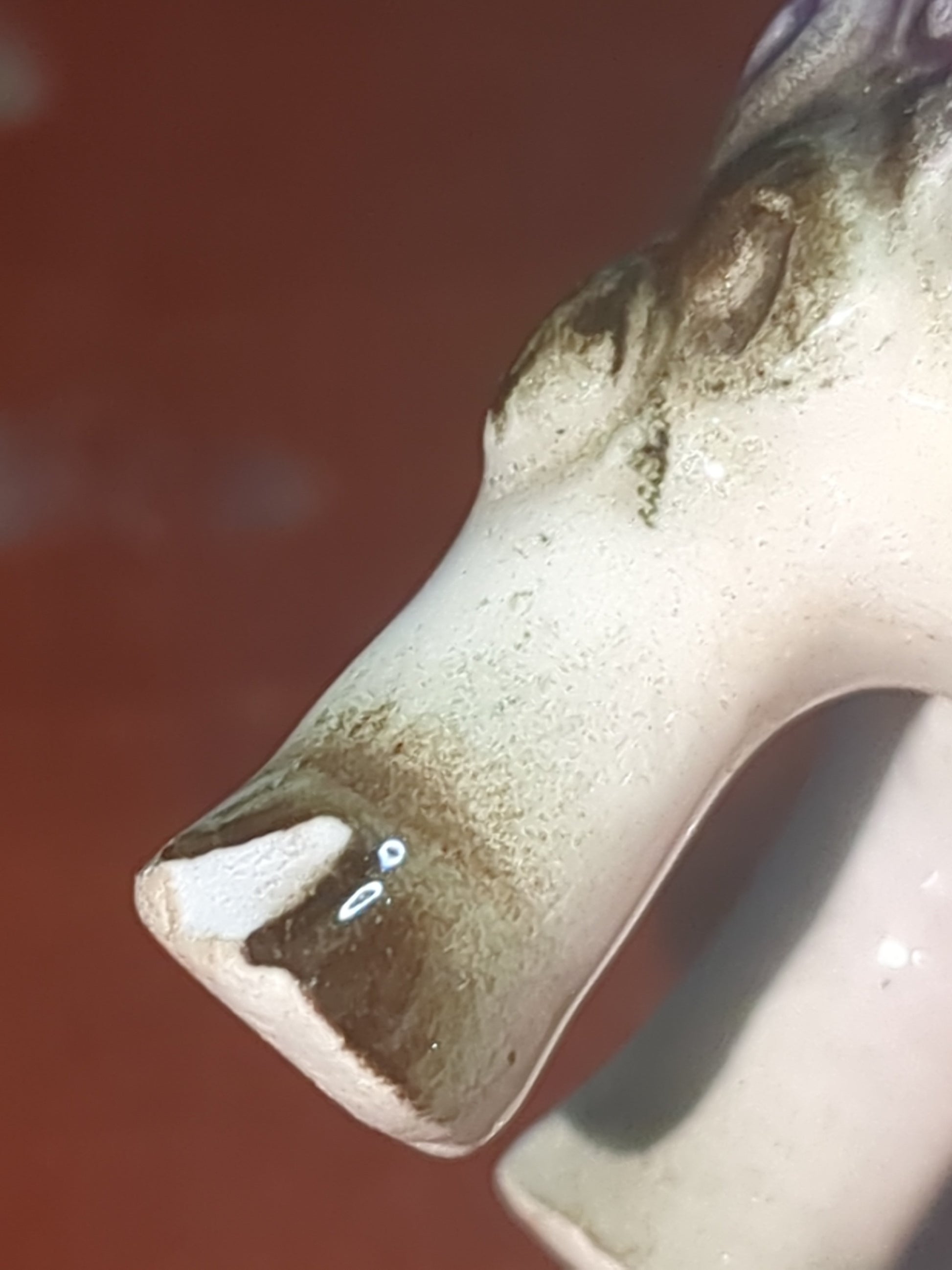 This is a hand painted porcelain lamp or sheep with swirls in its fur and a bow on its tail. It's facial expression is quite humorous. It is stamped with 29 on the bottom. I do not see any cracks but it does have a chip on its hoof, I see nothing else wrong. Please see the photos as they are part of the description