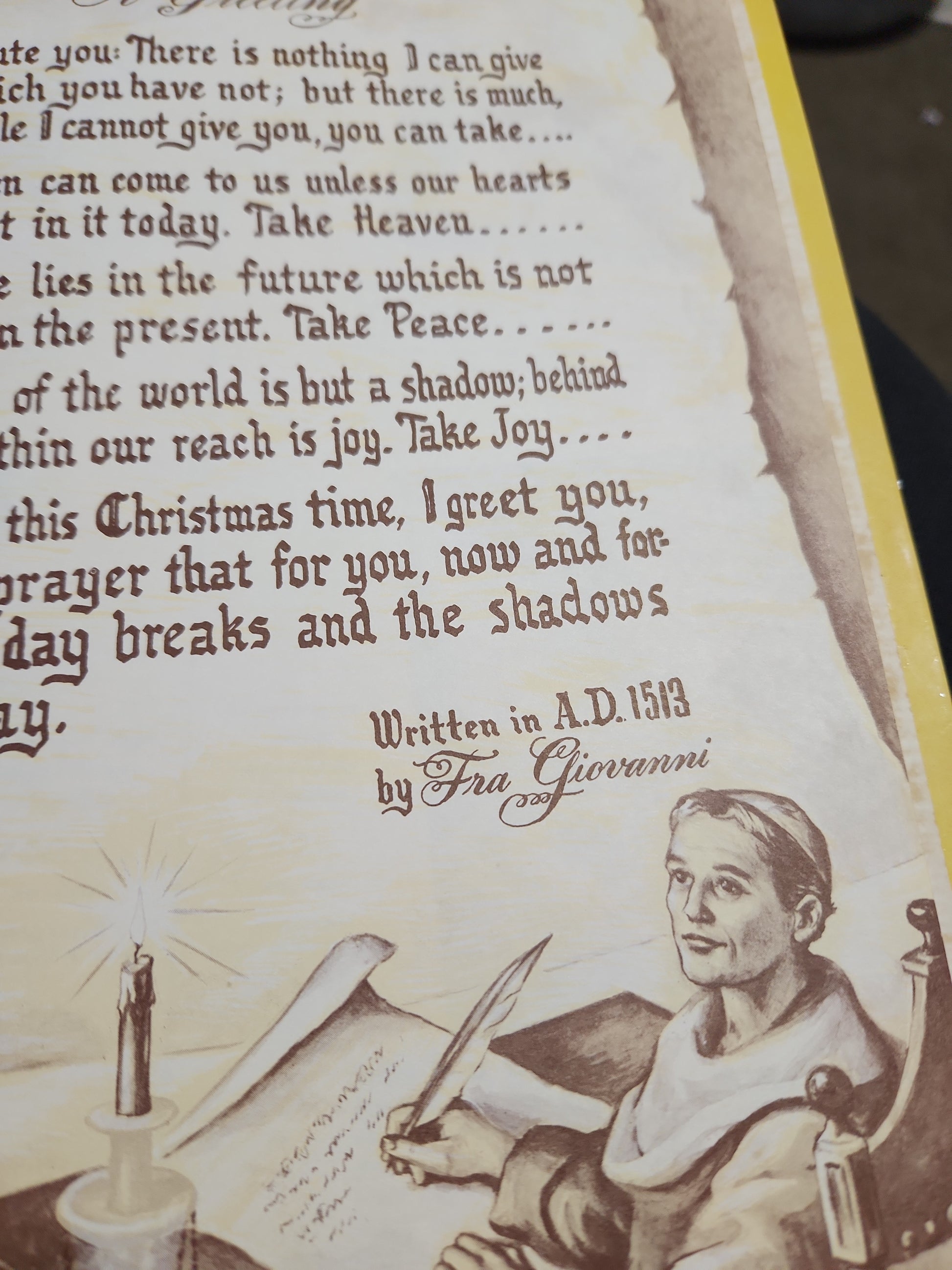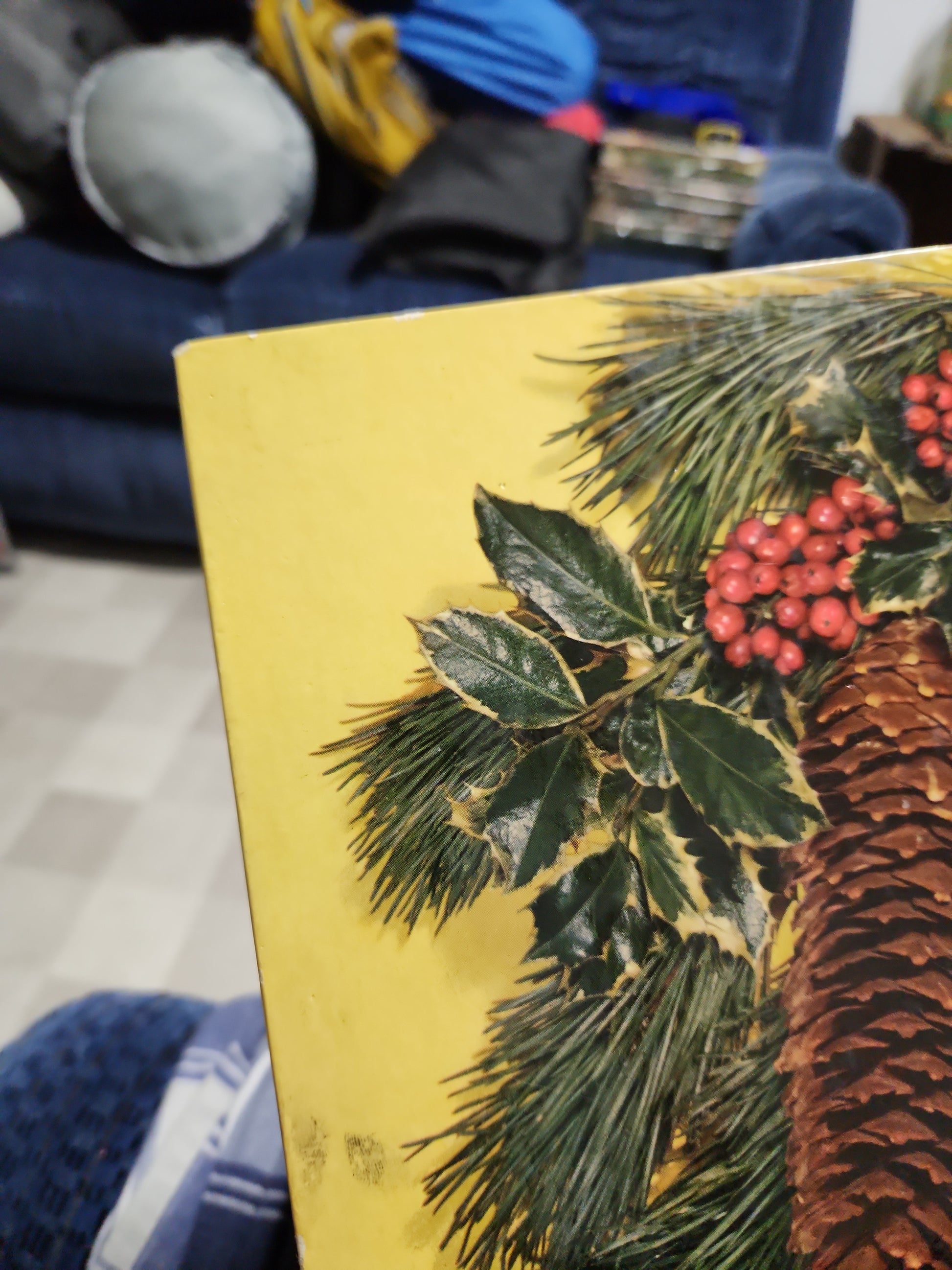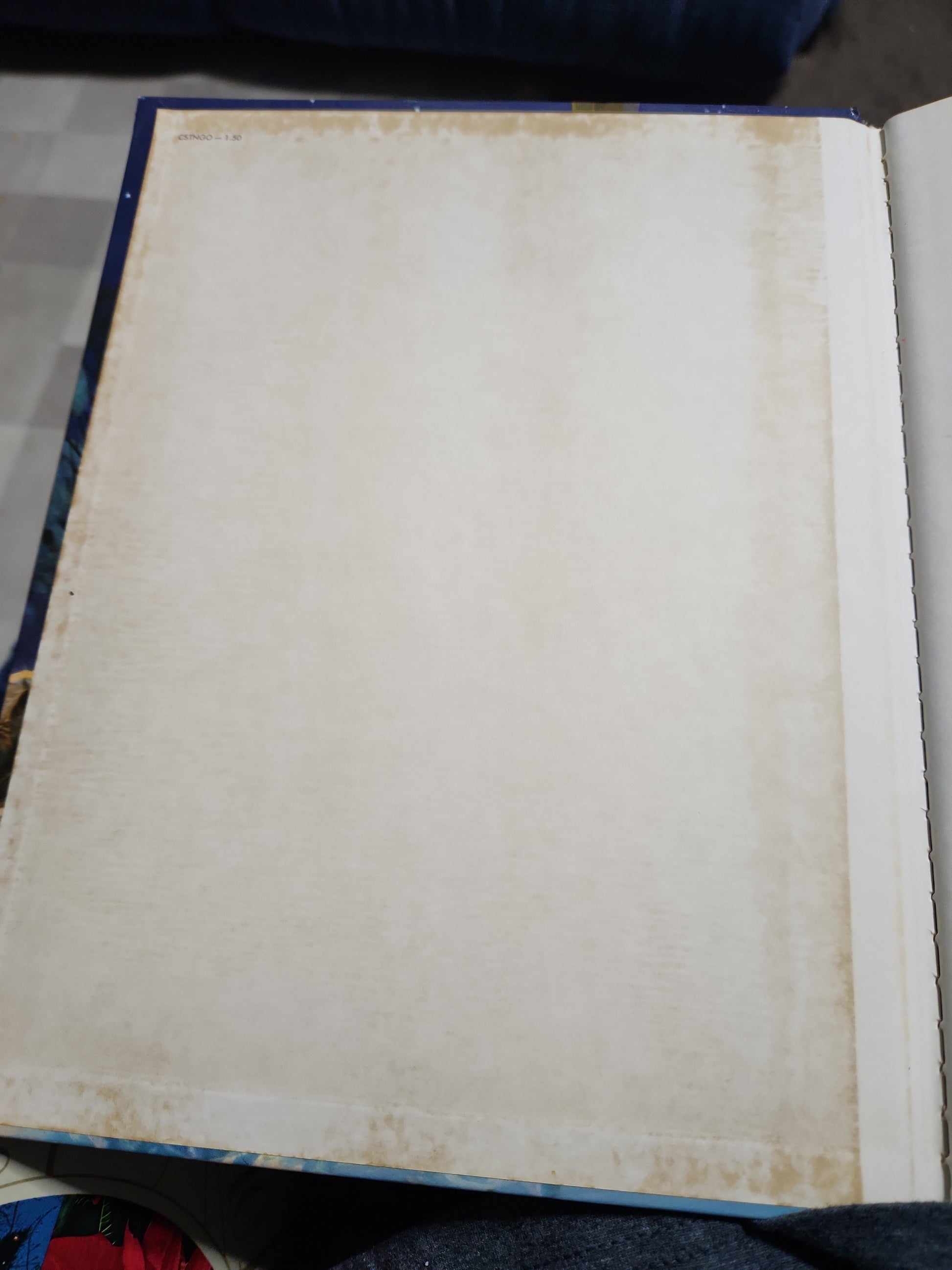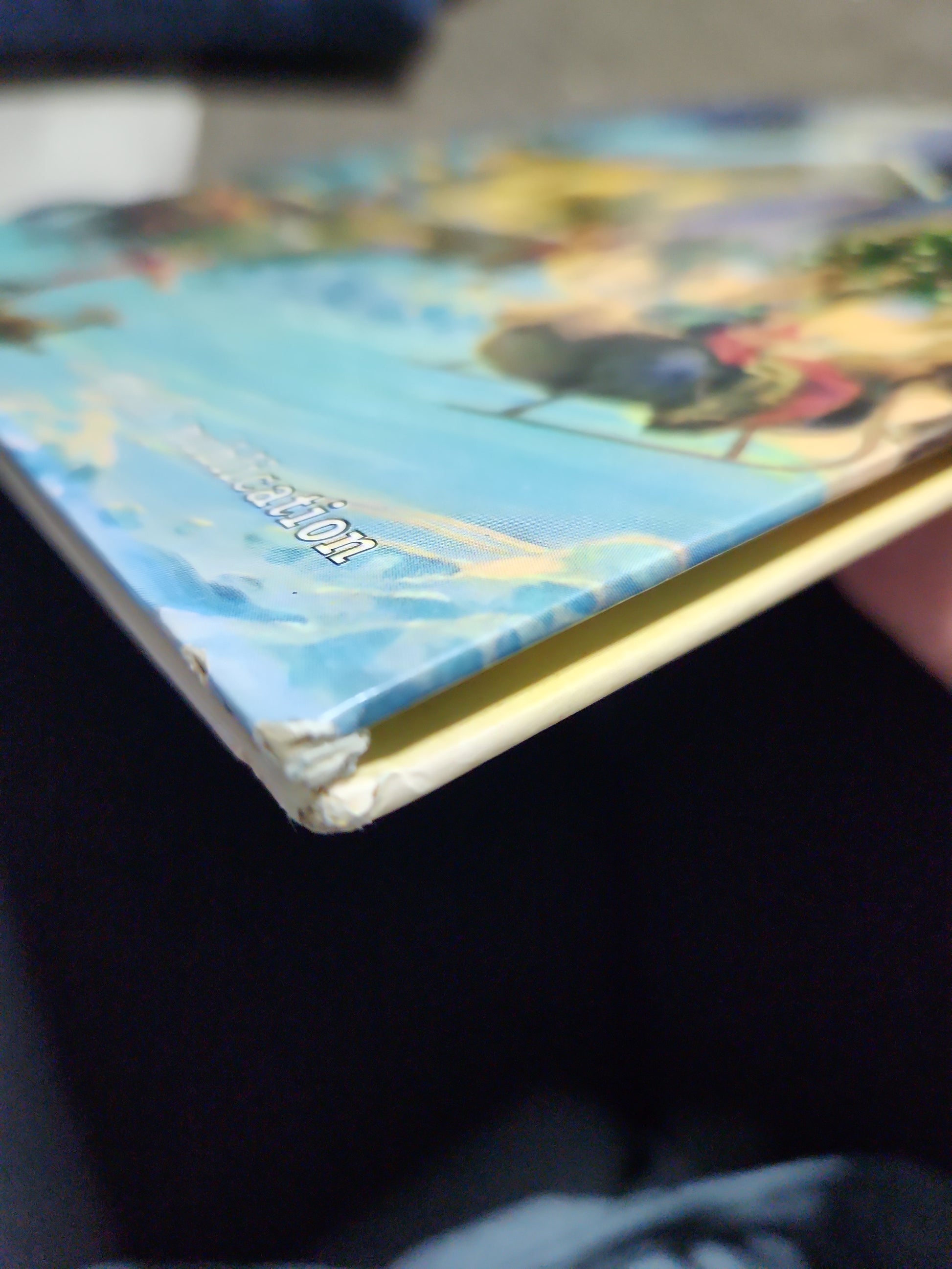 The inside pages of this book are in good condition, I don't see any major rips, stains or wear. The front and back cover have a lot of shelf wear with tears to the corners and edges. There is some staining inside cover and some on back cover. It is a neat book worth reading with your loved ones at Christmas. Please see photos.