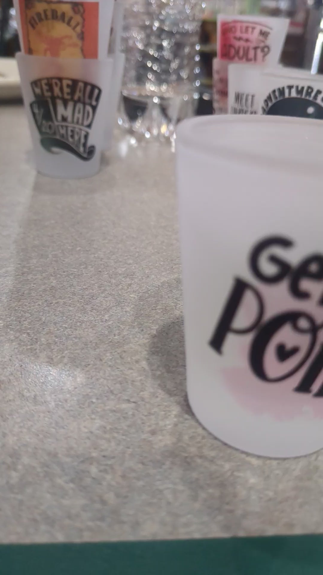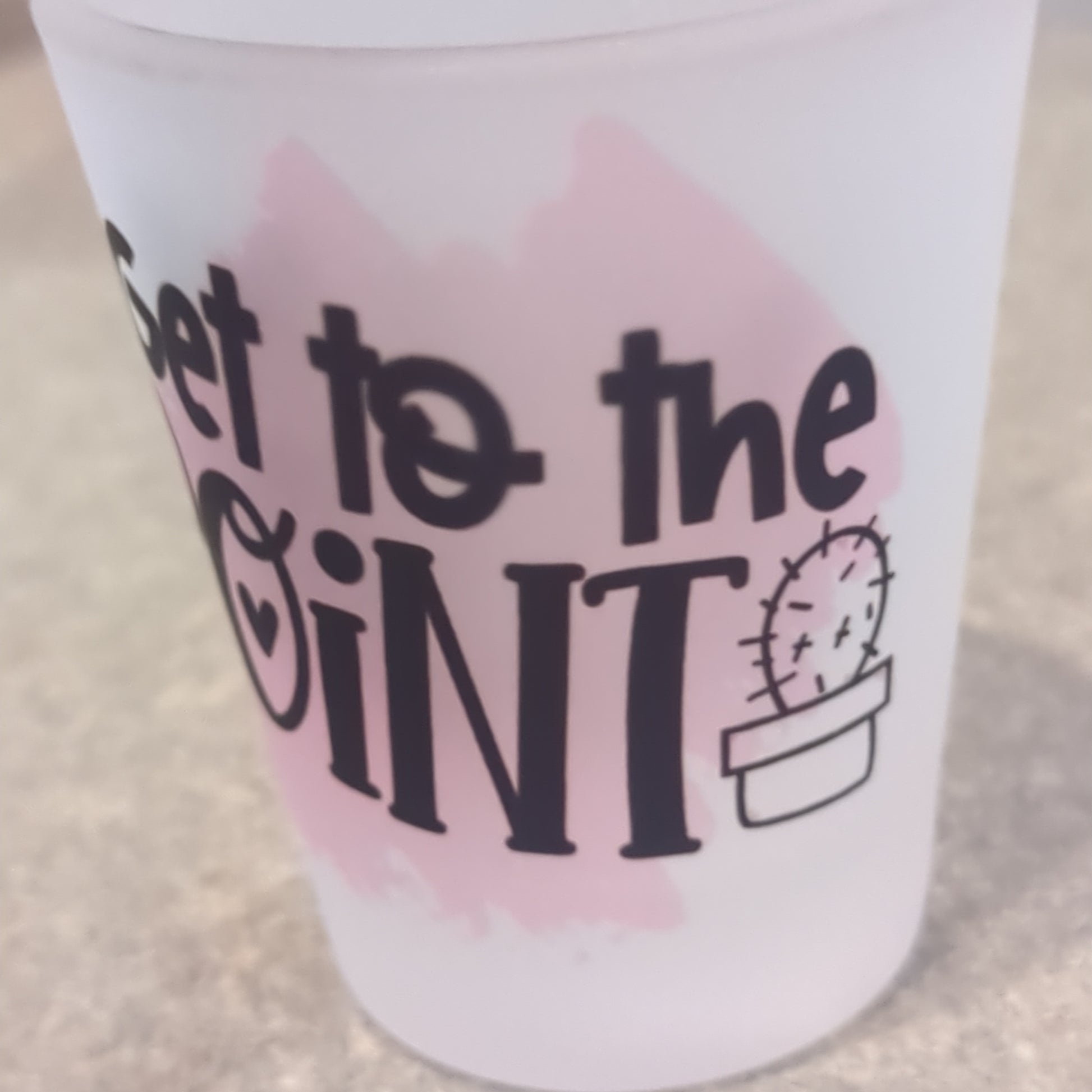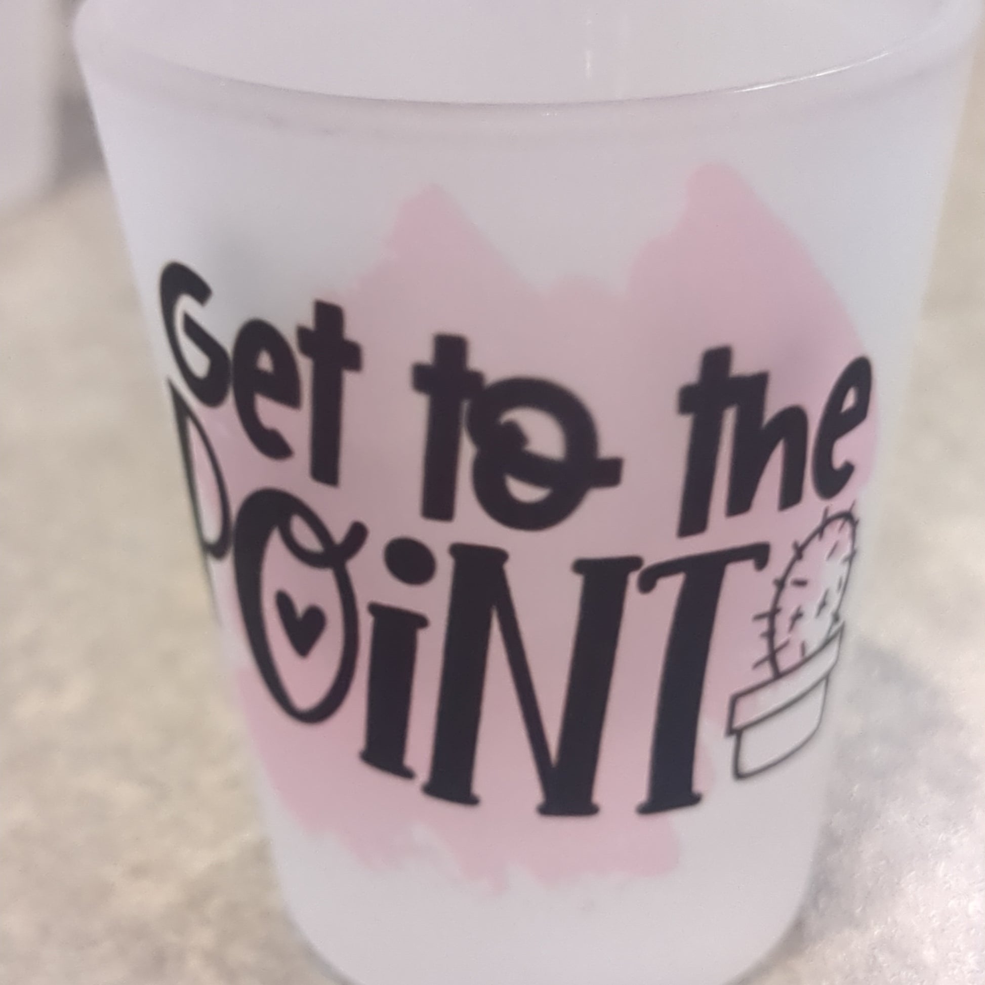 Frosted glass shot glass. It is imperfect and thus at reduced price