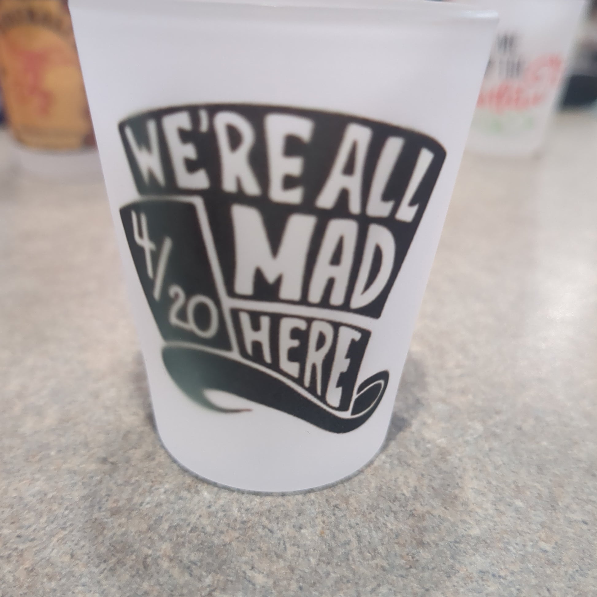 Frosted glass shot glass. It is imperfect and thus at reduced price