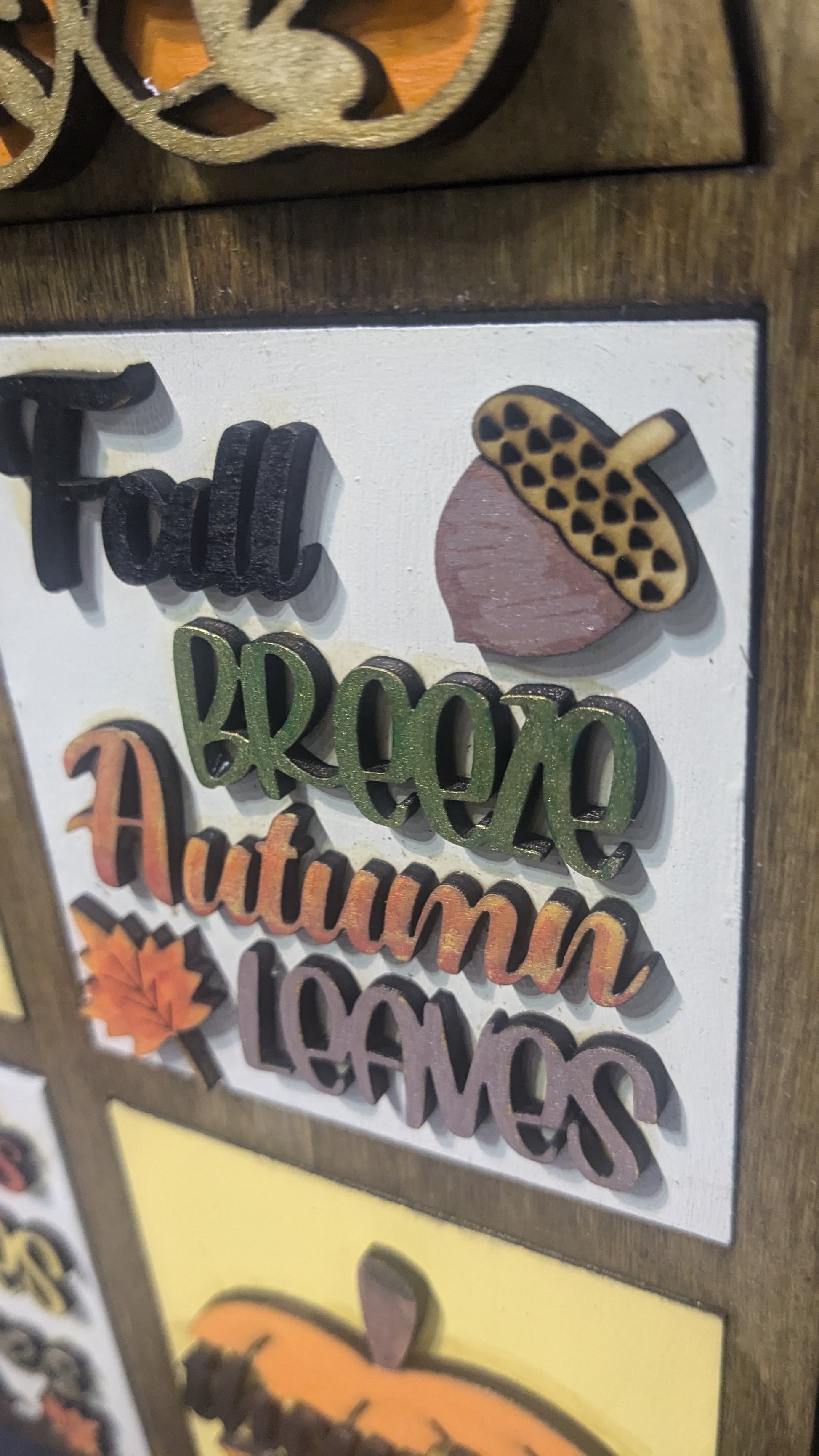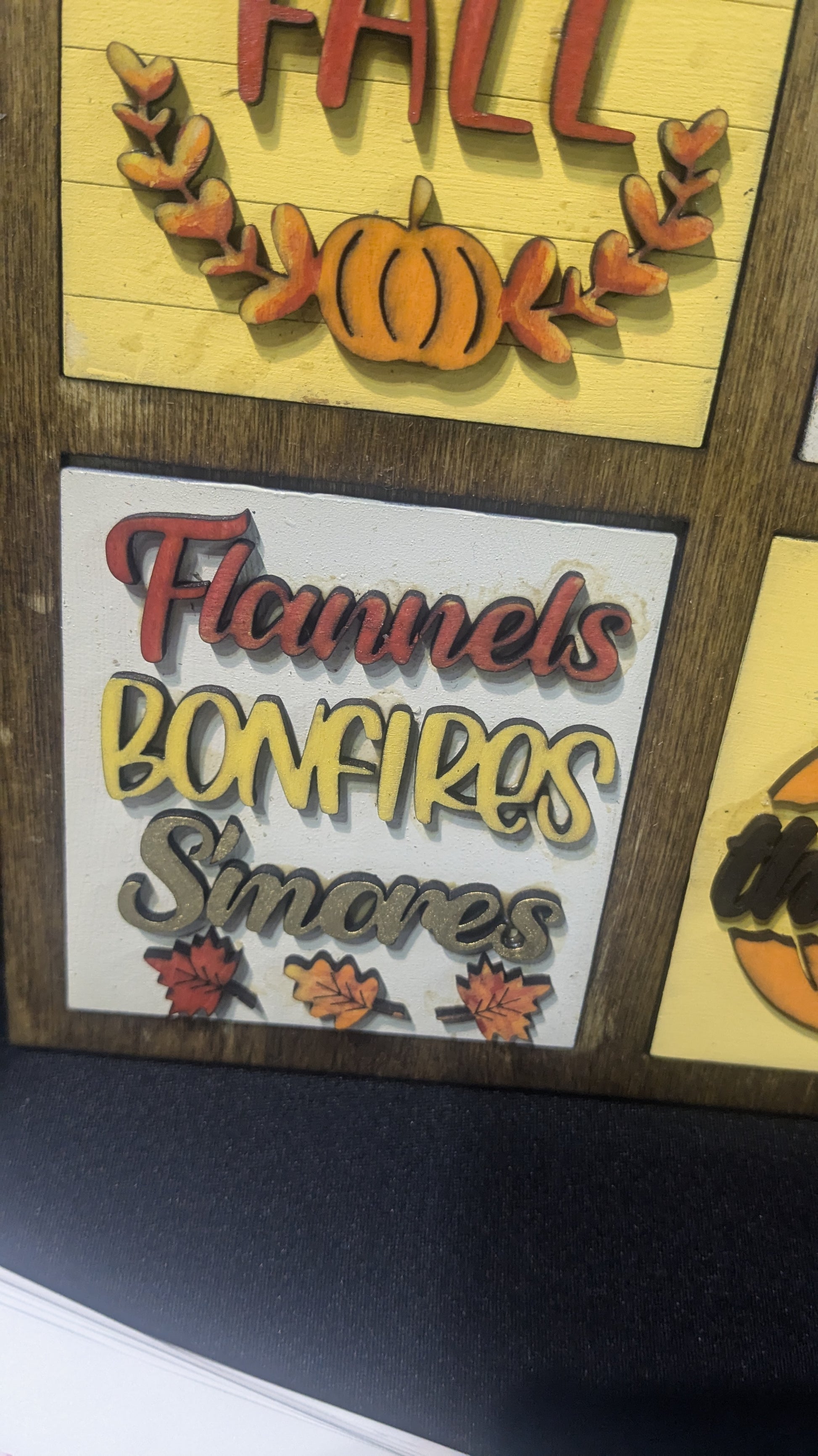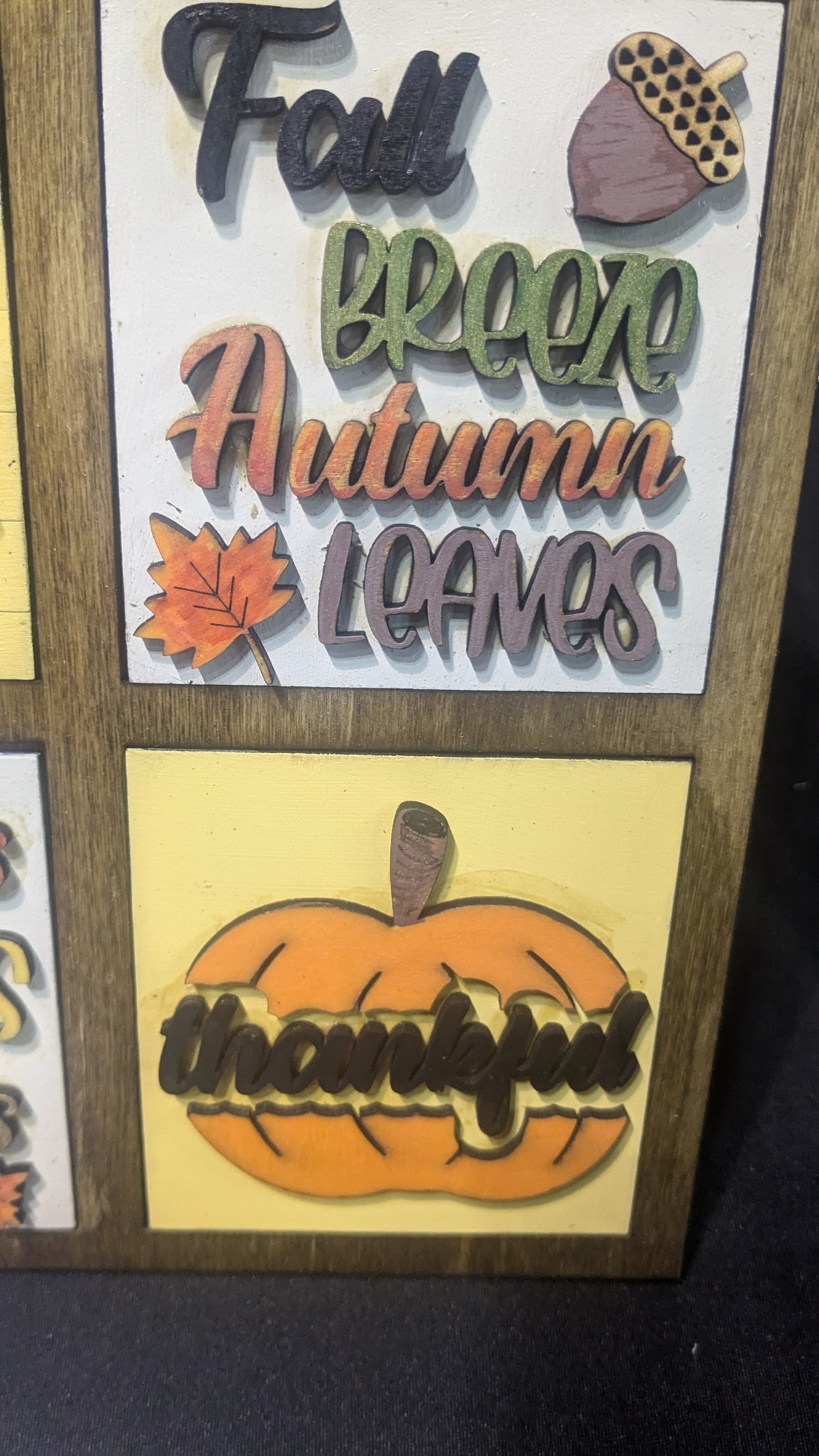 Each frame is made from balsa wood has 6 squares. It is 14.5 inches tall and includes a wall hanger and a frame stand, but it can easily lean on the wall. If hanging in the wall we recommend adding a small piece of double sided sticky tape to each square to help it hold.