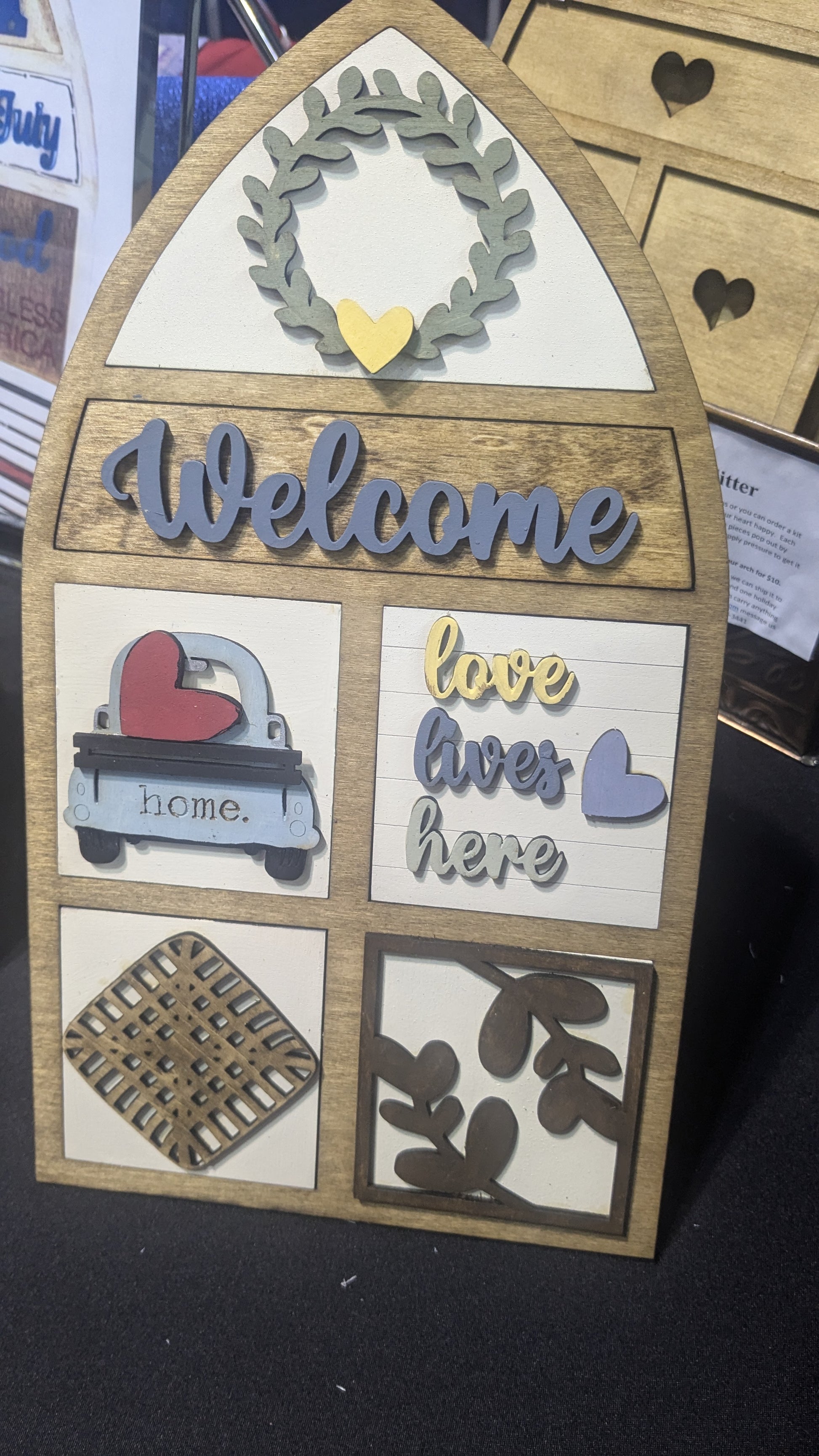 Each frame is made from balsa wood has 6 squares. It is 14.5 inches tall and includes a wall hanger and a frame stand, but it can easily lean on the wall. If hanging in the wall we recommend adding a small piece of double sided sticky tape to each square to help it hold.