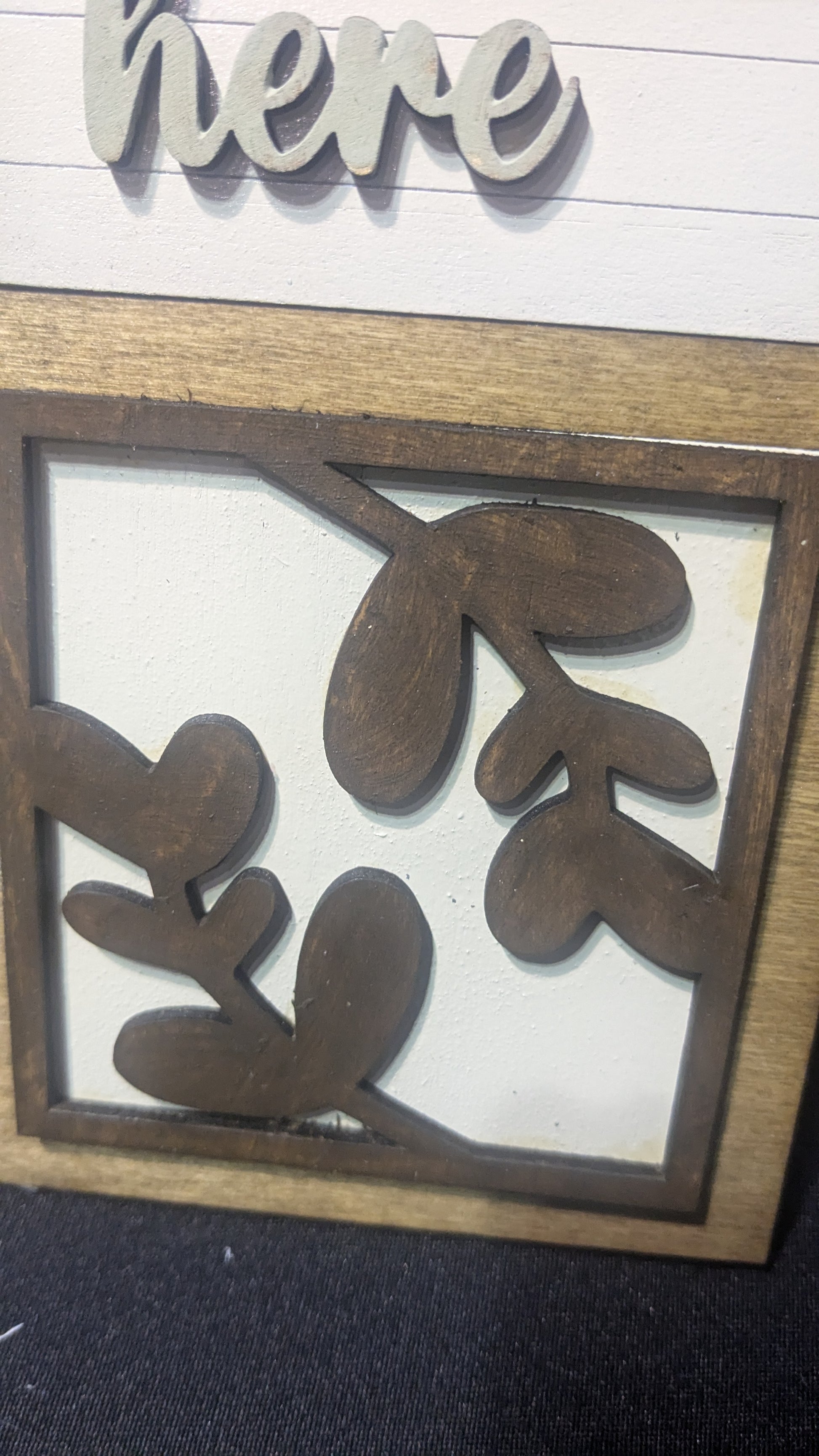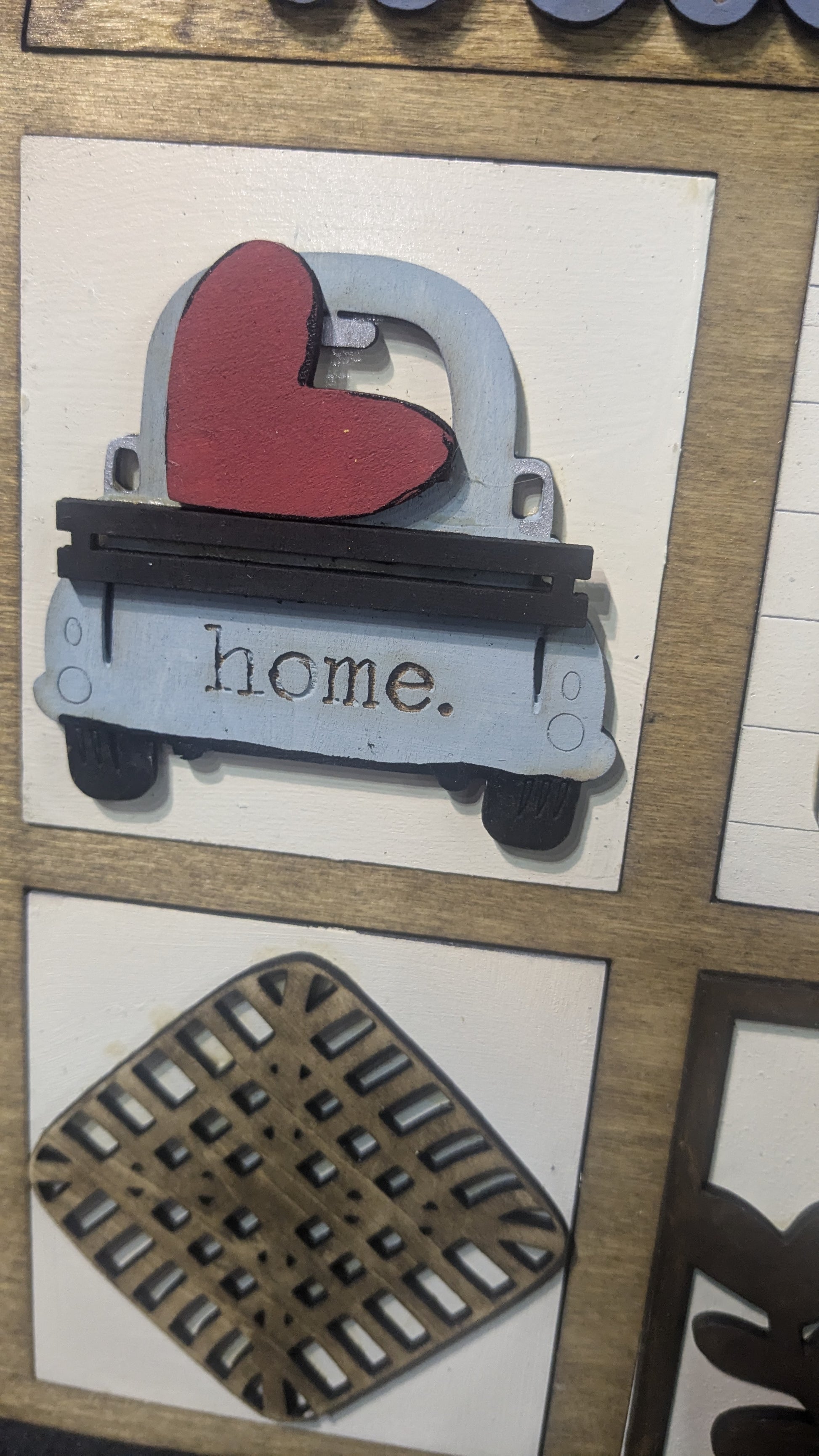 Each frame is made from balsa wood has 6 squares. It is 14.5 inches tall and includes a wall hanger and a frame stand, but it can easily lean on the wall. If hanging in the wall we recommend adding a small piece of double sided sticky tape to each square to help it hold.