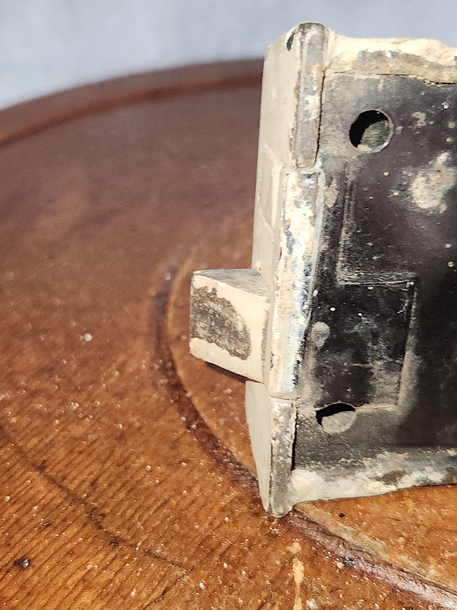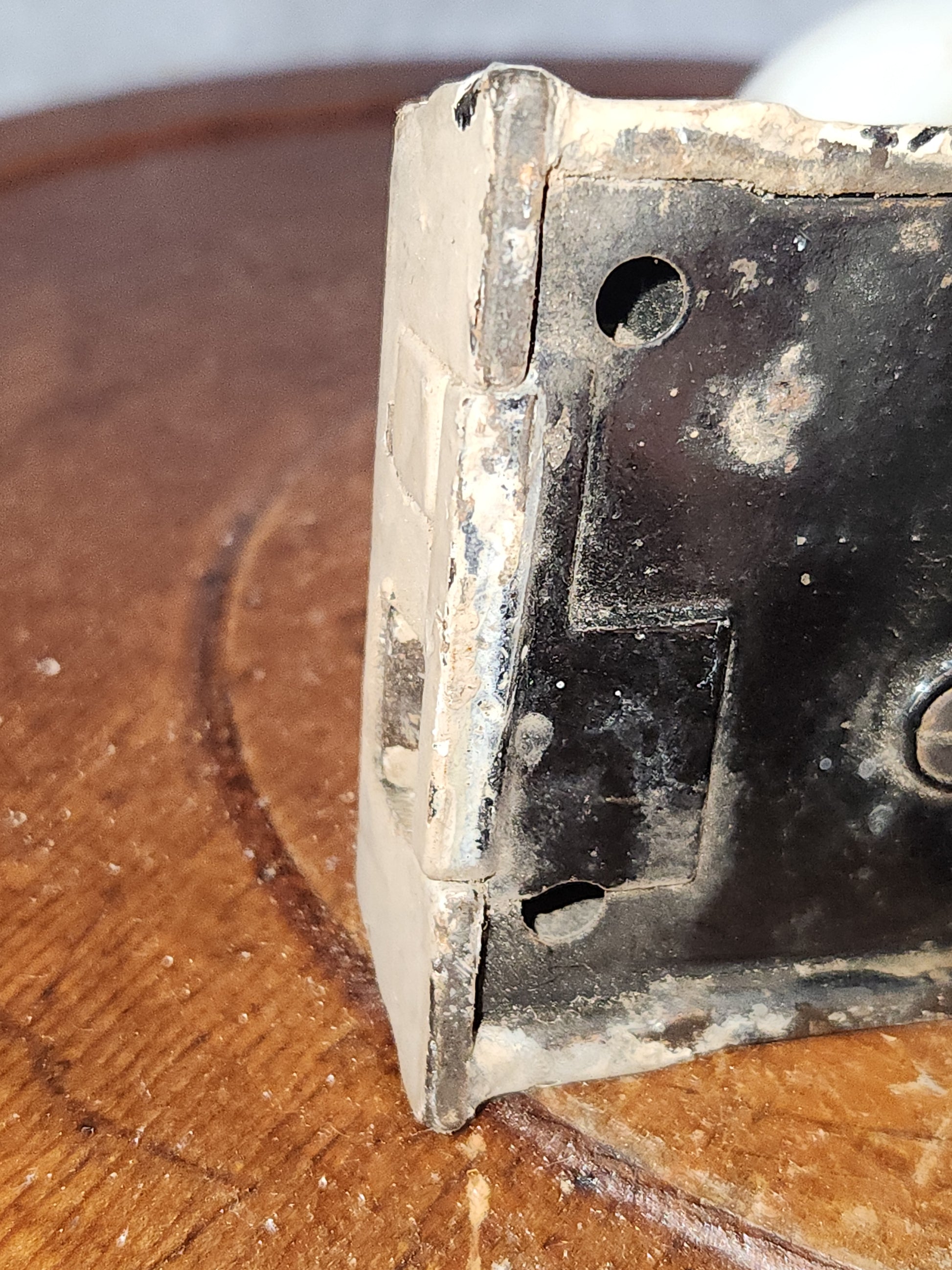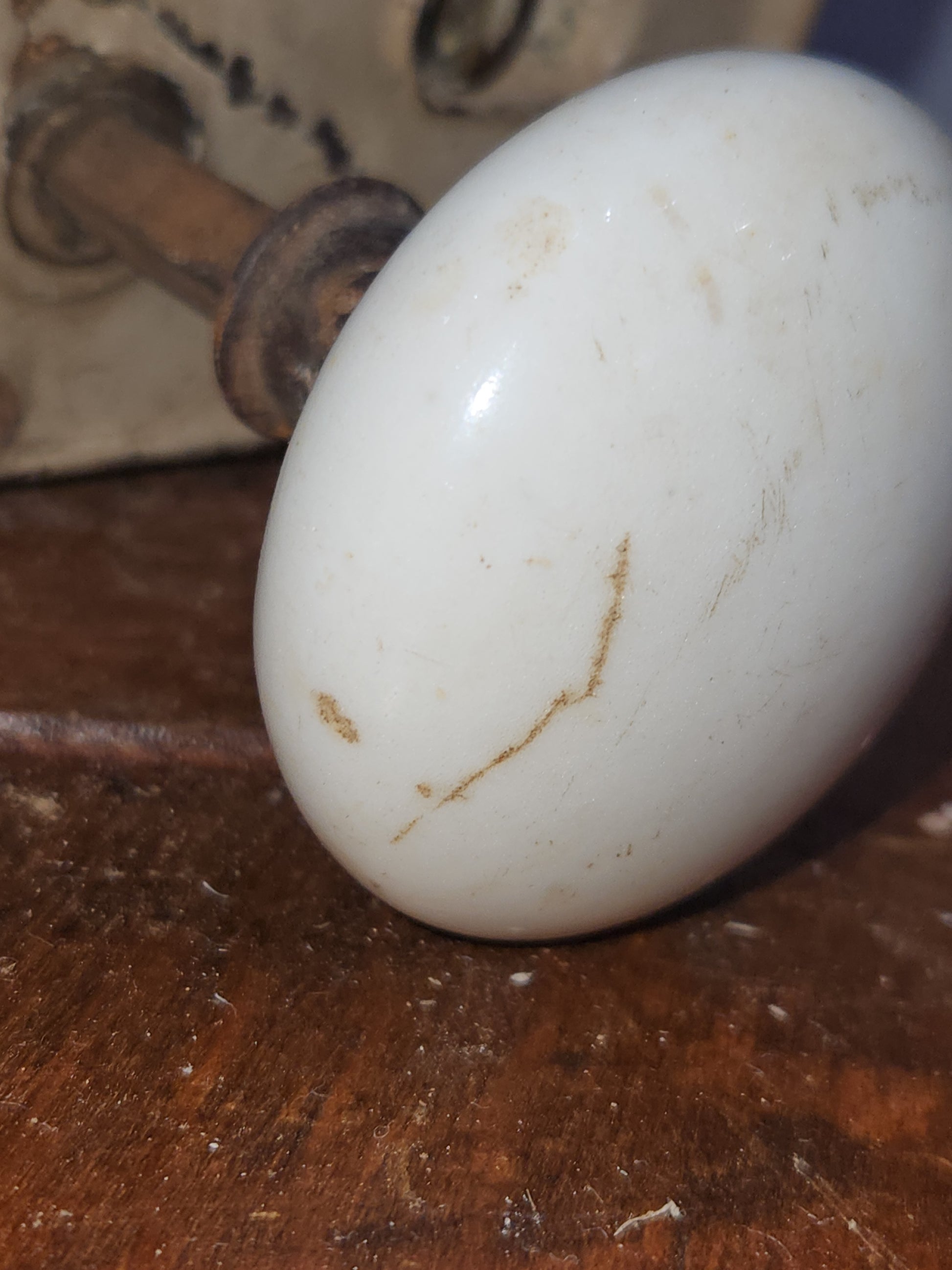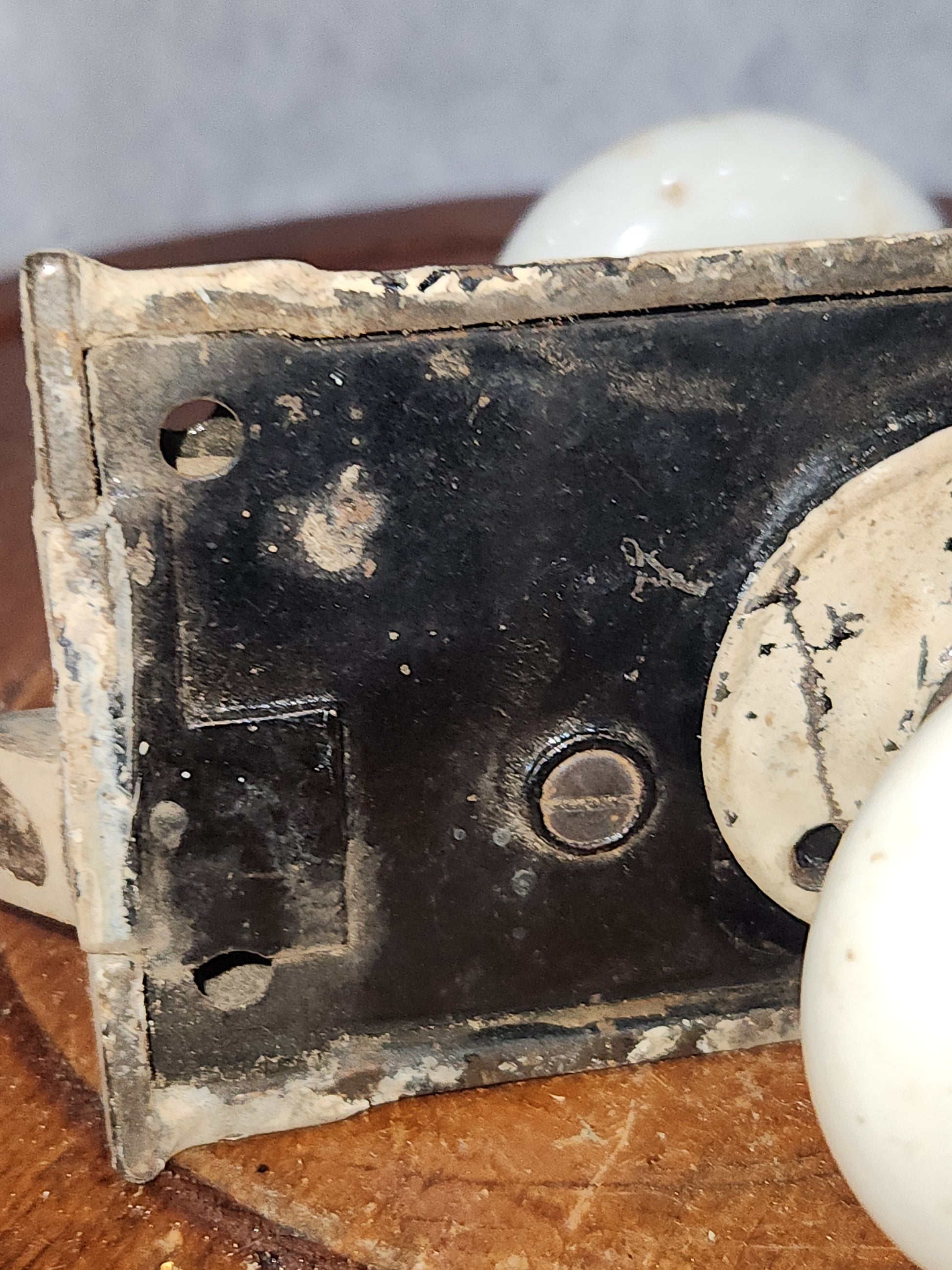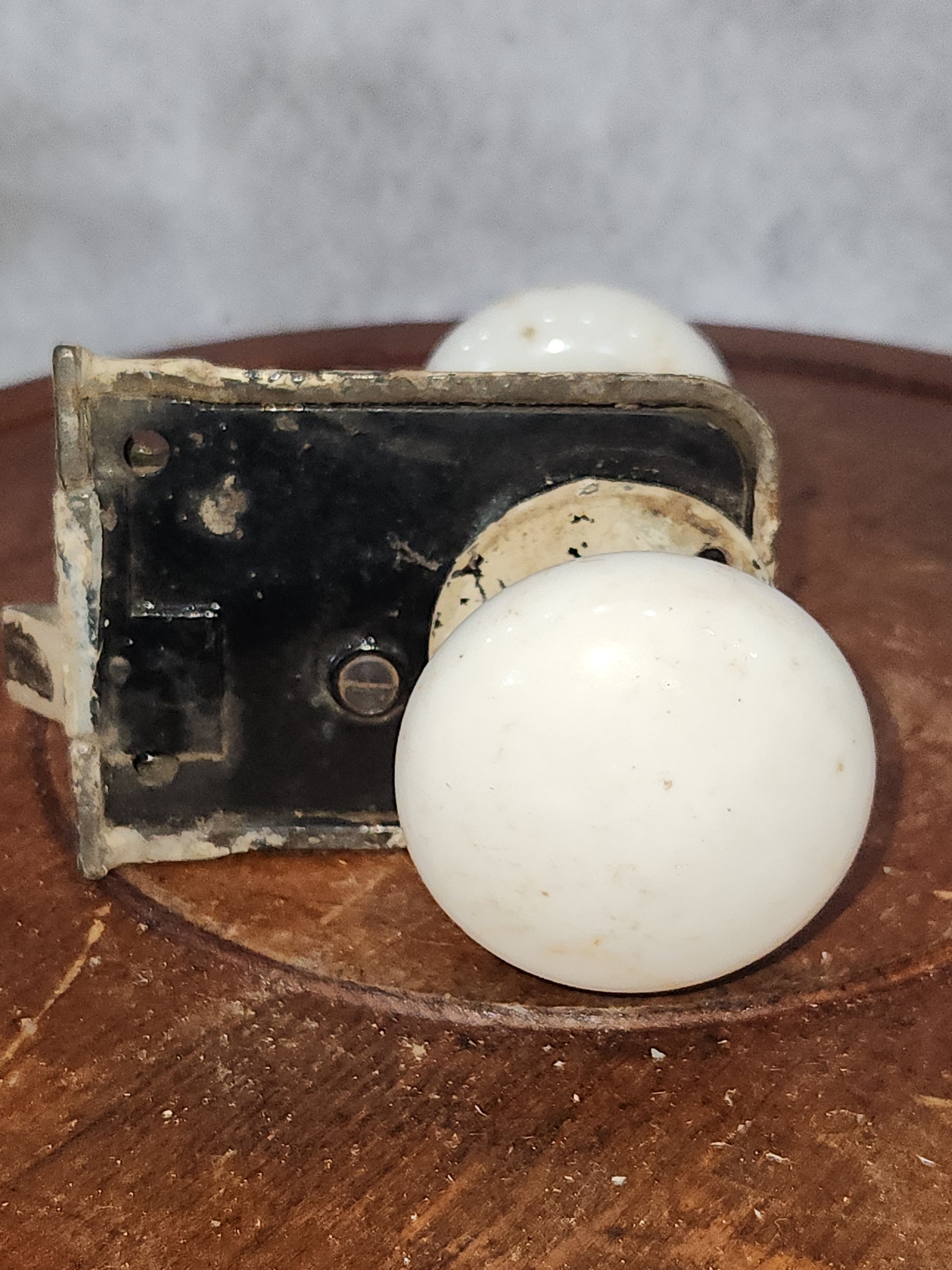 This is an older set of knobs with a lock. Knobs turn the mechanism. Knobs appear and feel like porcelain with no cracks, one knob has a pit and scratch. Both knobs are dirty. One side of lock is black and rusty and one is painted tan. Please see photos as they are part of the description.
