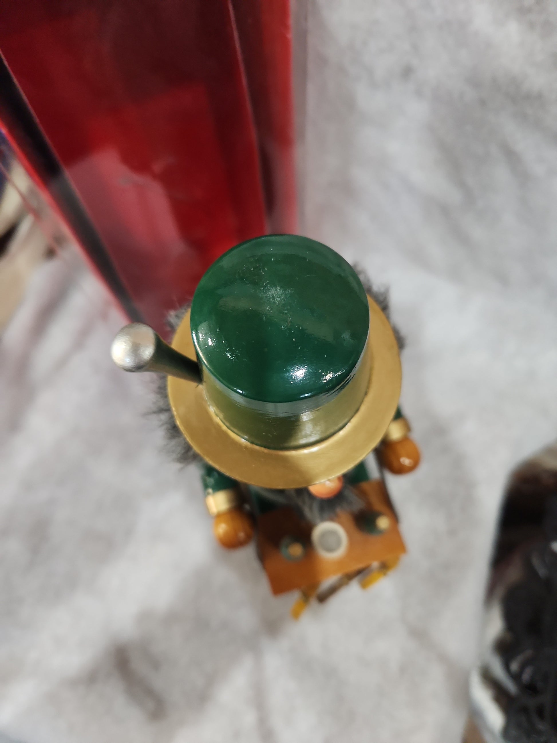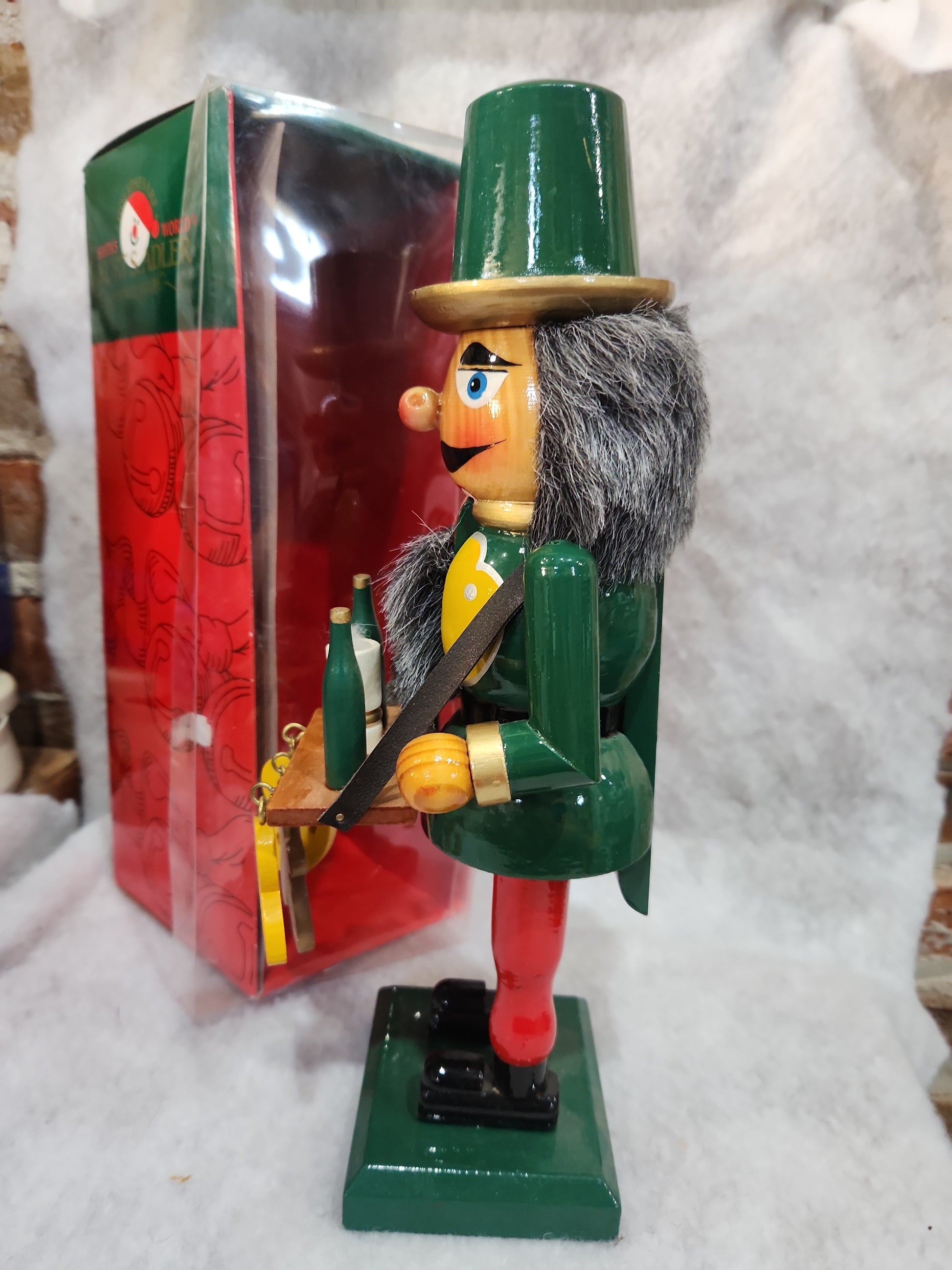 Vintage nutcracker holding tray with beer, mug pretzels & gingerbread man. He is 12" tall his box is a bit taller. He is in good condition, I dont see any cracks, chips or paintloss. He and all attachments and pieces are made from wood. He has his original box which does have a littke wear on the edgeshas storage wear. Please see the photos.Is there part of the description