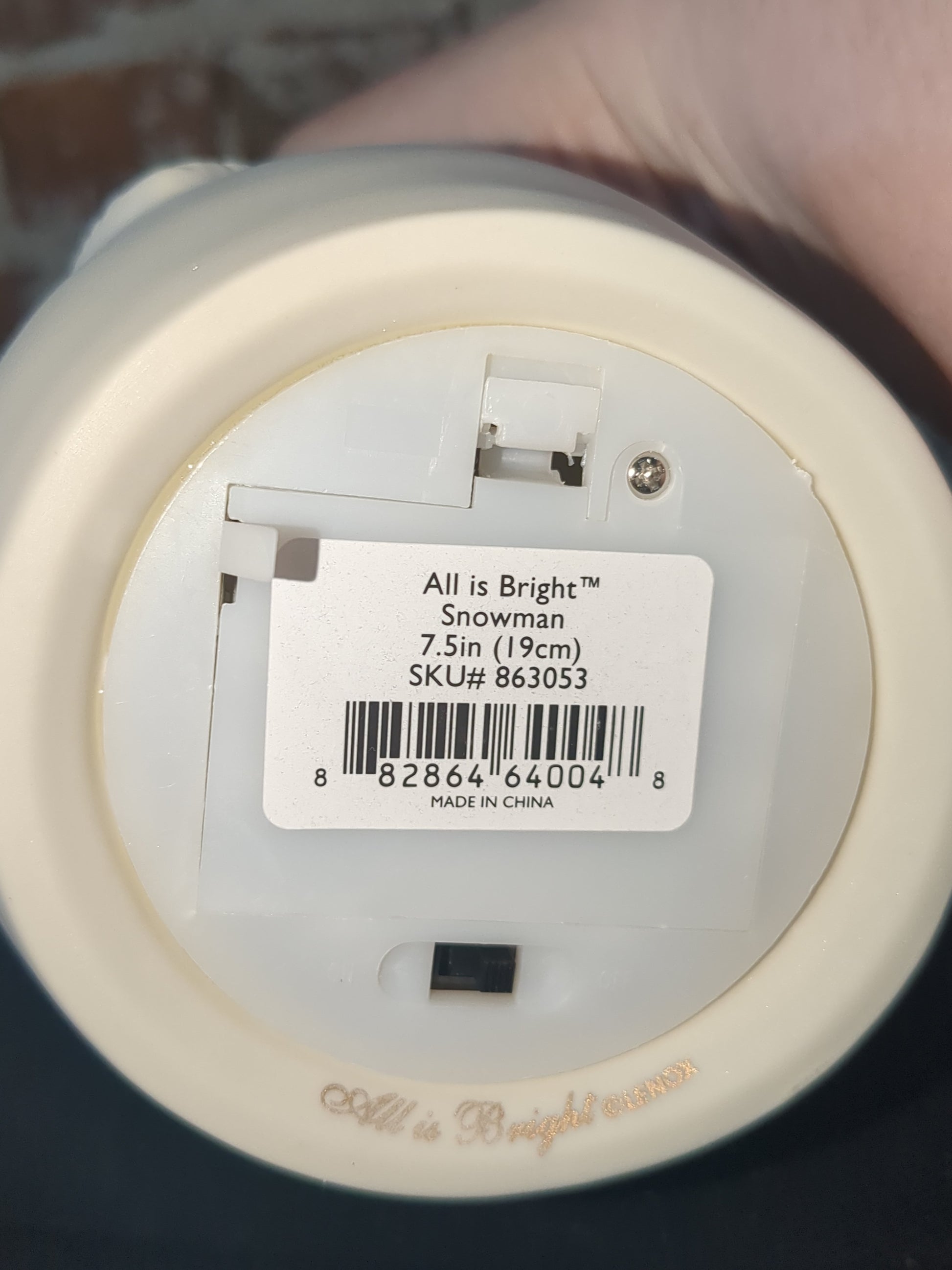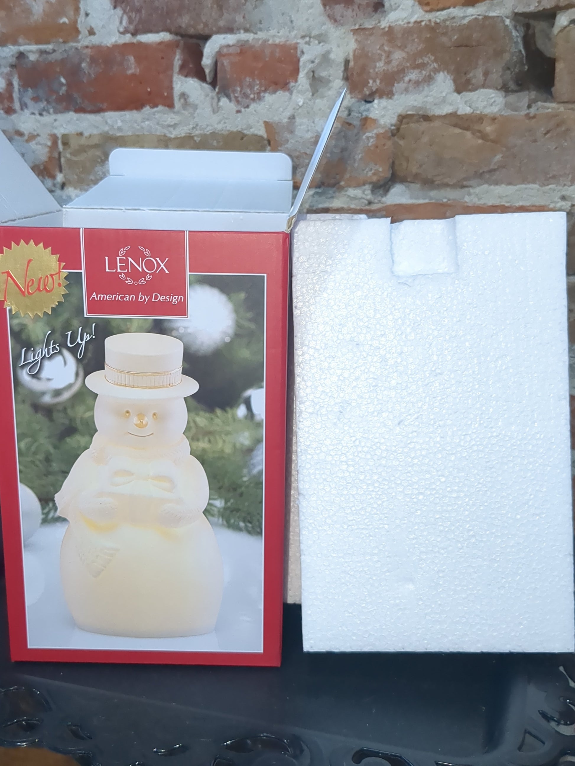 This is a Lenox lighted Snowman Figurine 7.5" tall. It is a beautiful cream color porcelain with gold nose, eyes, smile and rings on its hat. It is new in box, but the Styrofoam packaging has a hole taken out of it. Please see the photos to say a part of the description