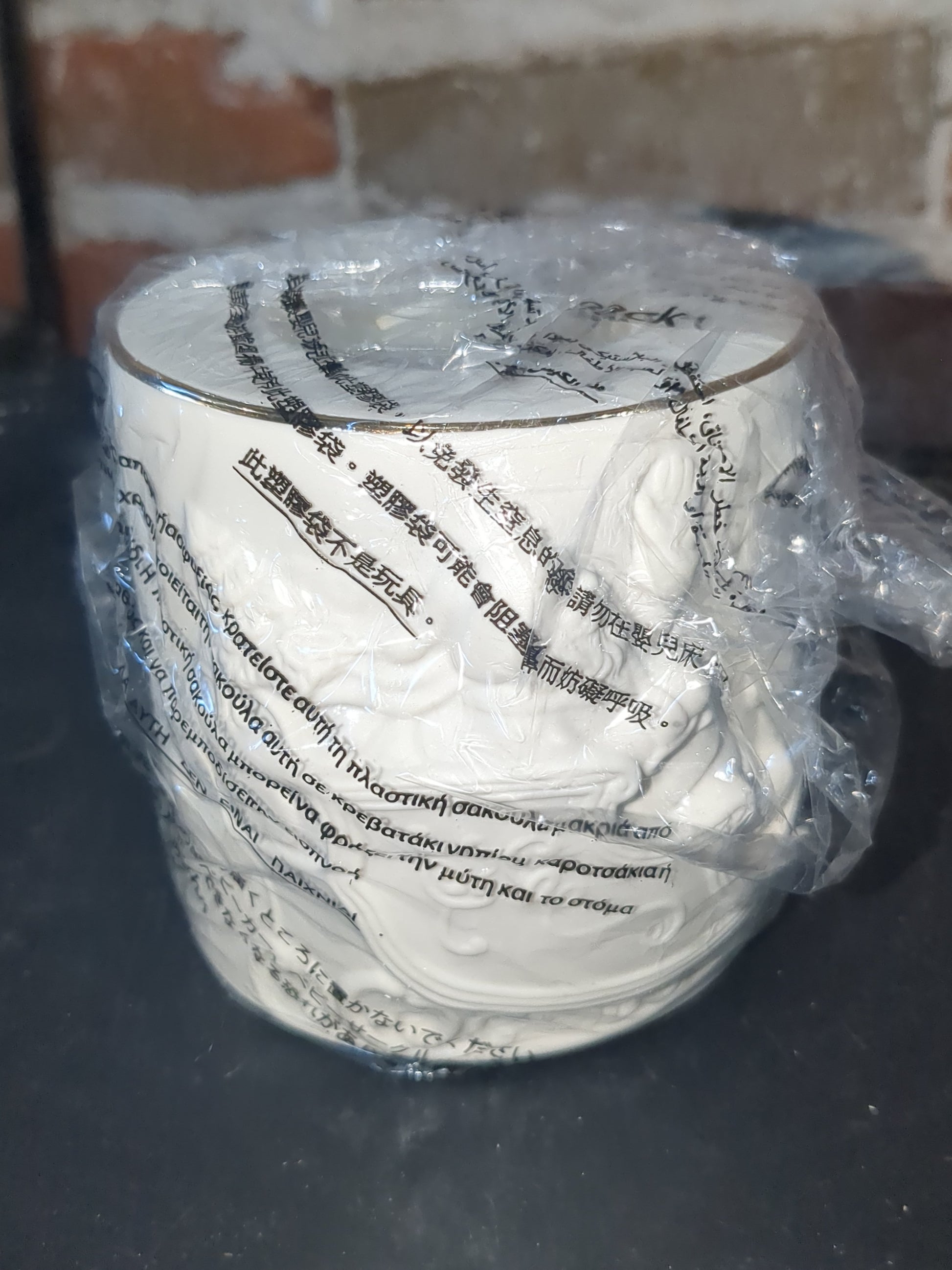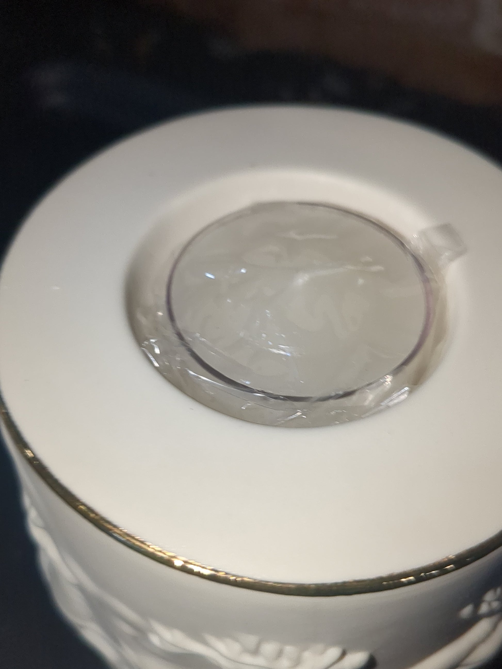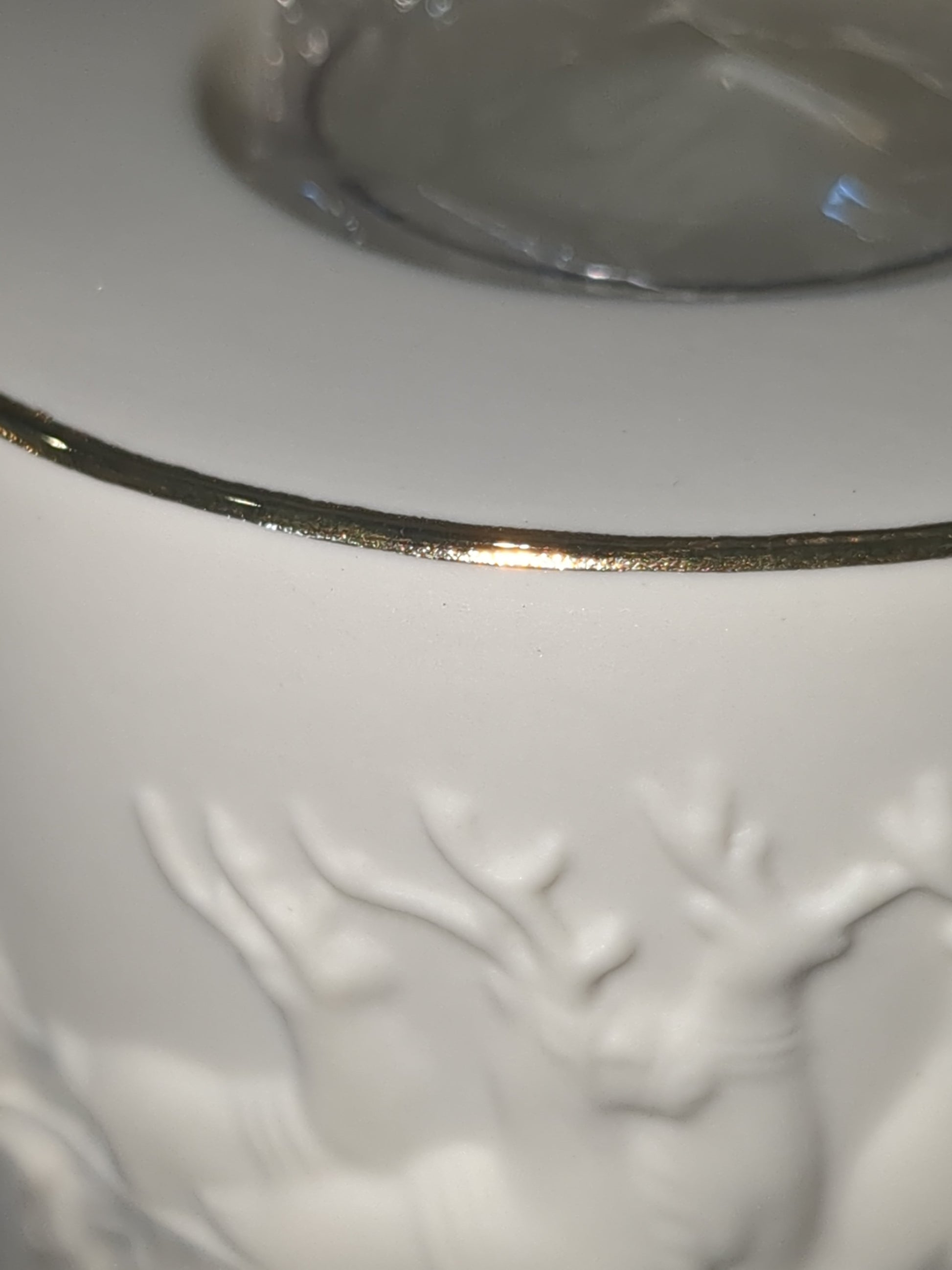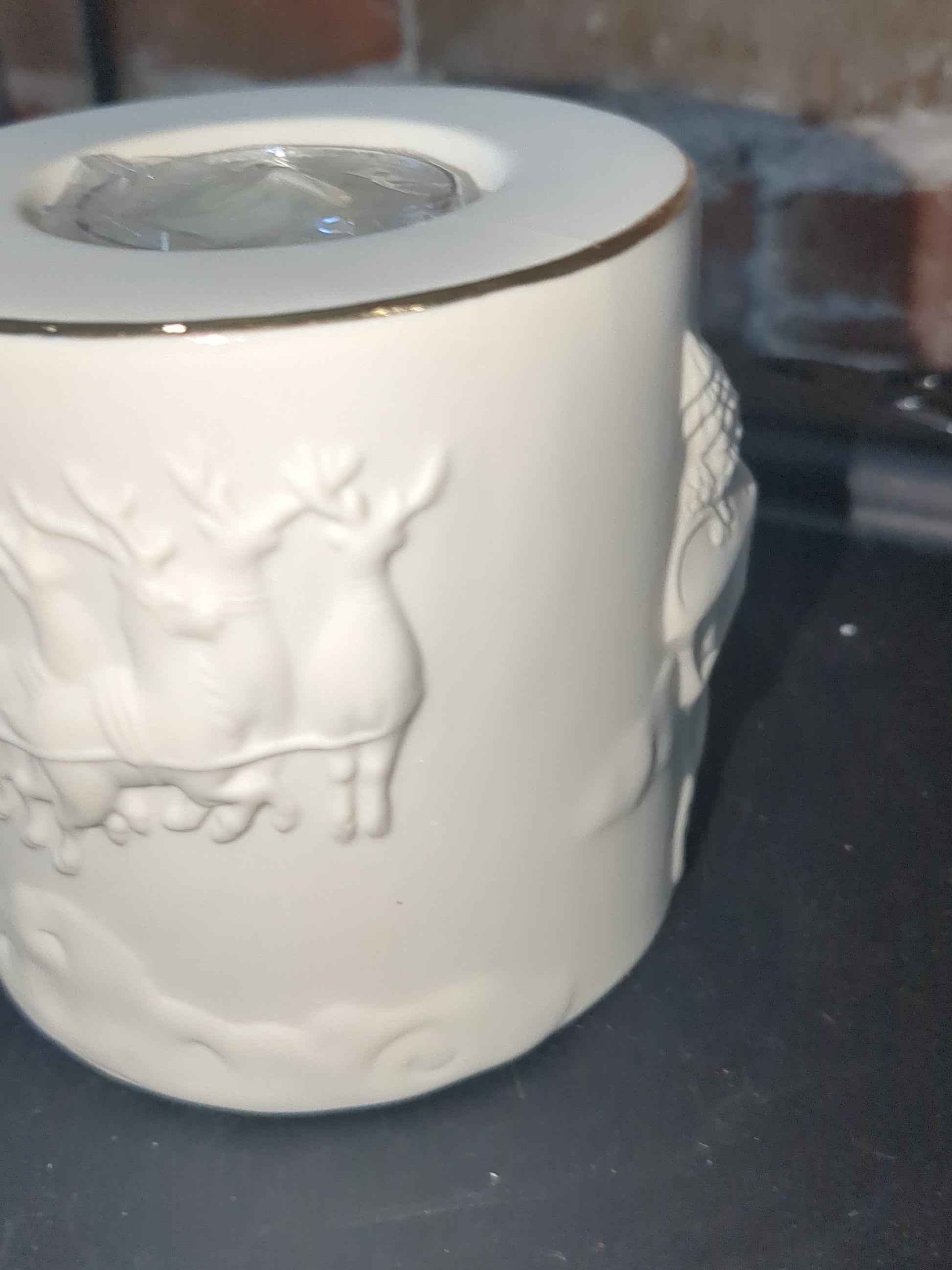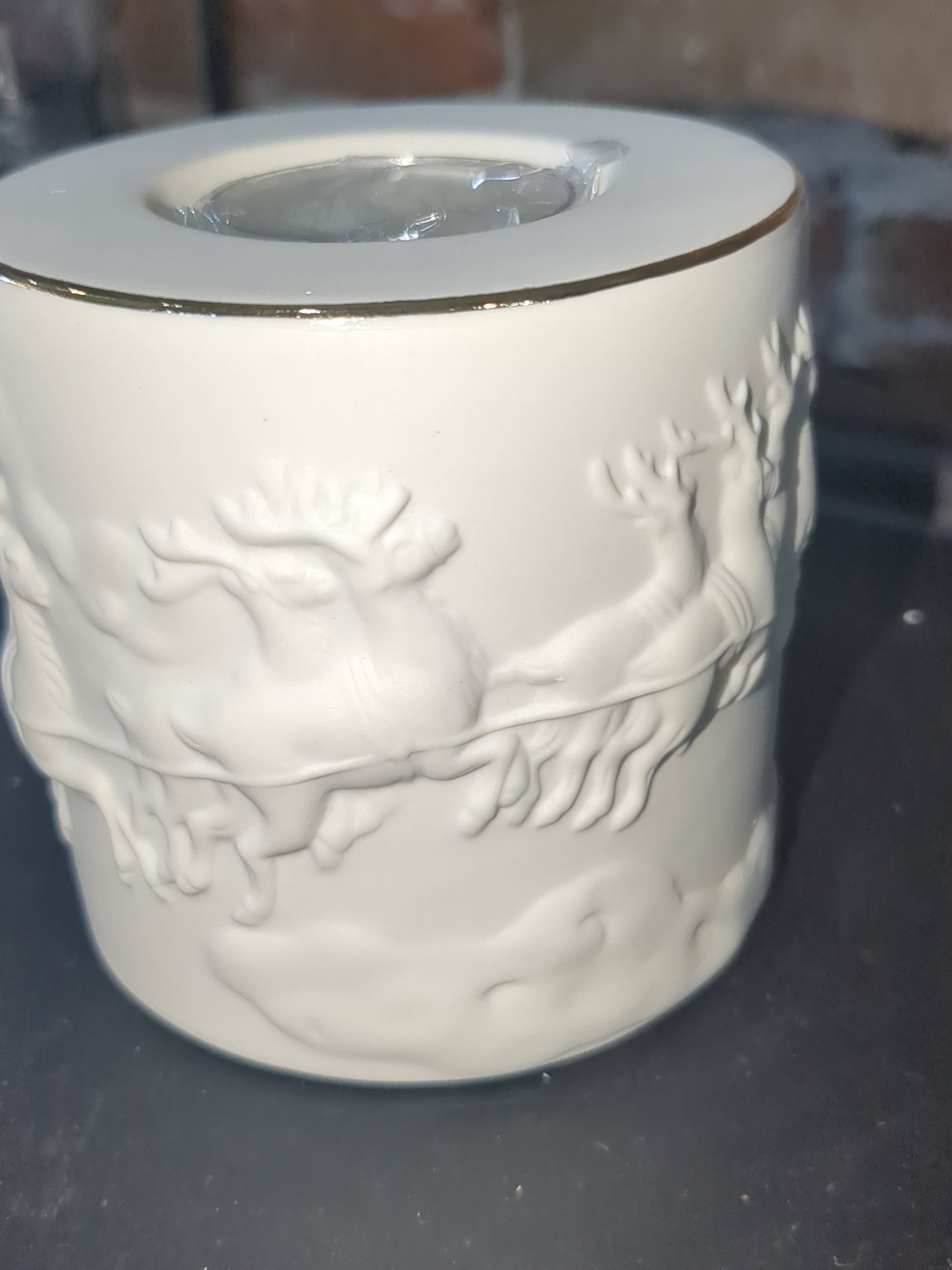 This is a beautiful votive holder in cream porcelain with gold around rim. It is new in the box taken out only for photos