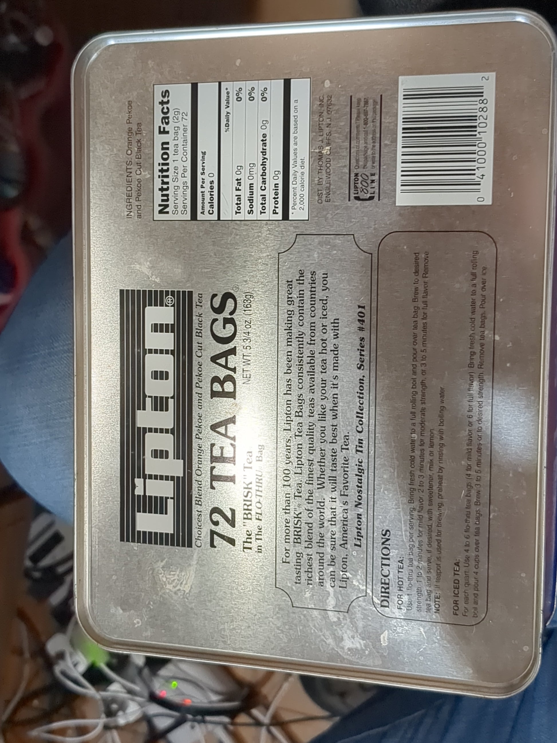 The Lipton tin is part of the Nostalgic Tin Collection Series #401 and is perfect for storing your favorite tea blends, bags or other smaller items. This tin is in really good condition and could be used for food. there is a few areas of scratches it looks like it could use a cleaning maybe there's some grease spots on it. There is an area of rust on the lid top right. Please see photos of things are part of the description.