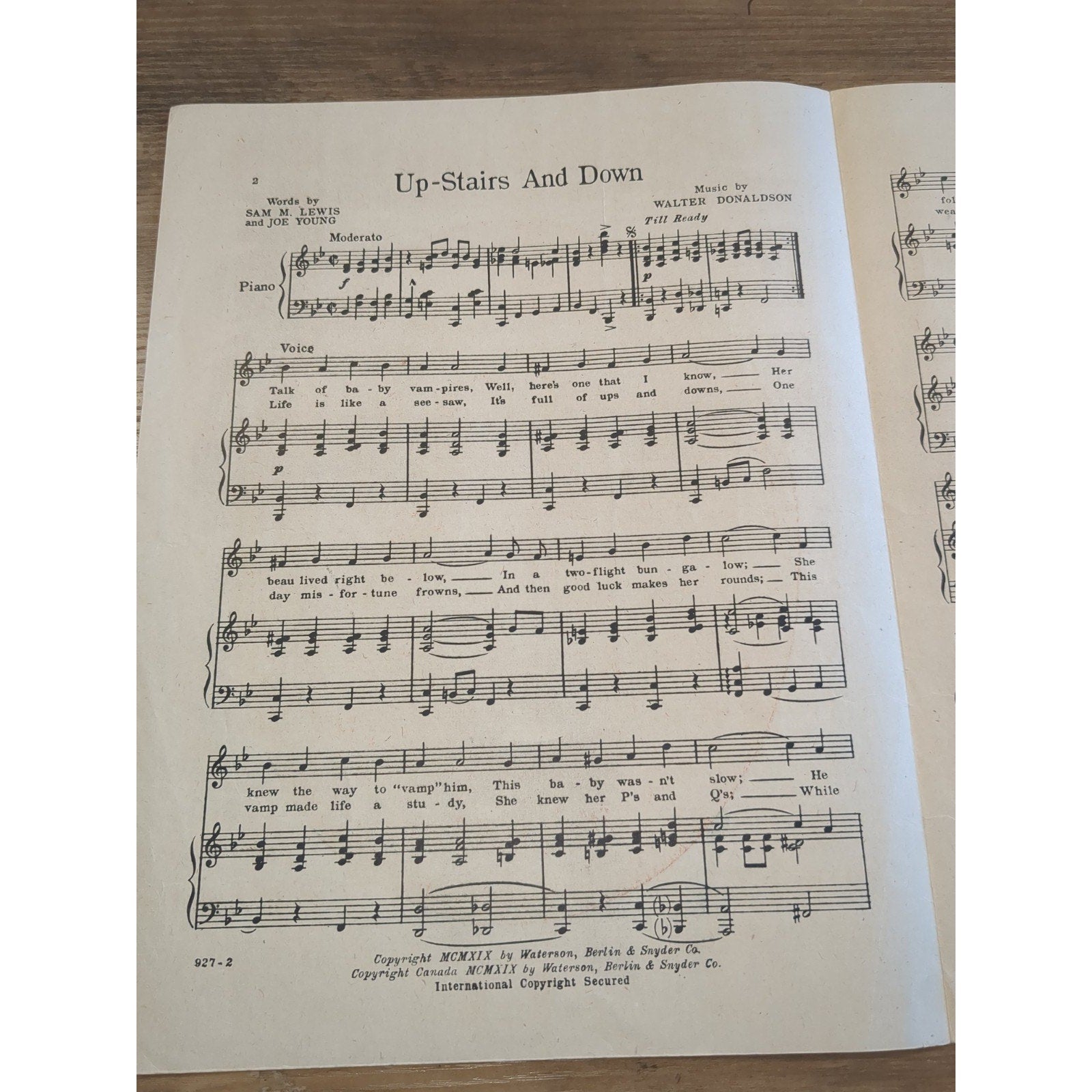 This piece of music is inspired by the photo play upstairs and down dedicated to all of Thomas words by Sam m Lewis and Joe Young music by Walter Donaldson. There is some wear on the front cover and a little tear please see the photos of these are part of the description the inside has a little bit of a red stain like something was placed on it the back cover has a little wear and a little tear but there is no writing on the front and that would look very cool thing I do combine shipping