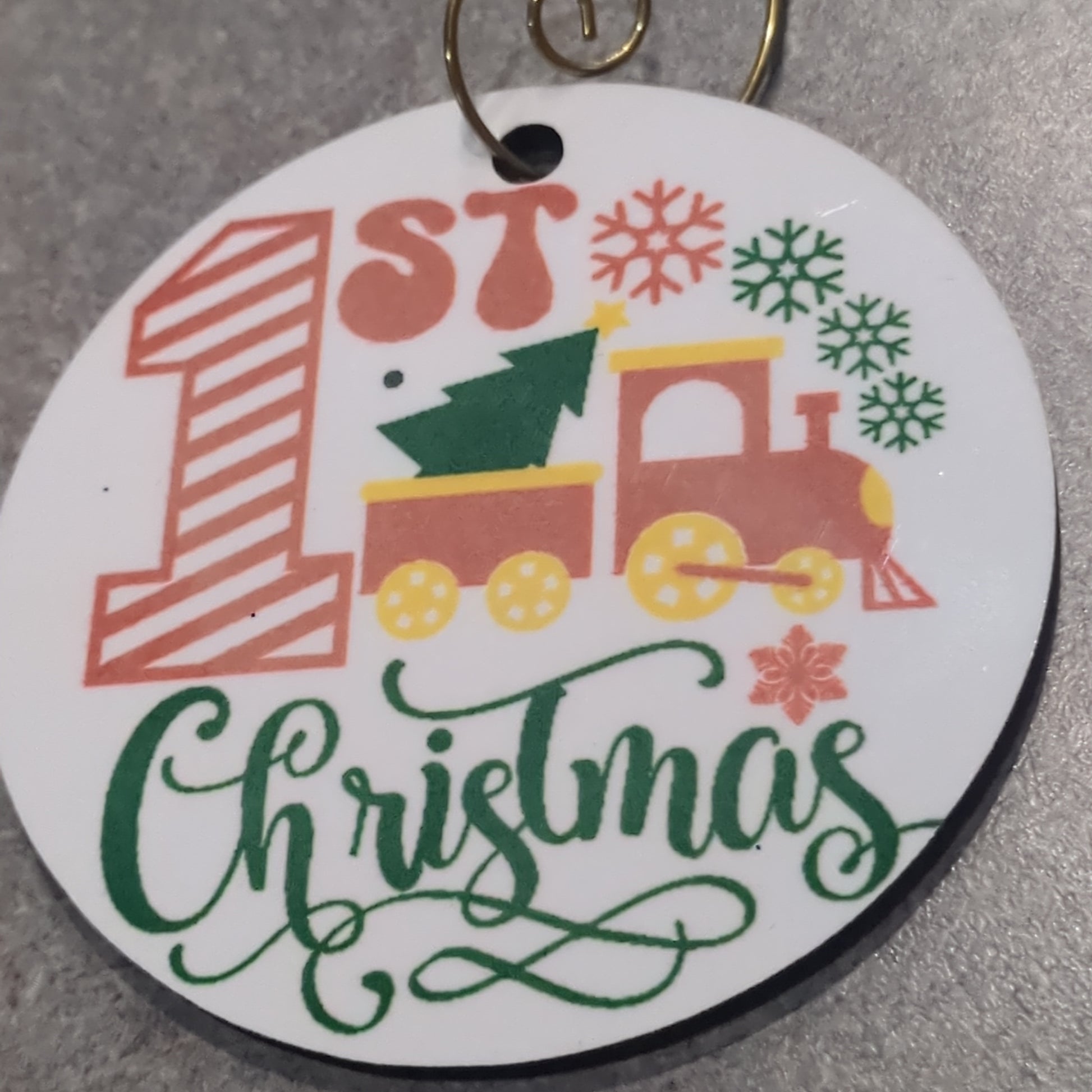 Mdf ornament is two and three quarters in diameter. Occasionally some of the print will transfer to the back side where there is no design