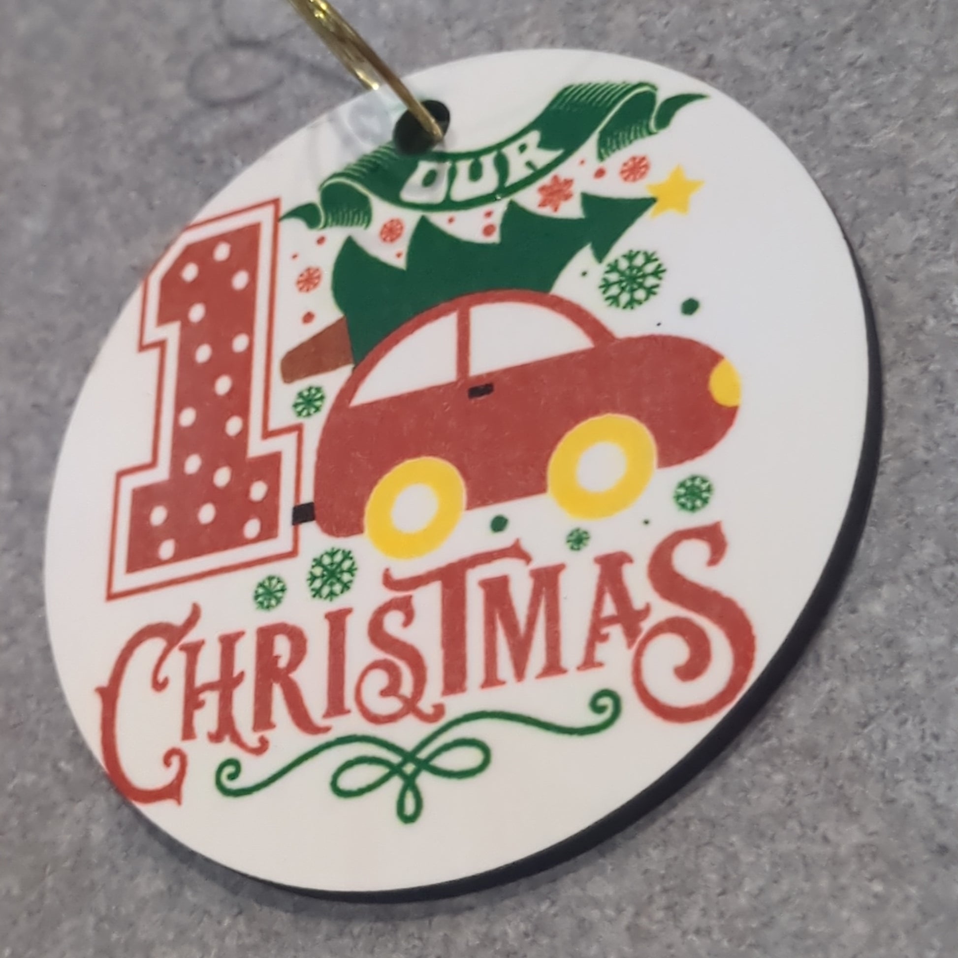 MDF ornament our first Christmas with a tree tied to the top of the car