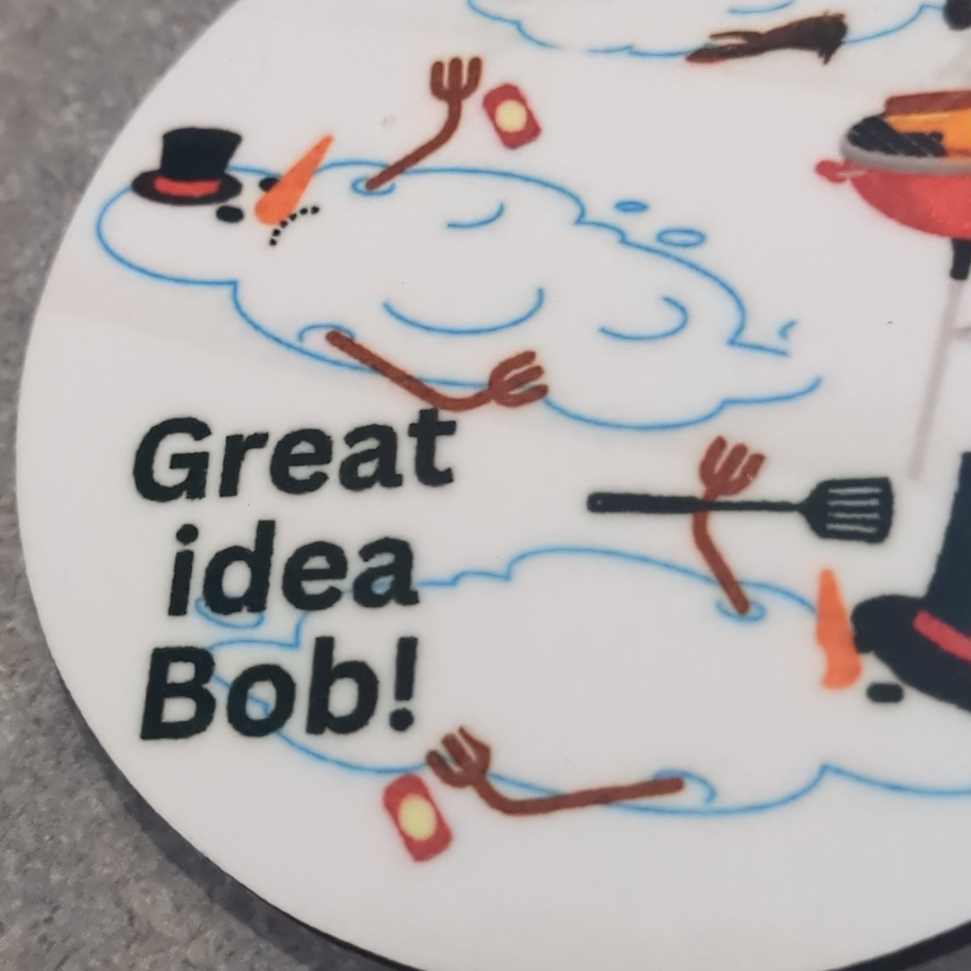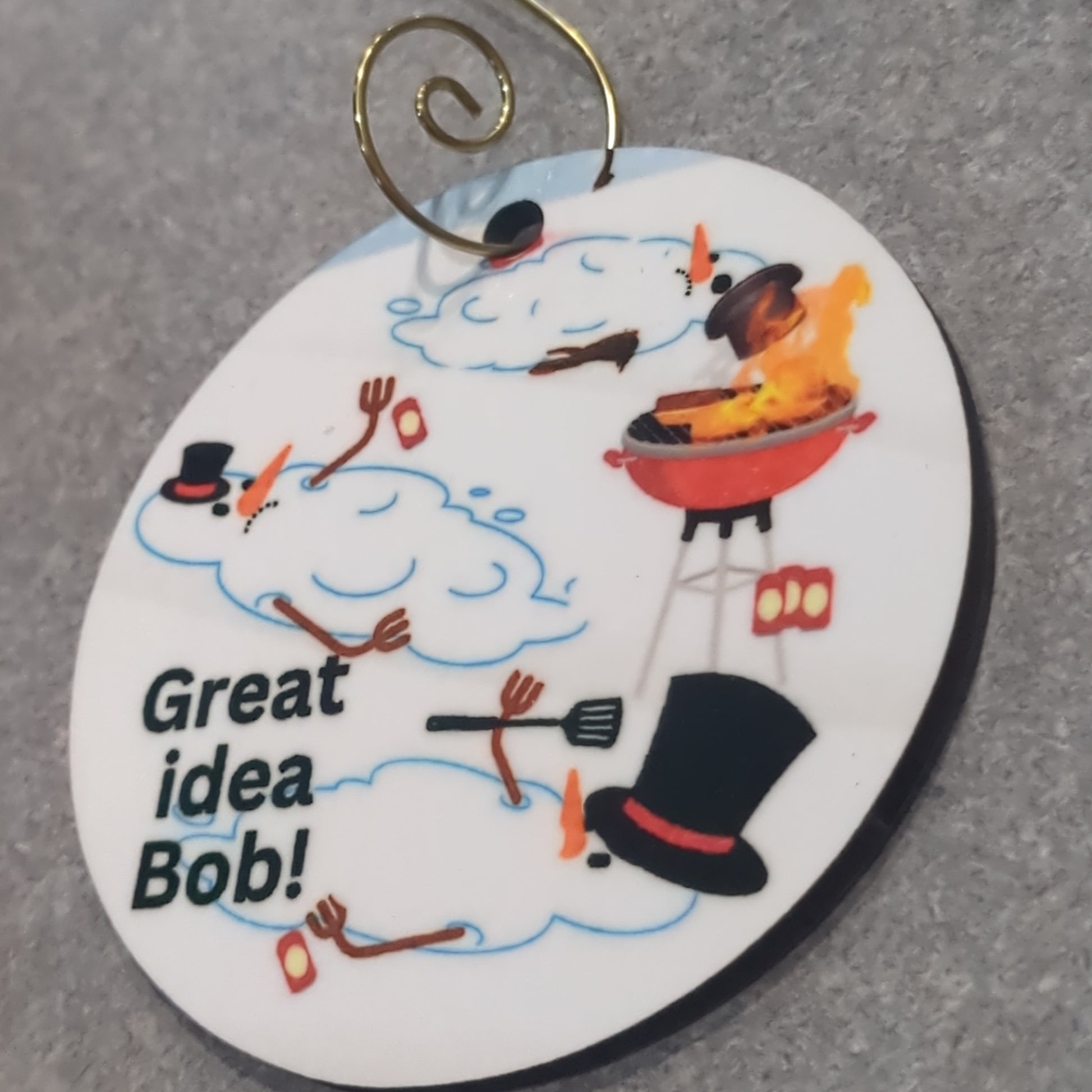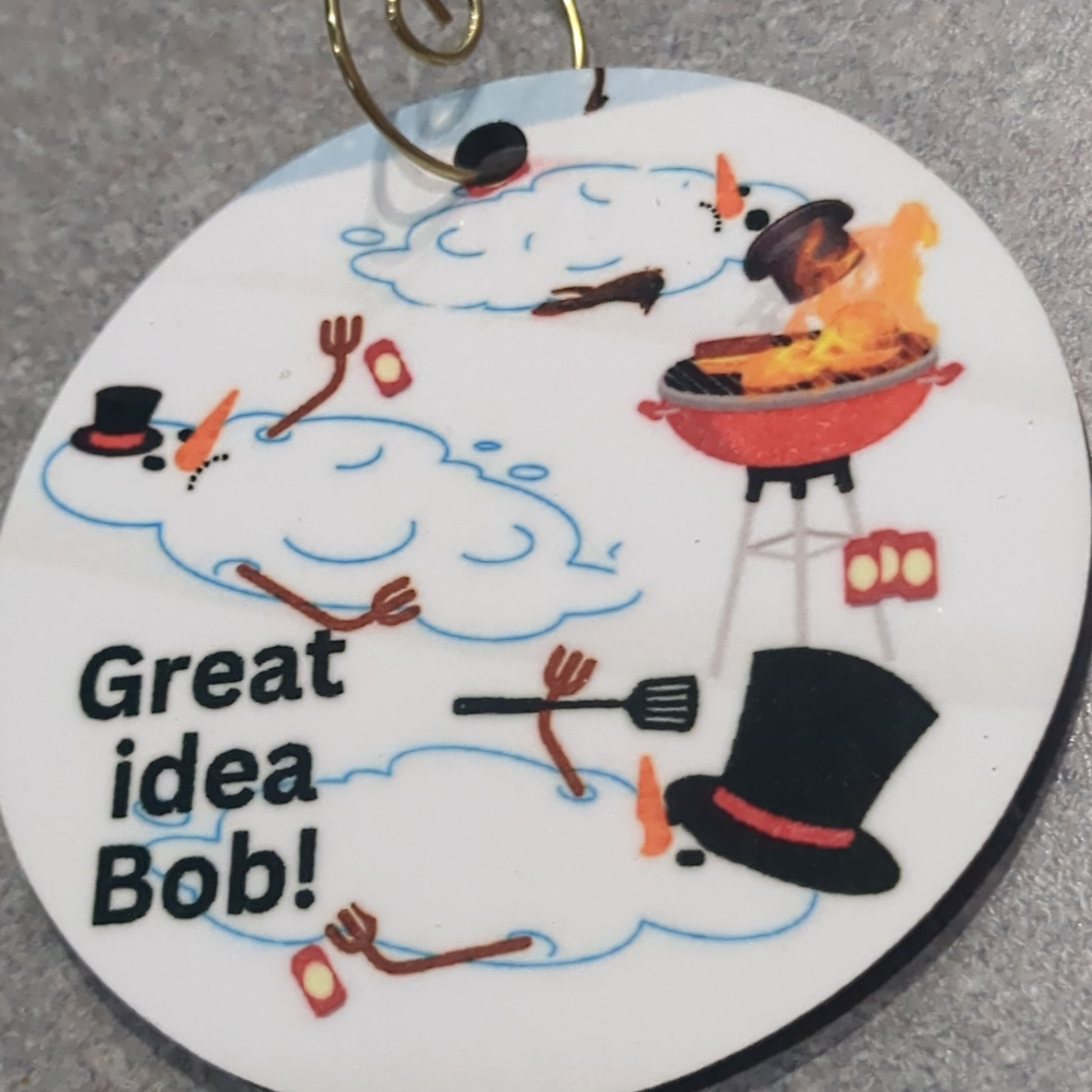 MDF ornament three snowmen melted around a grill and the words great idea Bob!