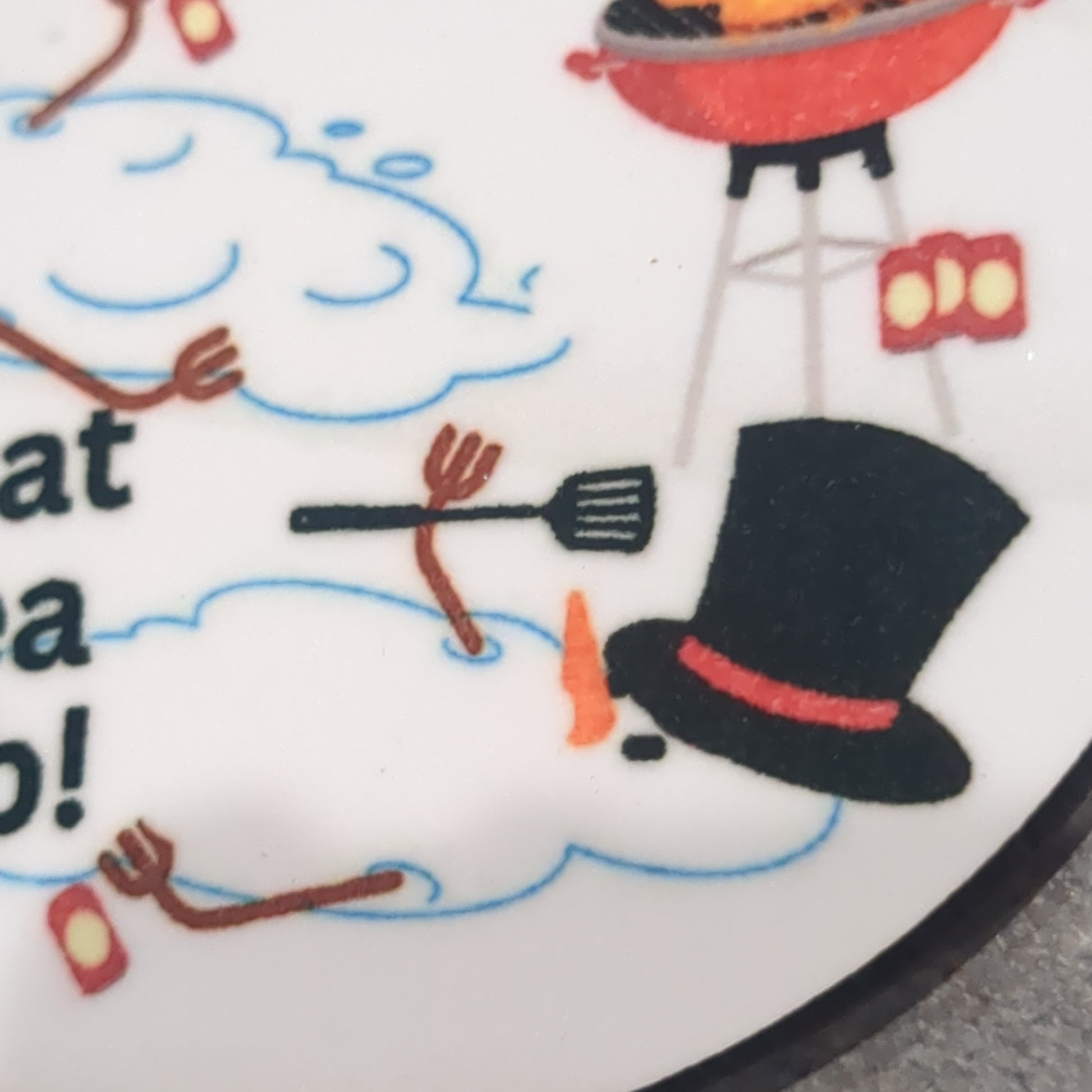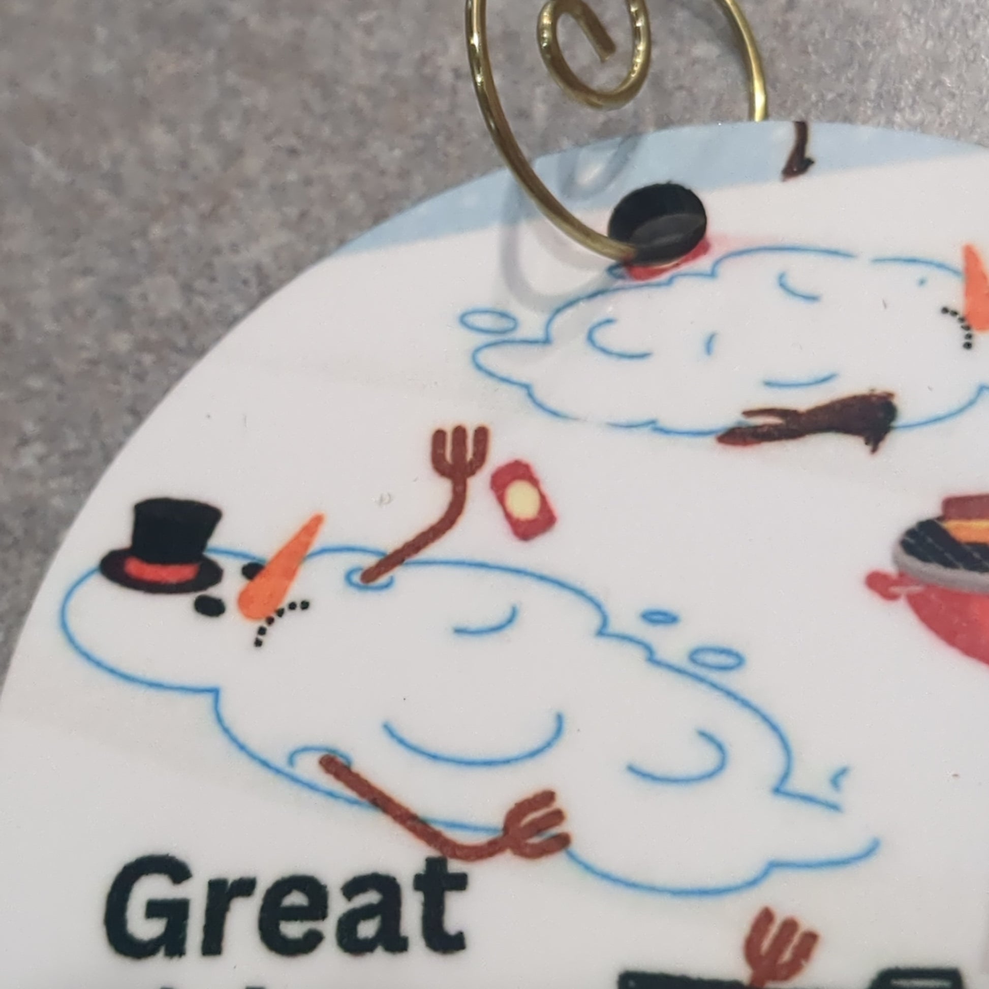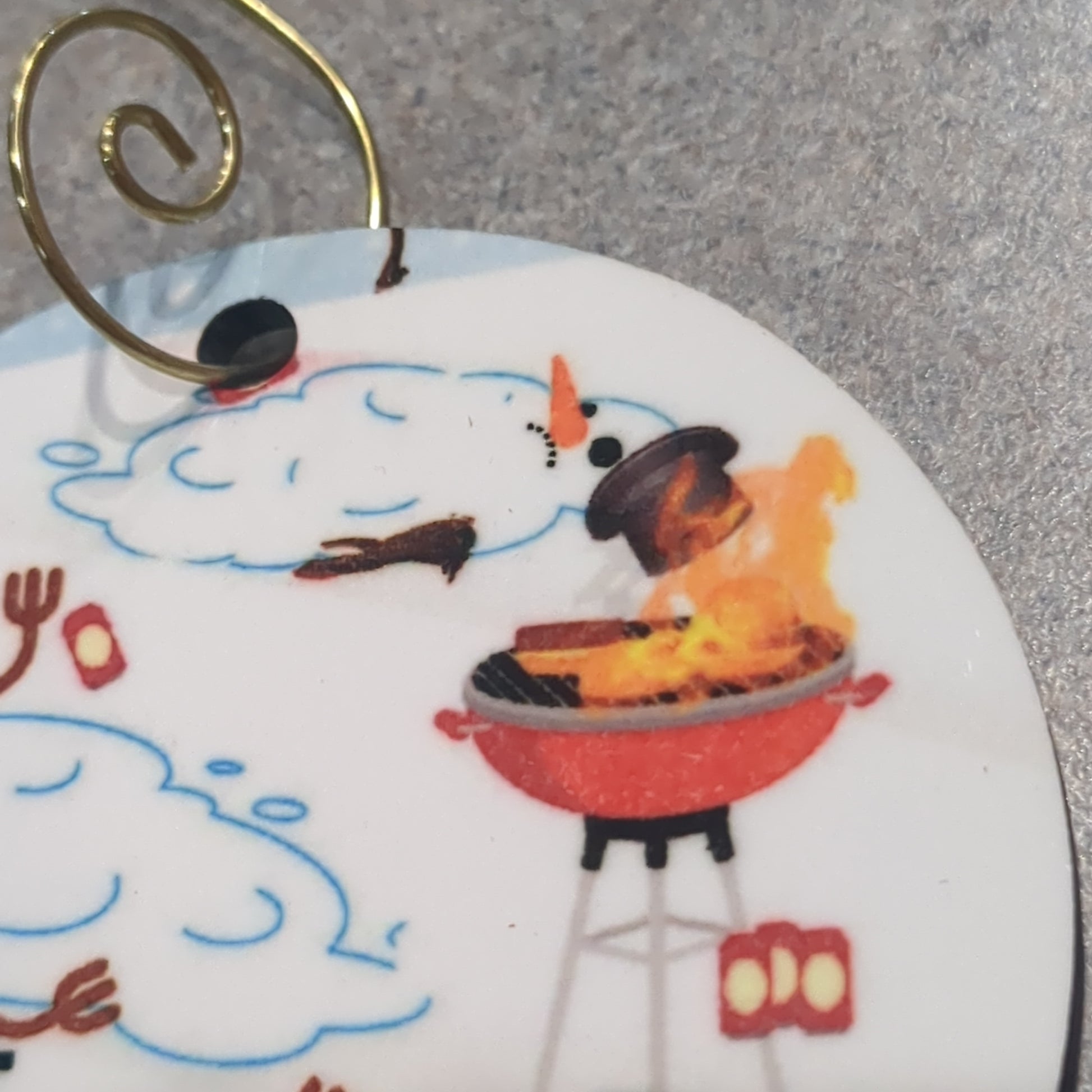 MDF ornament three snowmen melted around a grill and the words great idea Bob!