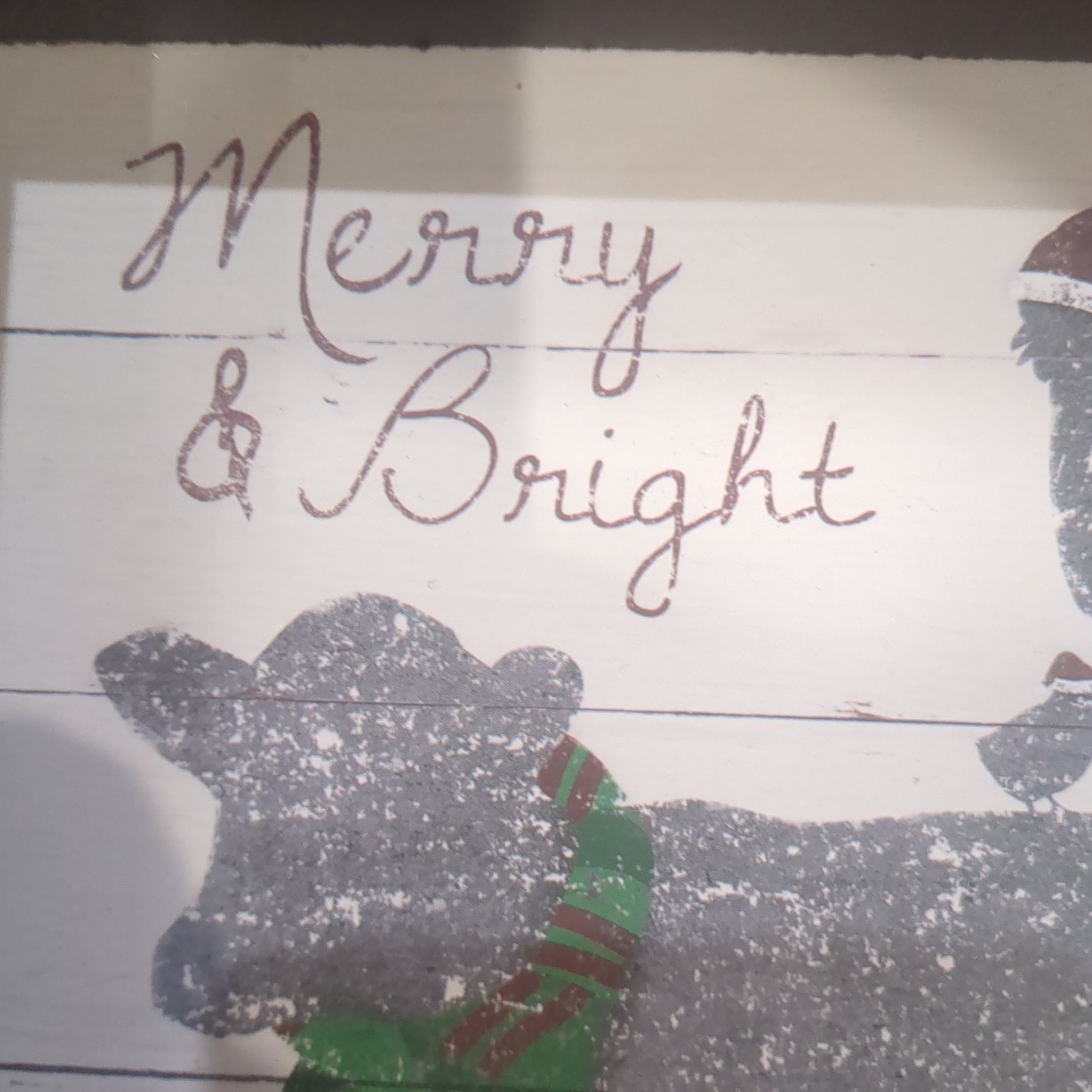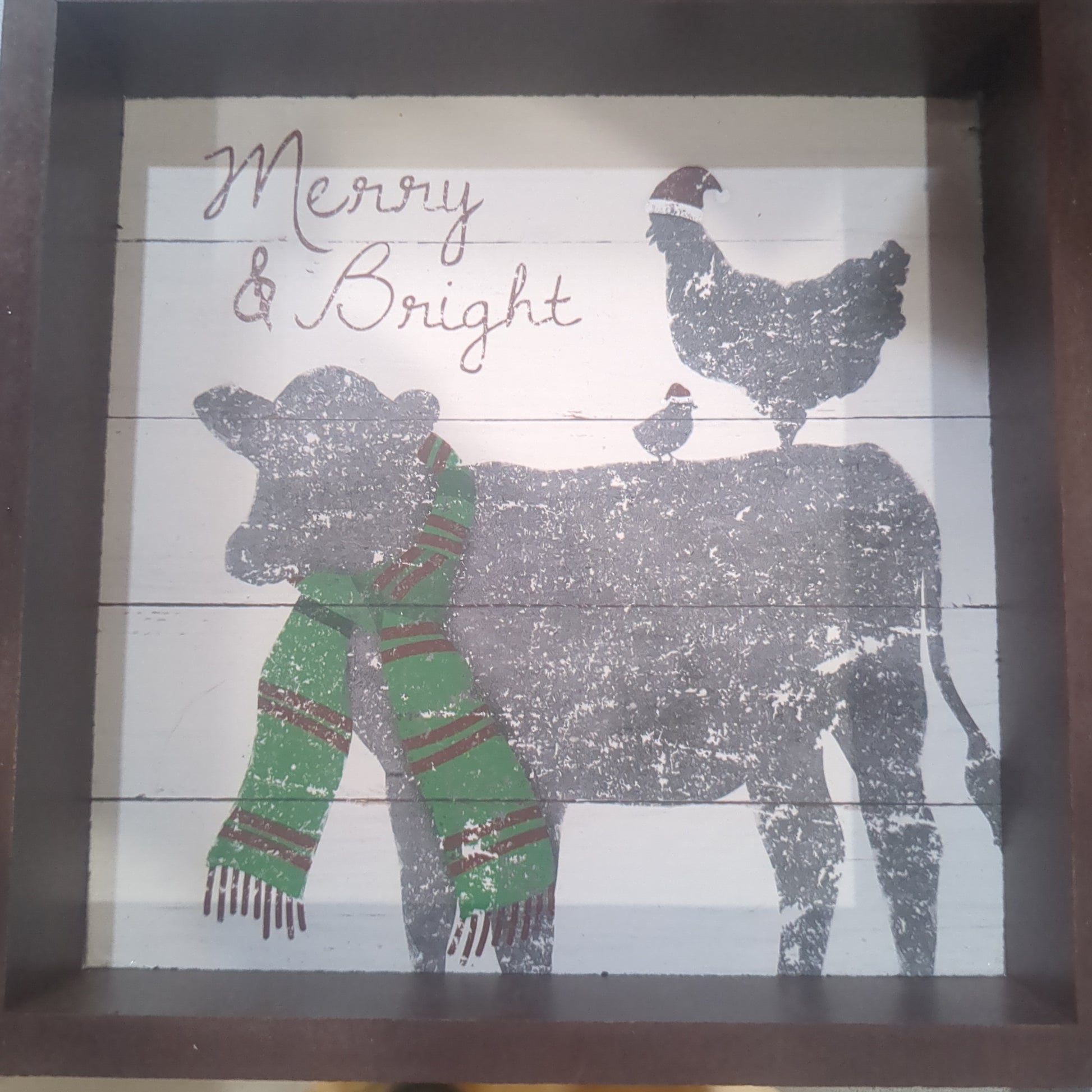 Merry and Bright Box Sign, is a painted box sign with an old burgundy finish. Off-white, shiplap background and distressed animal silhouettes. The illustrations are dressed in Christmas items and it reads, "Merry & Bright" in script text. Sign has a sawtooth hanger, but looks great sat on a console table or mantelpiece. Measures 7" squared by 1.5" deep.