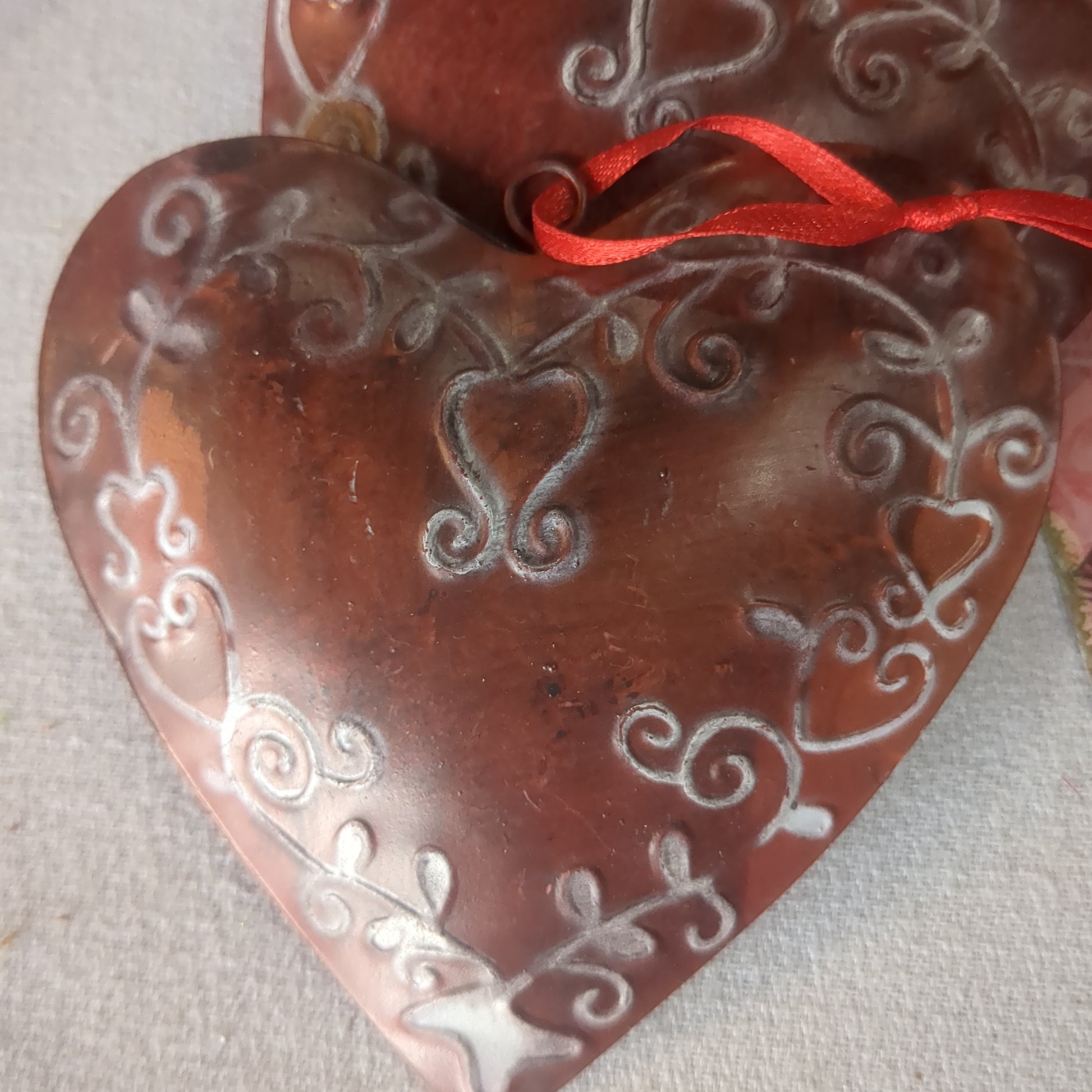 Heart ornament roughly 4 x 4 made of metal and 3D for Valentine's Day. Keep your tree up and tell Valentine's Day is over
