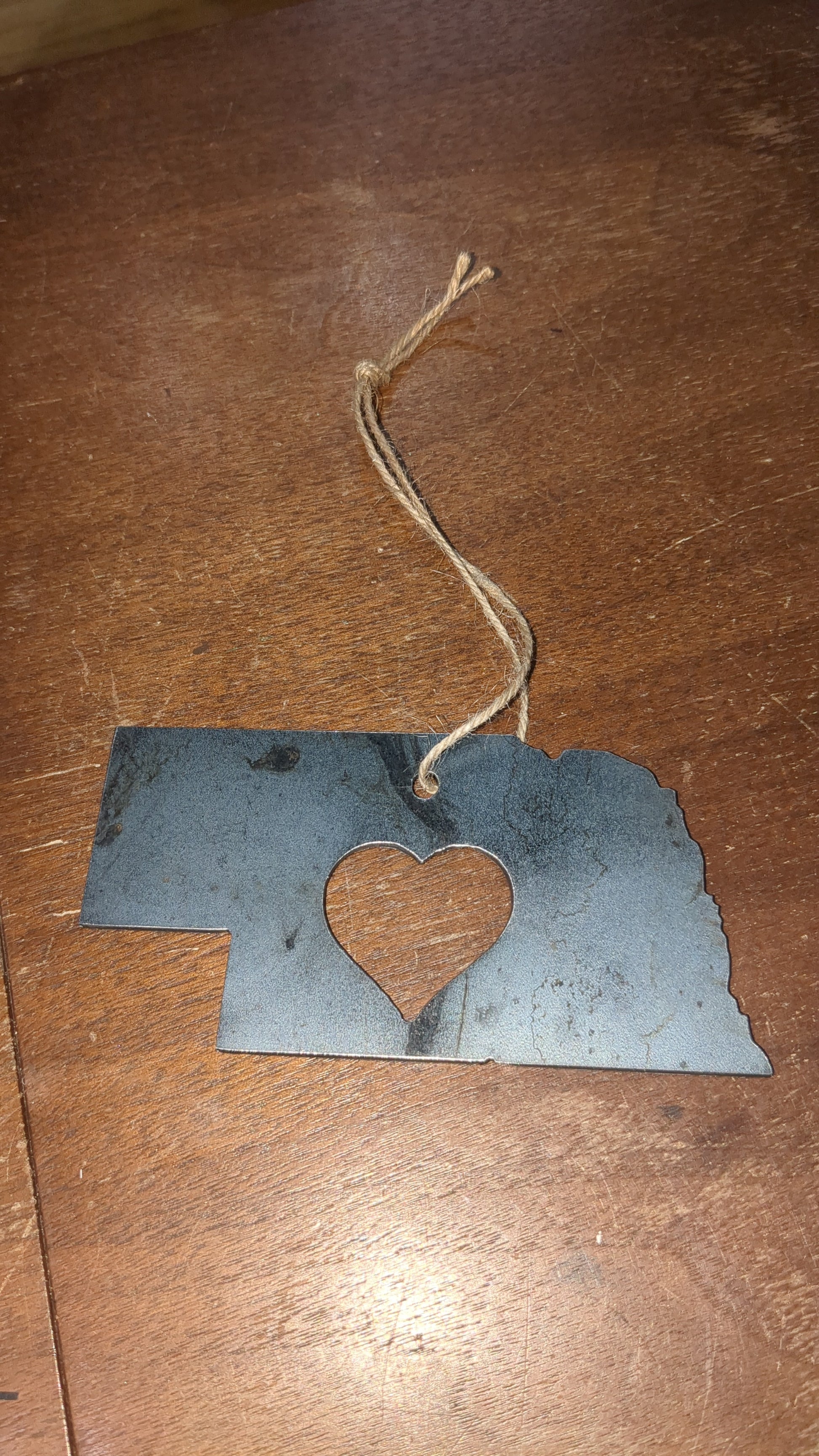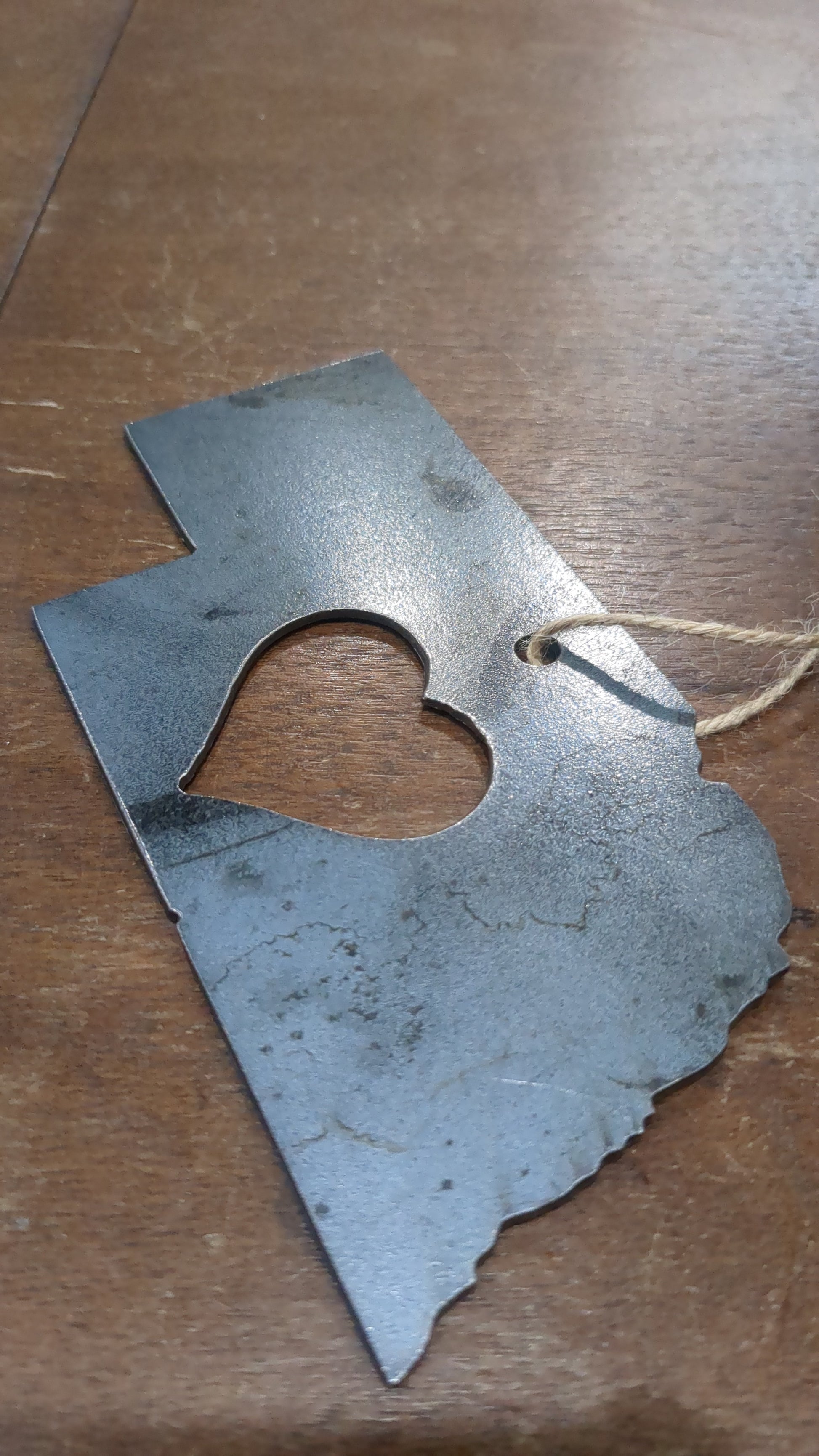 Our metal Christmas ornaments are stunning, detailed, and unique. Made from quality 14-gauge hot rolled mild steel, plus is part of the collection of our "State of Mind Ornaments," which are available in all 50 states. The unfinished piece will have a protective layer of mill scale (black oxide, magnetite) which makes the dark gray blue tint. While this provides some protection, the piece will still rust and patina over time. If this patina is the look you desire, you may simply let the piece gain its natural patina. If you wish to seal in the look of the raw steel you can always coat the piece with a clear spray to preserve it at any stage of patina. Each piece will have different natural patina and no two pieces are exactly alike. Choose your state of mind...
