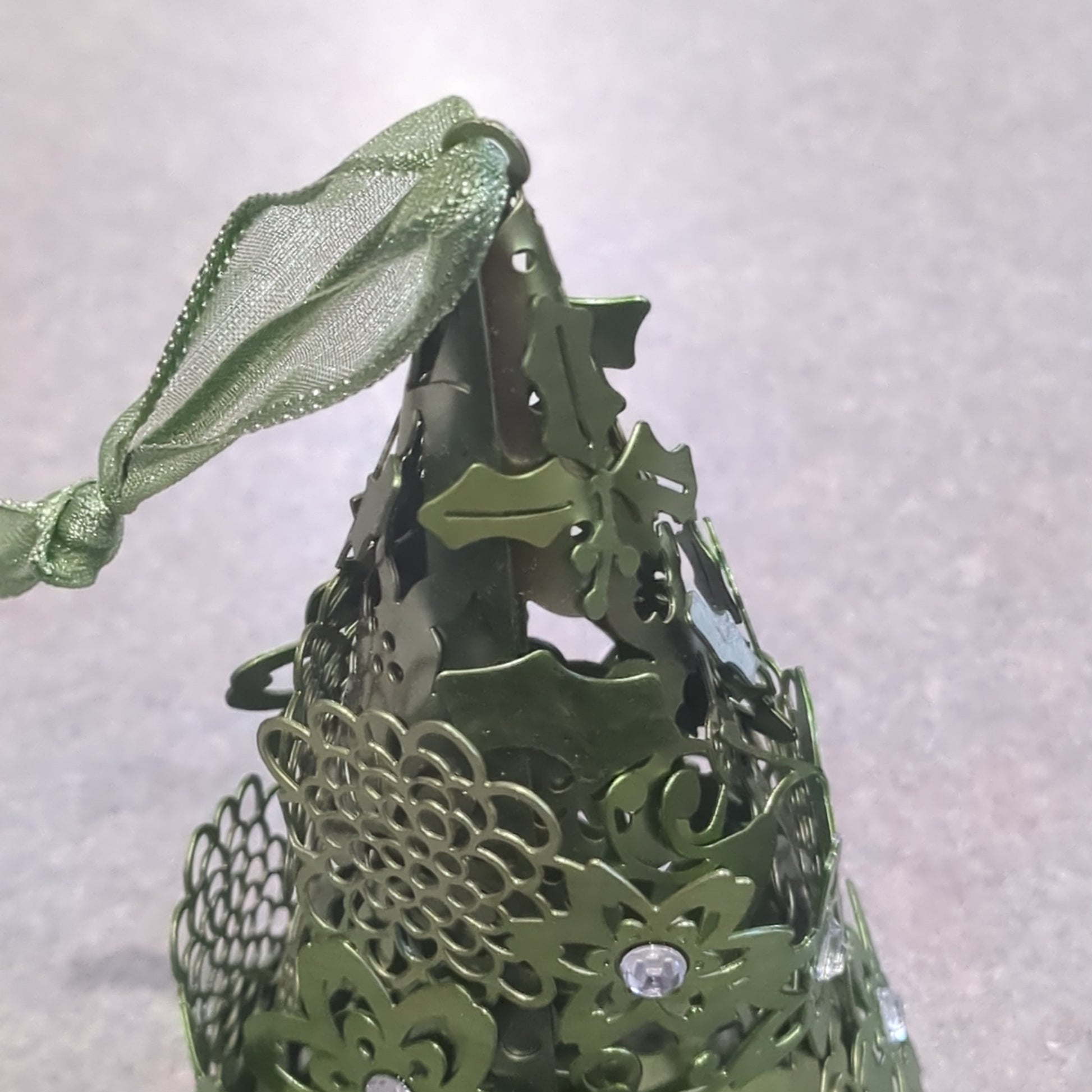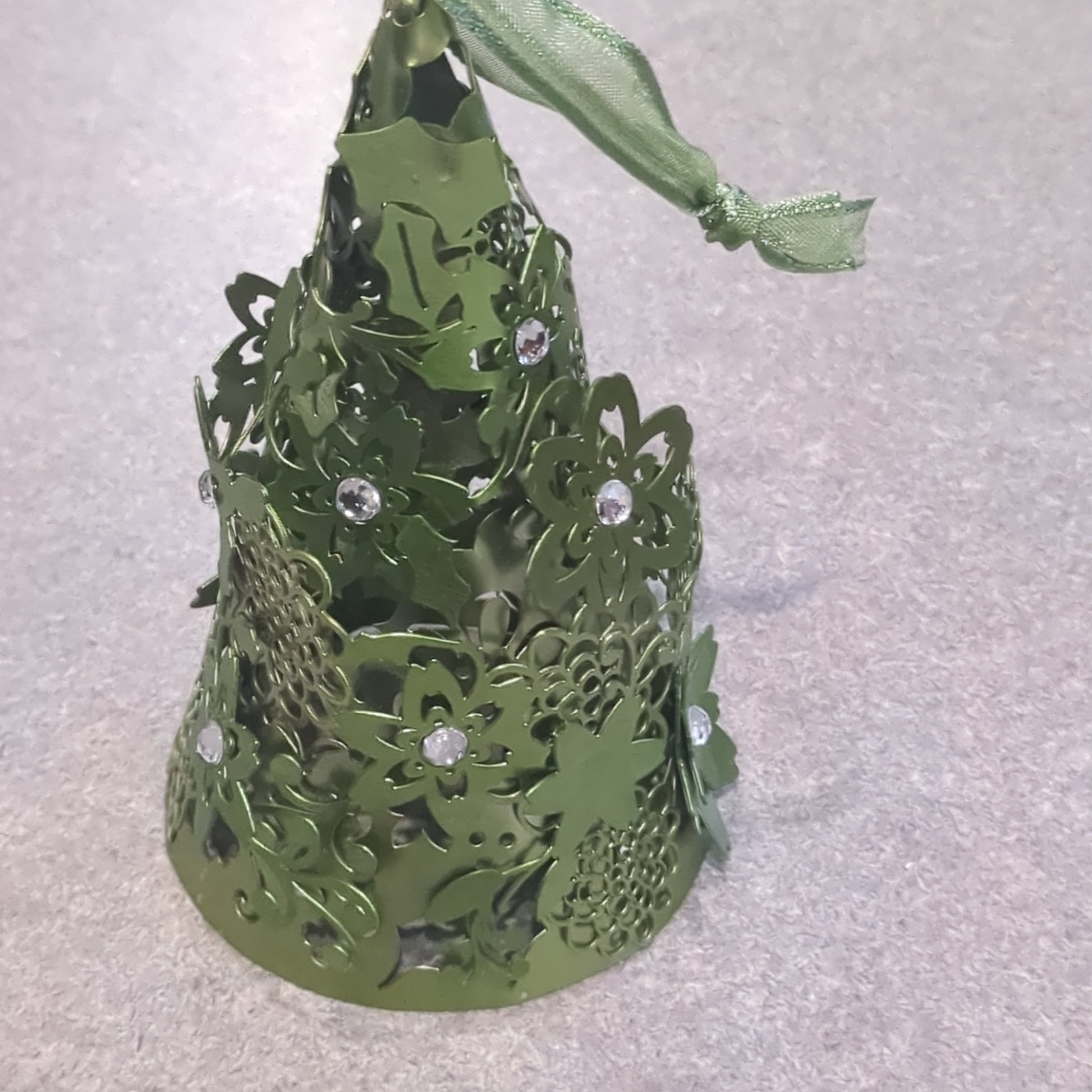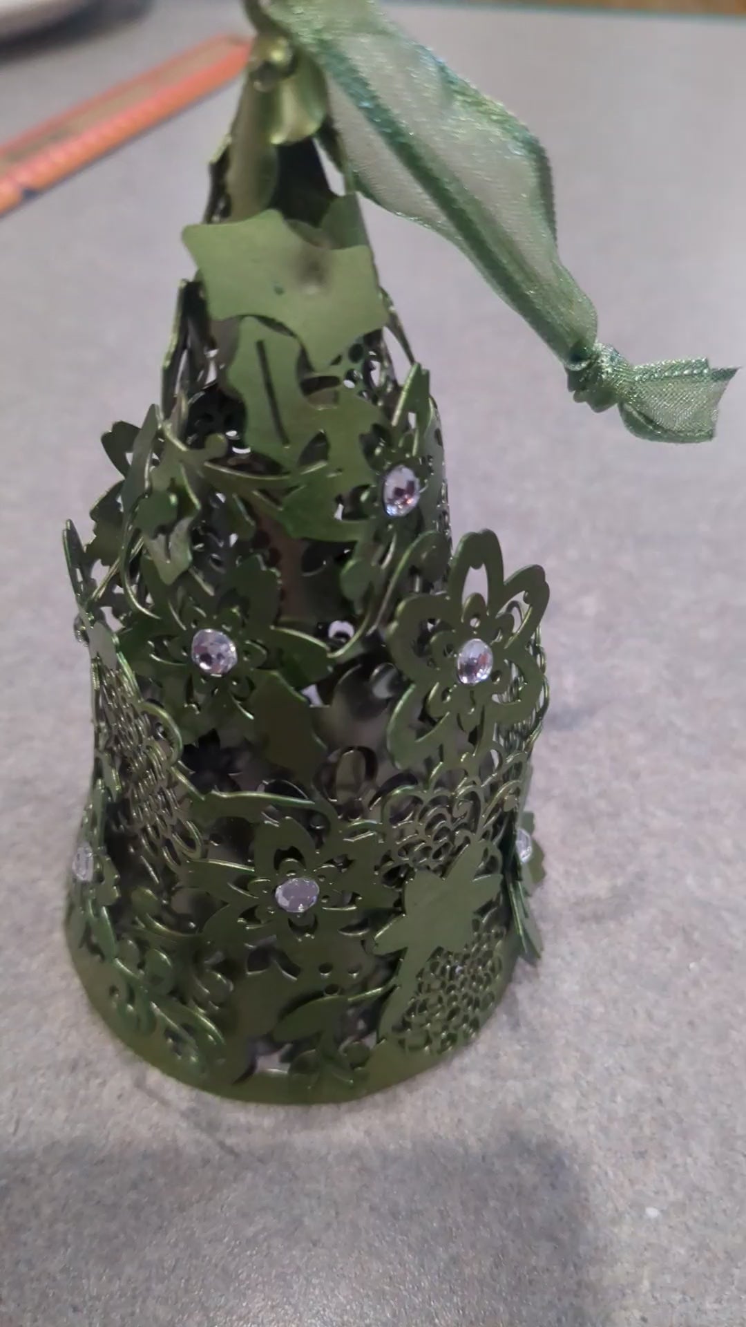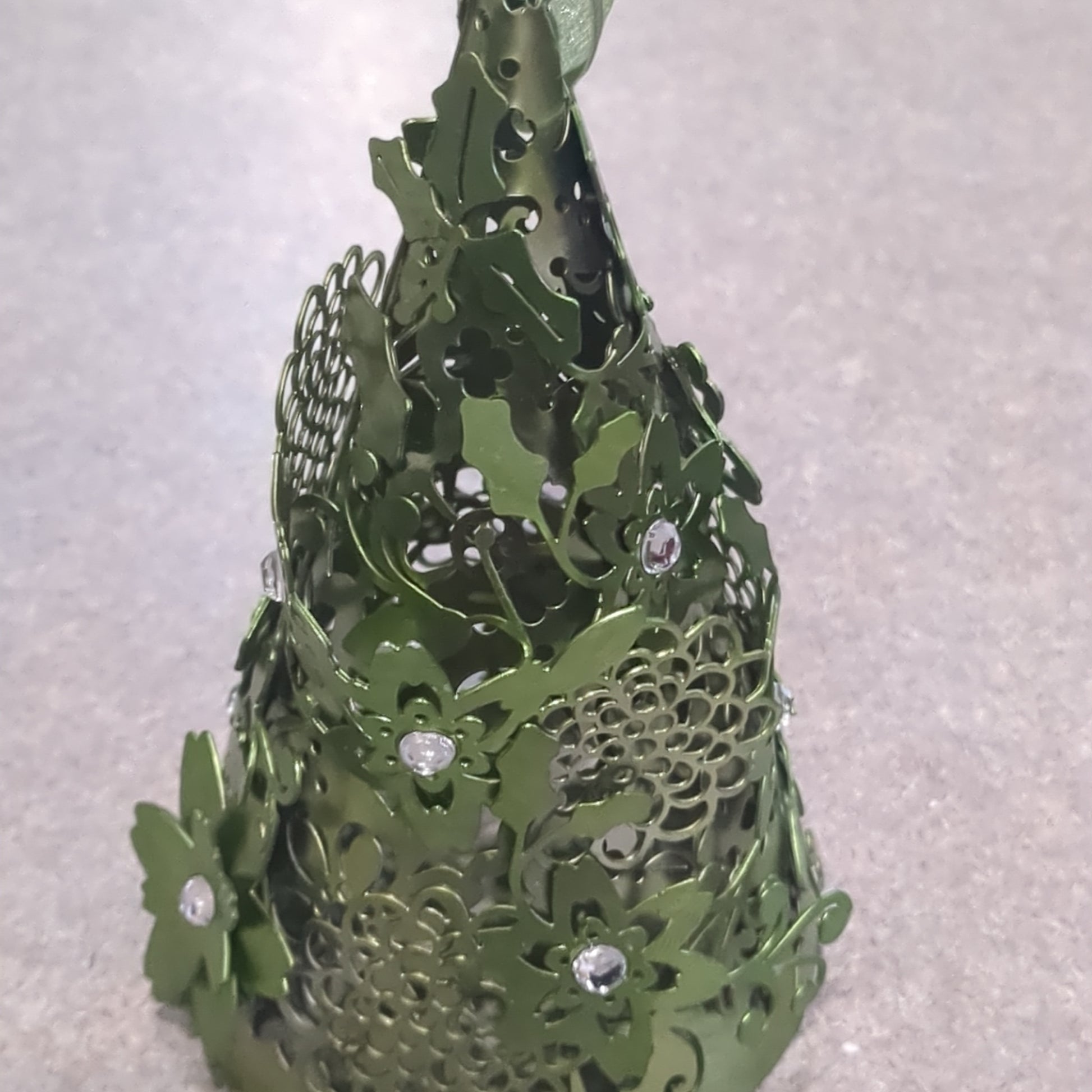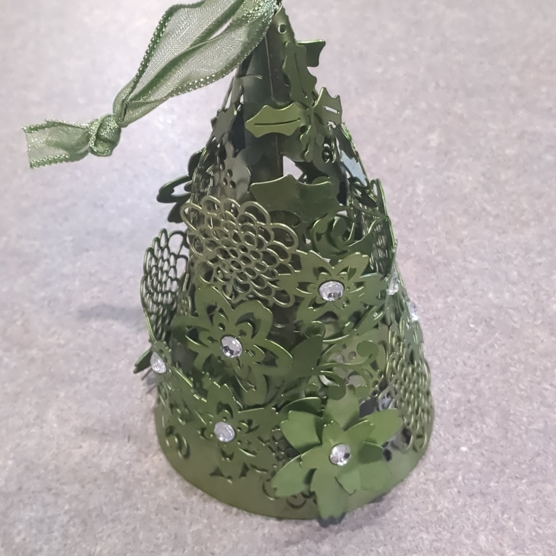 This is a little ornament made out of metal and plastic rhinestones very unique it's 4 and 1/2 in tall and 2 and 1/2 in in diameter