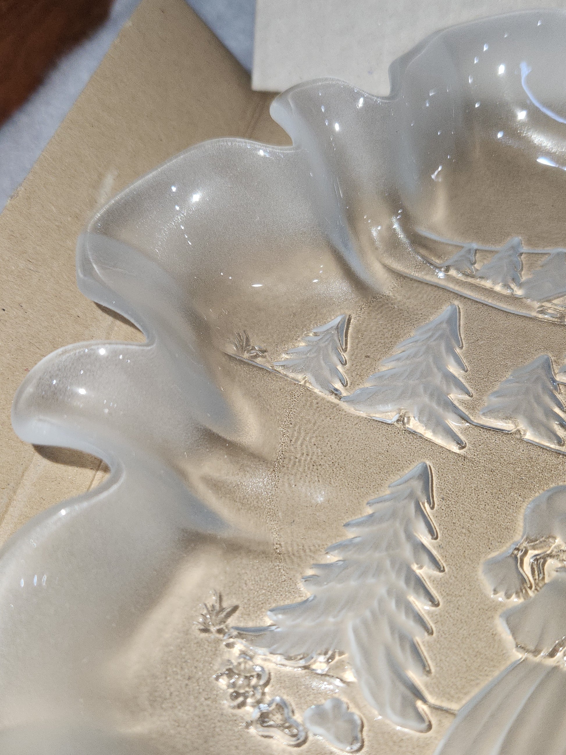 Mikasa Holiday Classics Round Crystal Platter. It is new in box with original sticker. In new condition. It is just under 10" diameter and 1 1/4" tall. It says Germany on the sticker. Please see photos as they are part of the description.