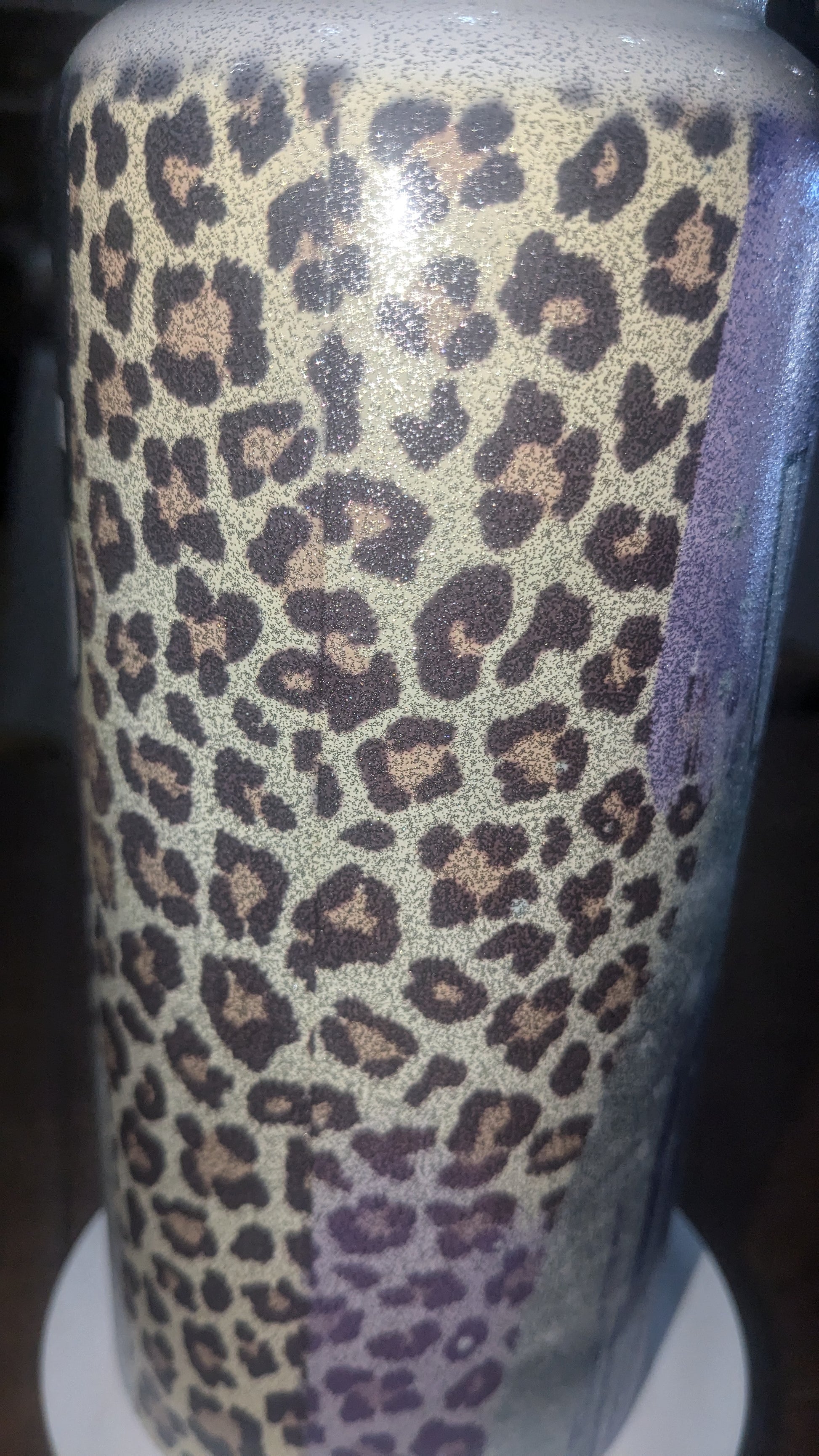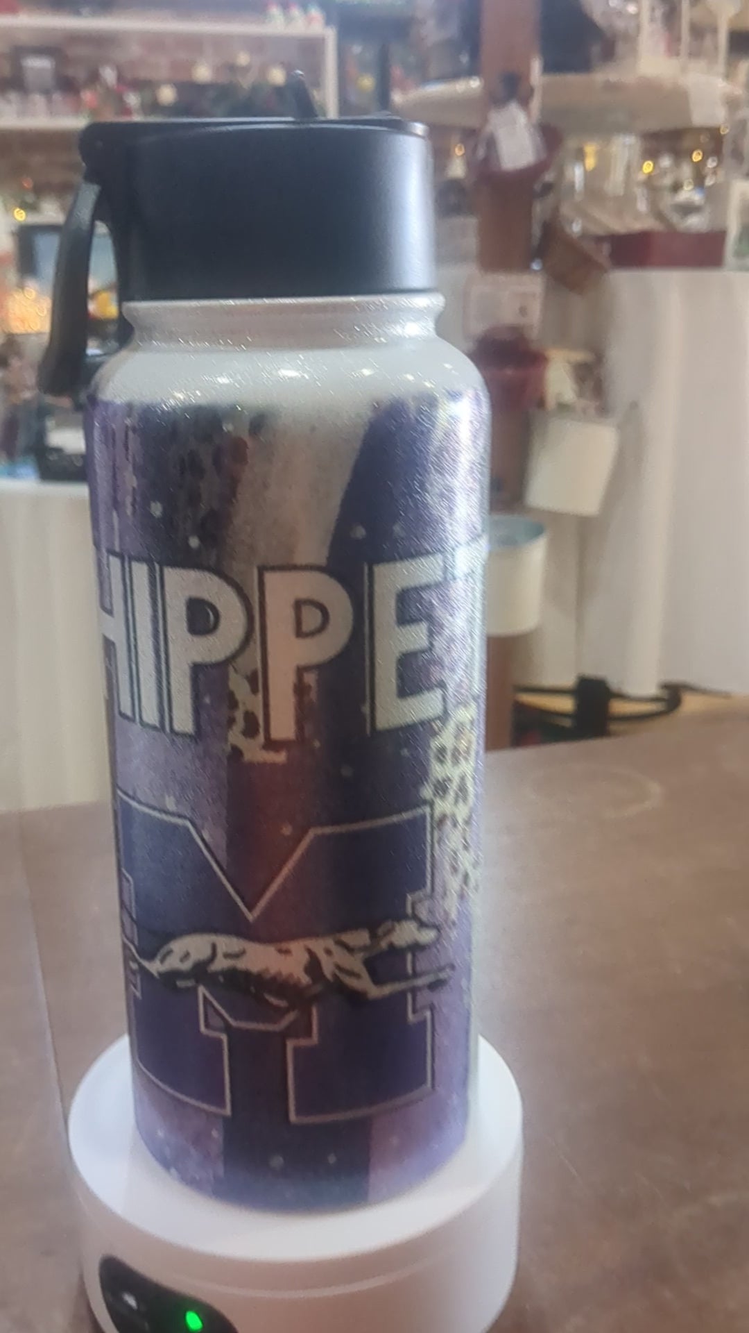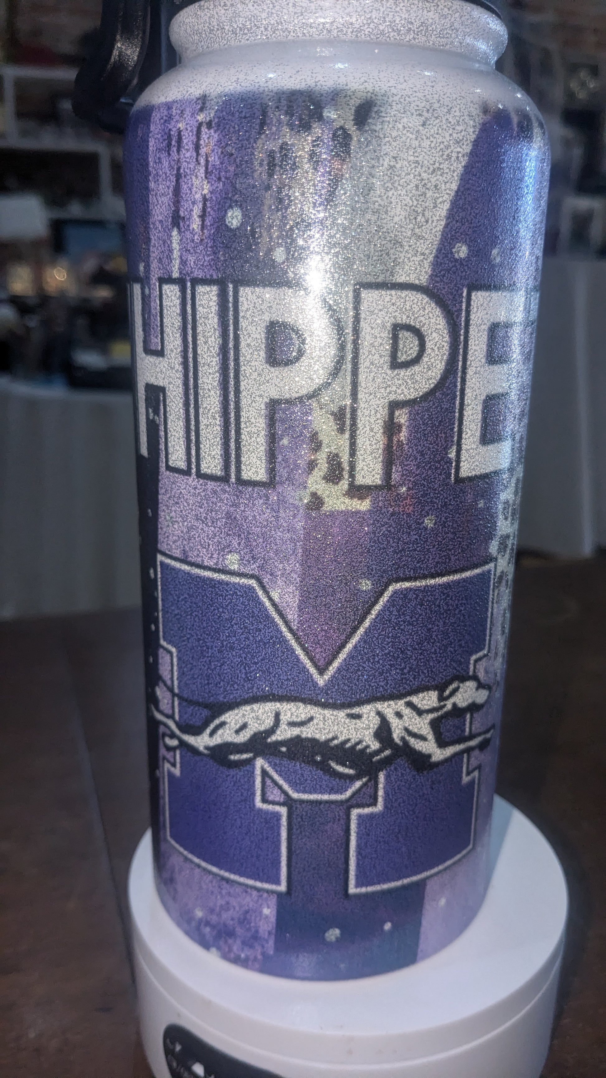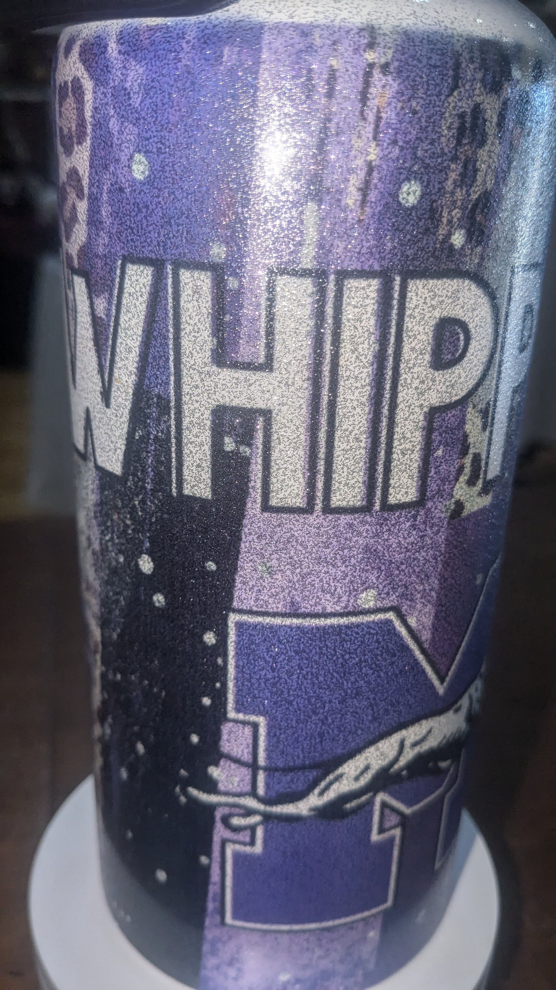 32 oz stainless steel insulated water bottle. It is a white glitter with the whippet name and logo and has some cheetah print purple black and white. We can custom make these with your school name etc.
