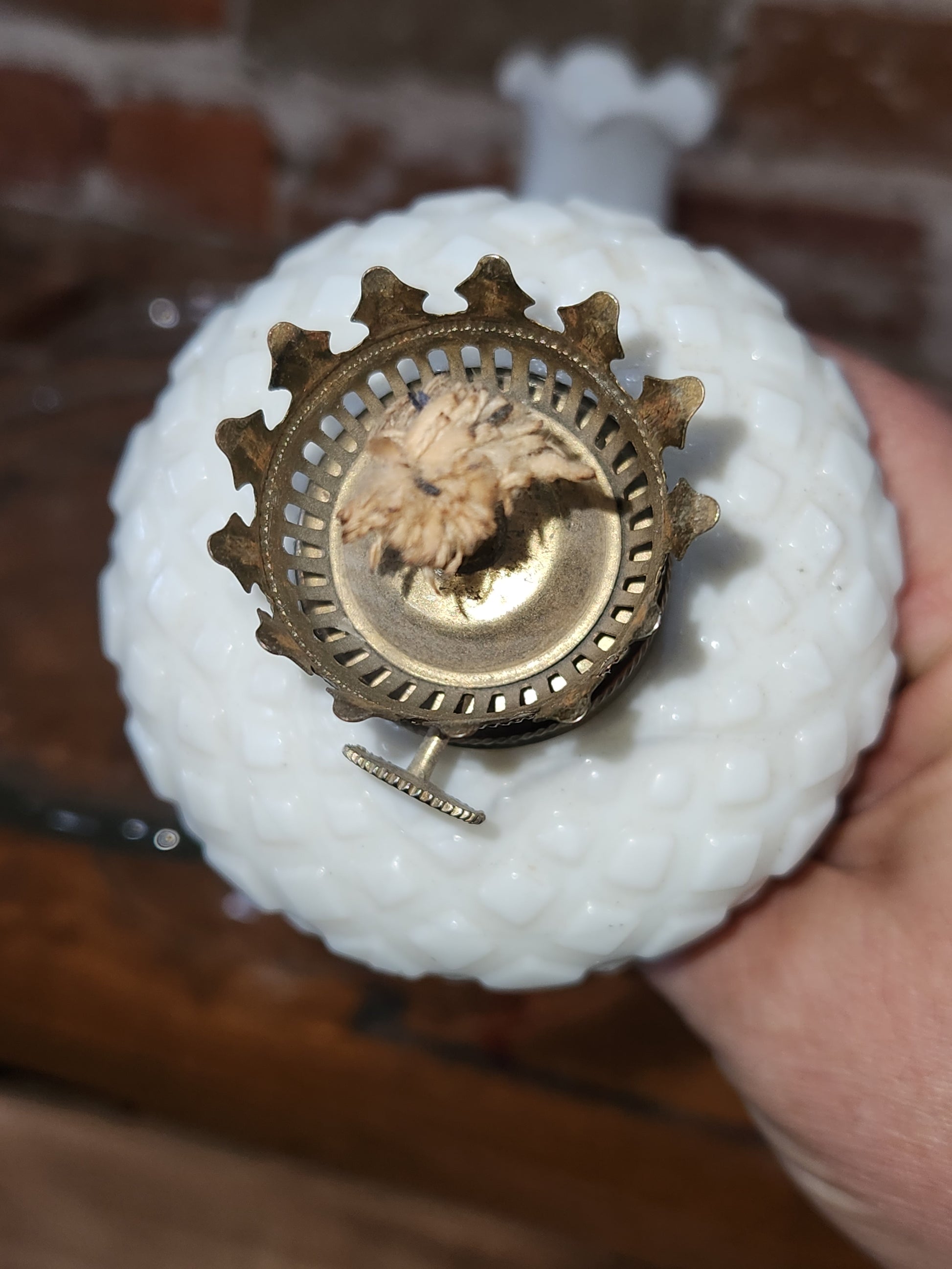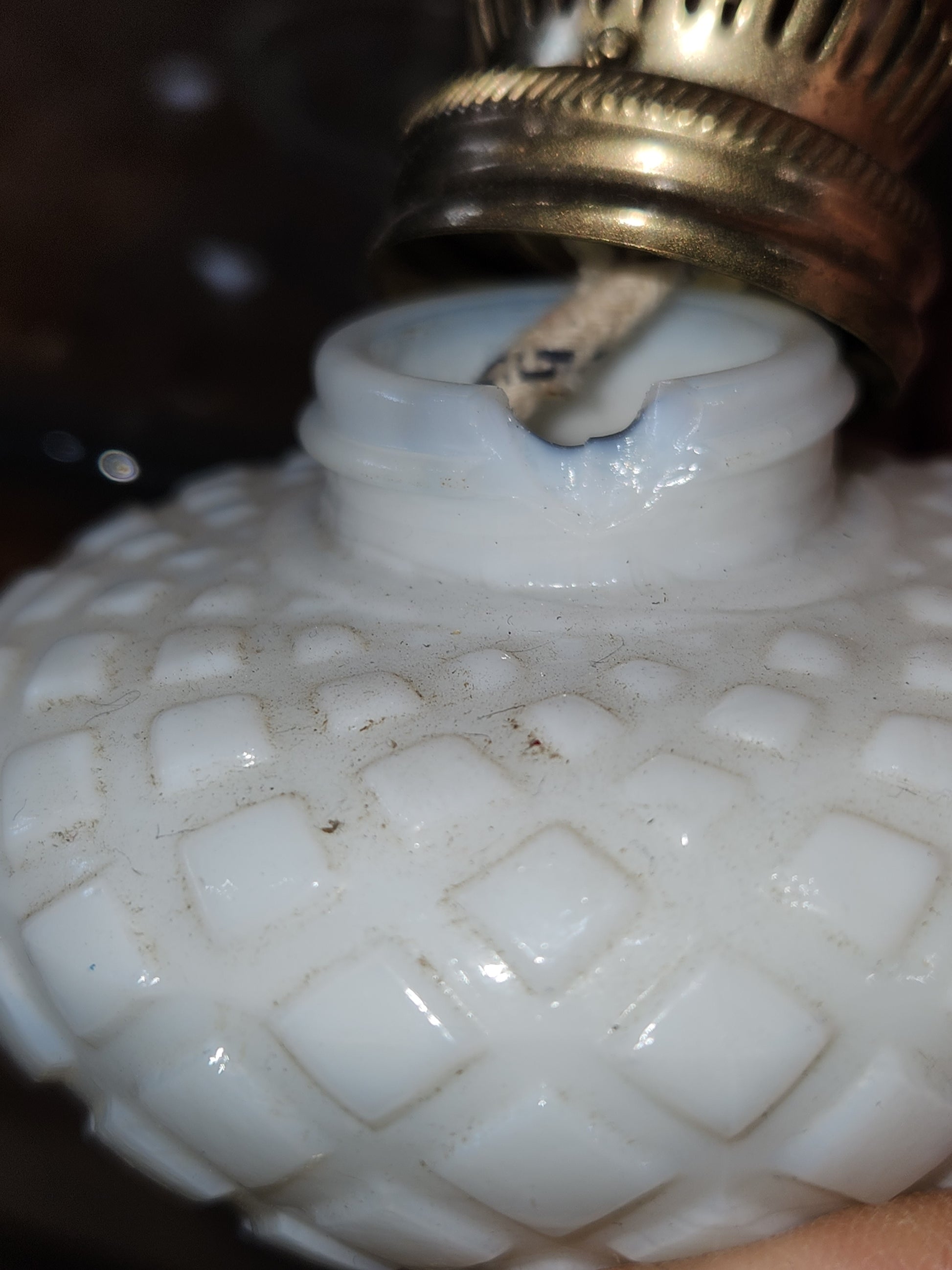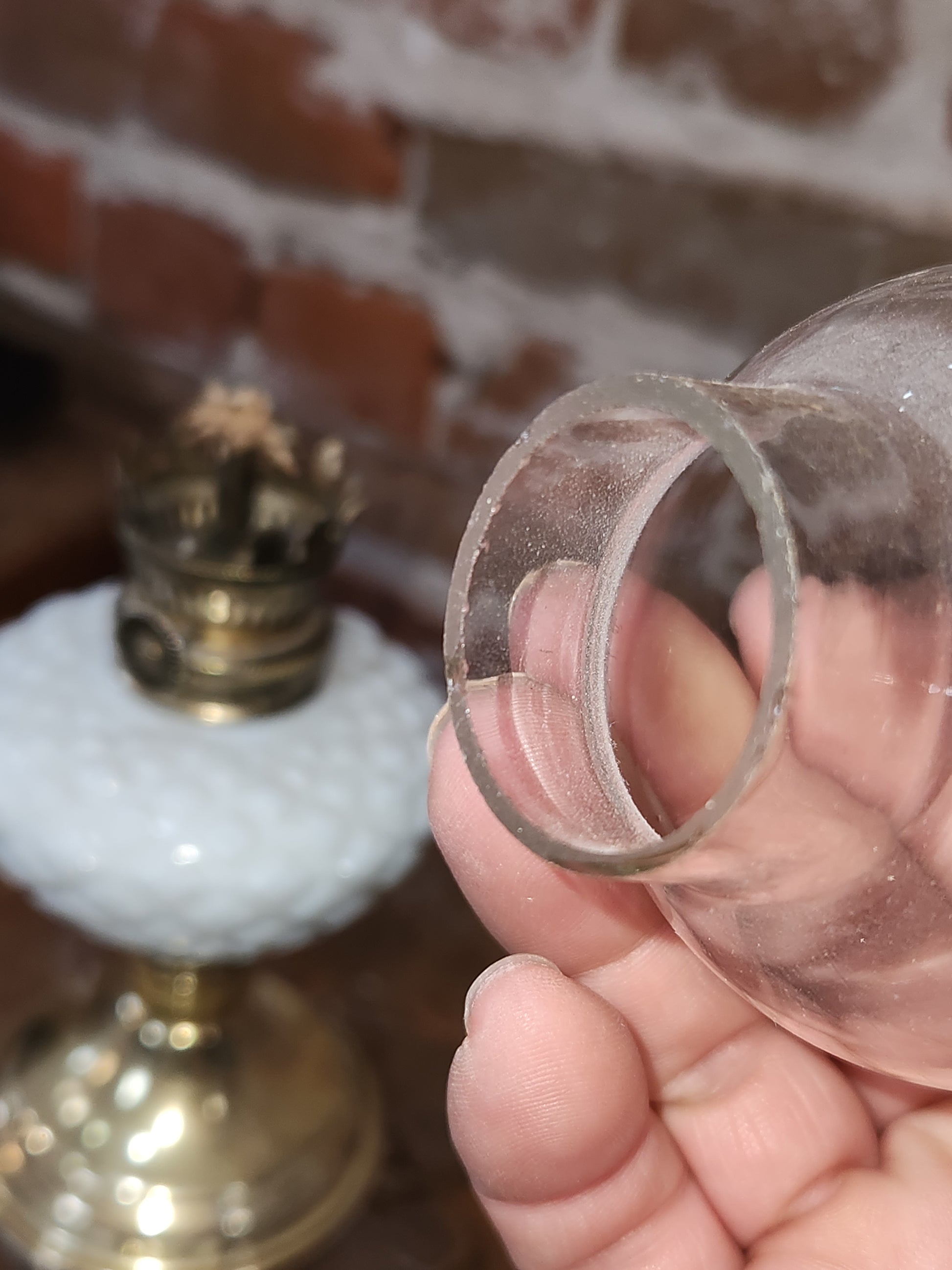 The Lamp measures approximately 9" Tall to the Top of the Globe x 2 7/8" in Diameter at the Widest Part of the Bowl x 3" in Diameter on the Bottom of the Base. The Lamp is in great condition, there are no chips, cracks, cracks except for a chip under the oil fitting. The chimney is in good condition except for a very minor chips at the bottom. It does say made in hong kong in the bottom